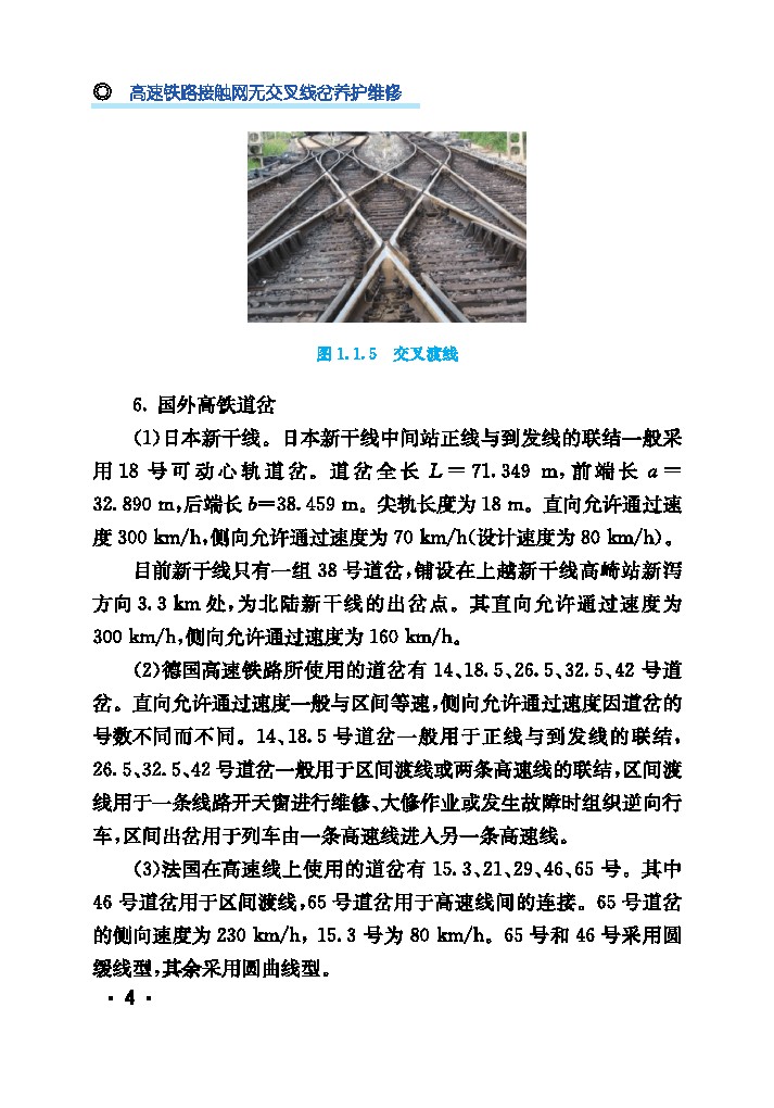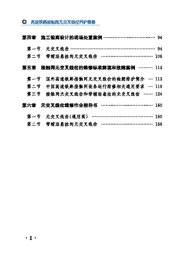 《高速铁路接触网无交叉线岔养护维修》系统地介绍了交叉线岔、无交叉线岔的发展概况、原理,介绍我国高速铁路接触网无交叉线岔不同设计方案并分析结构特点,对《高速铁路接触网运行维护规则》(TG/GD 108-2014)有关维护标准解读,通过典型故障案例强化对标准的理解,掌握维护重点。研究故障应急处置方案。最后将结合我国十年来高铁运行维护经验对高速铁路接触网无交叉线岔的设计和更好做好维护工作进行探讨,提出建议。