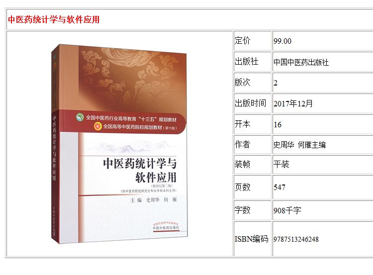 中医药统计学与软件应用 十三五规划教材 史周华 何雁主编 中国中医药出版社9787513246248