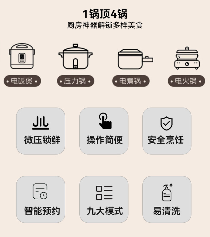 ①锅顶4个锅+锁鲜+一键式操作+自动断电+智能预约+不沾易清洗...... 九大功能,煮饭,火锅,煲汤.....统统一锅搞定,给厨房节省多少空间,关键给姐妹们省了多少钱,主要,好看还便宜,只要149! ! ! 必须全款拿下