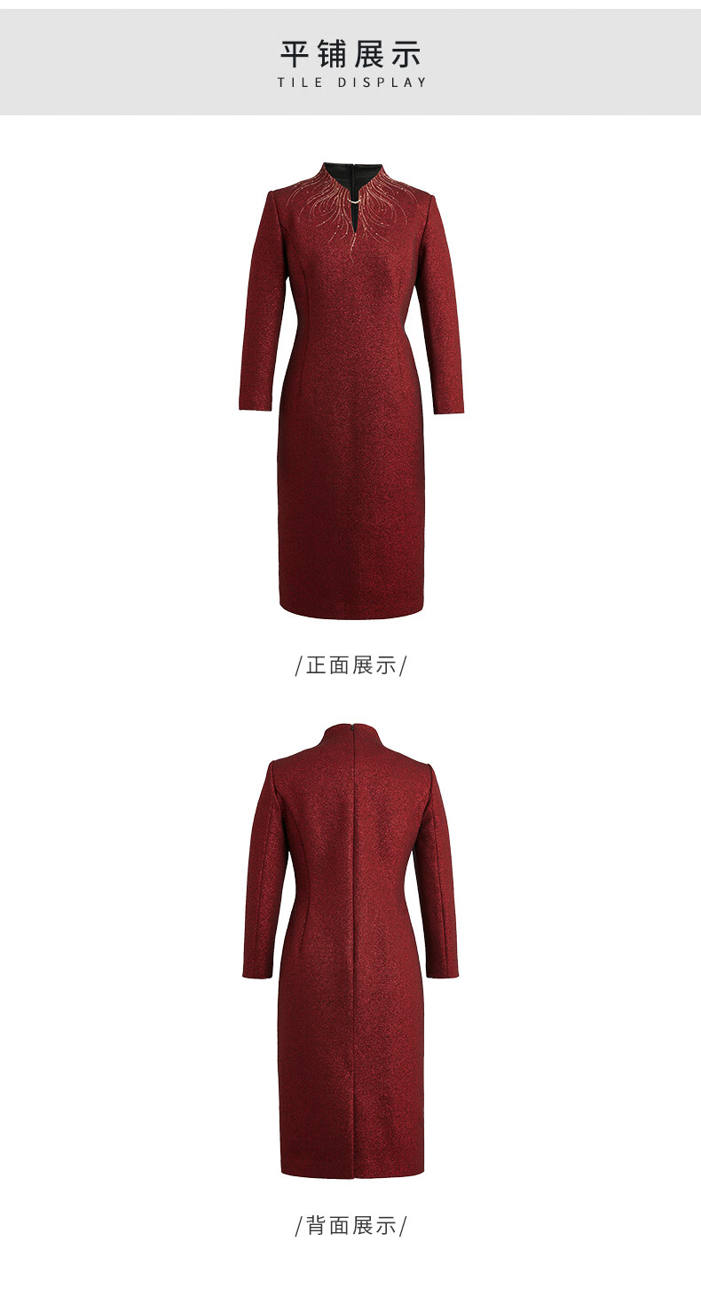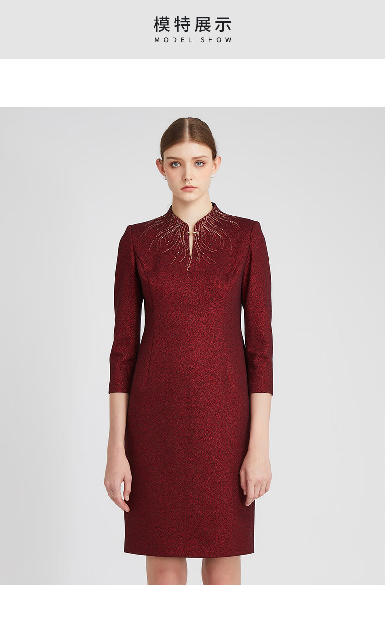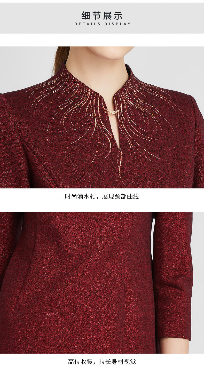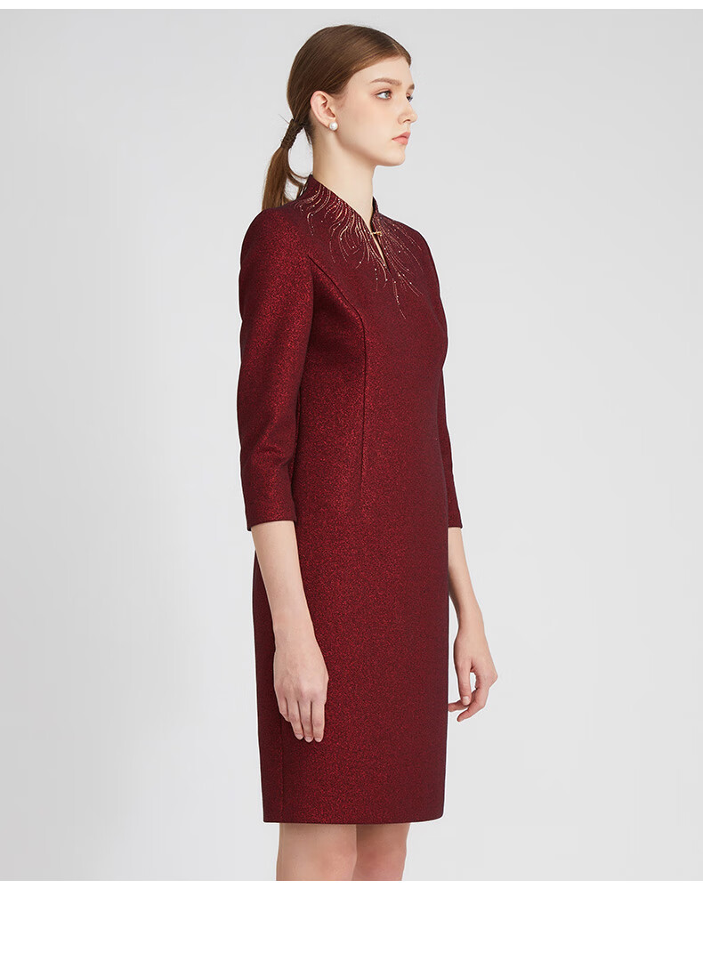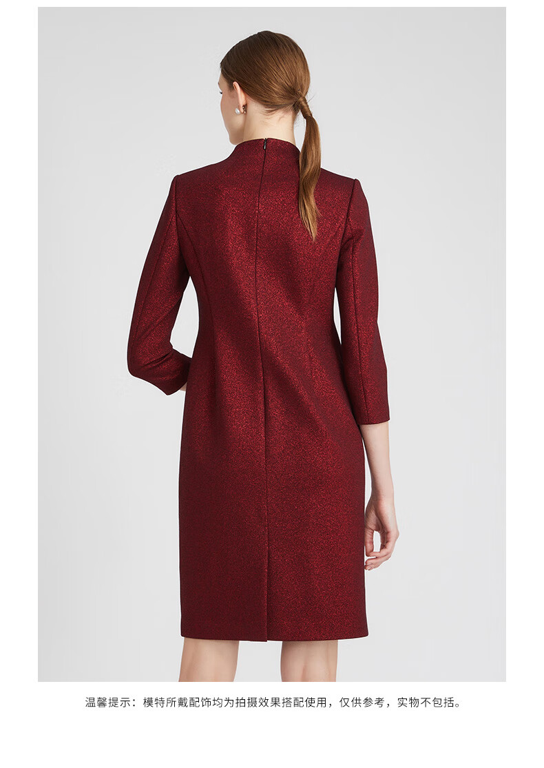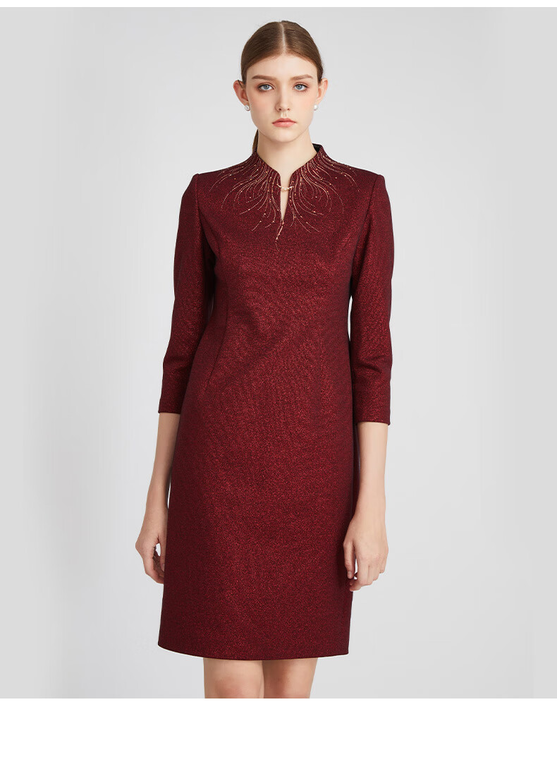 皮尔卡丹女装冬季新款酒红色小立领中长款连衣裙P2435E2850T0