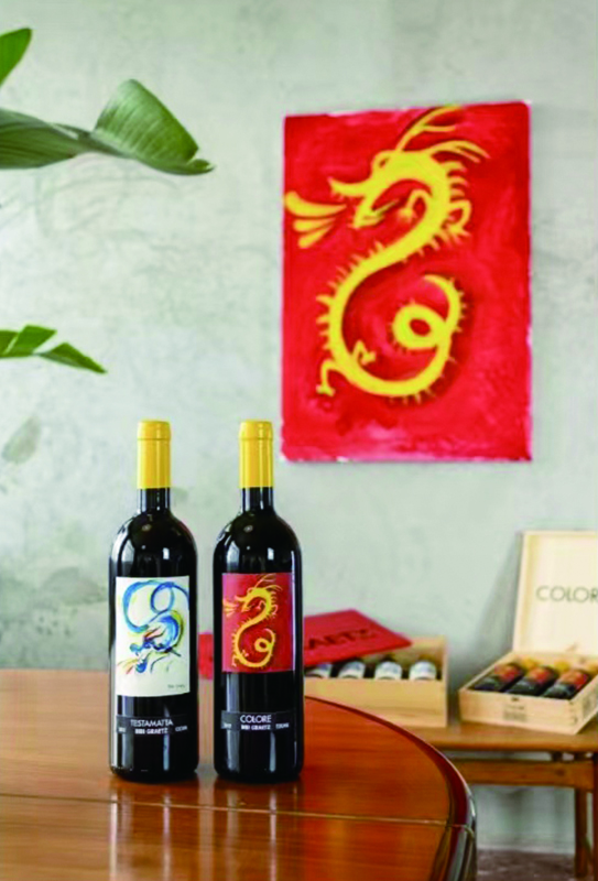 缤缤格拉兹充分研究,并开启想象力,将中国龙的威武庄严与缤缤 格拉兹充满艺术气质的酒庄风格结合,首次创作出了专为中国市场所制的龙年专属酒标。其中疯狂的大脑Testamatta酒标灵感来源宋代泼墨式的山水九龙图,加入了一丝纯真自由的想象;色彩Colore酒标灵感则取自战国片雕玉龙,以更饱满浓烈的色彩与酒体风格相呼应。
