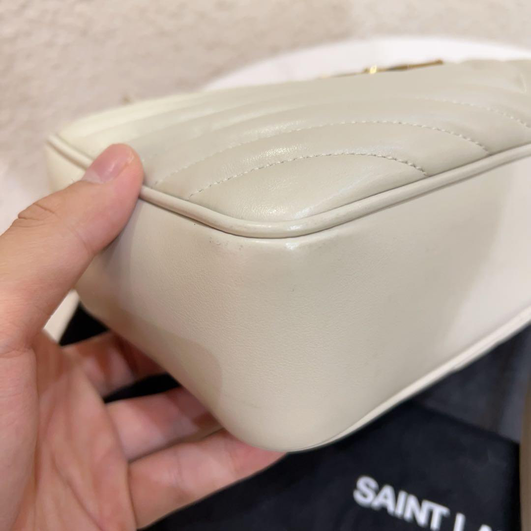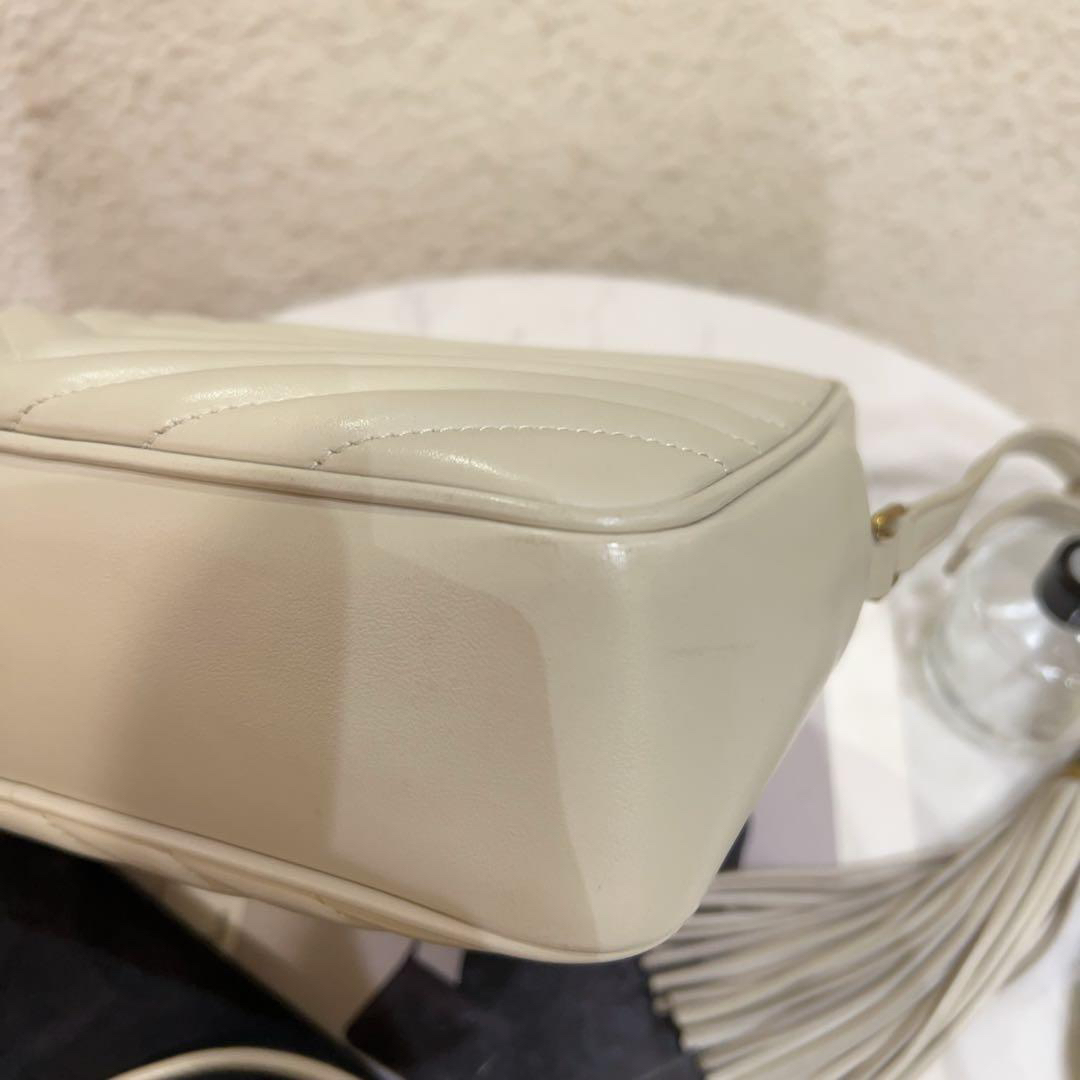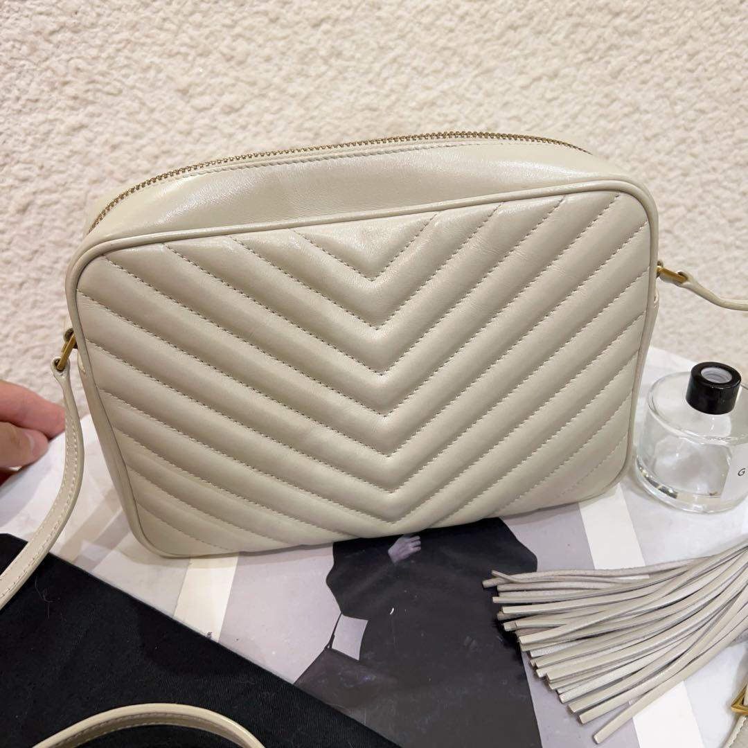 正品二手 YSL Lou 大号 白金 V纹 牛皮 流苏 相机包📷 95新 23*16 配件:防尘袋 边角轻微使用感。白色情人粉色花,一生一世我爱她