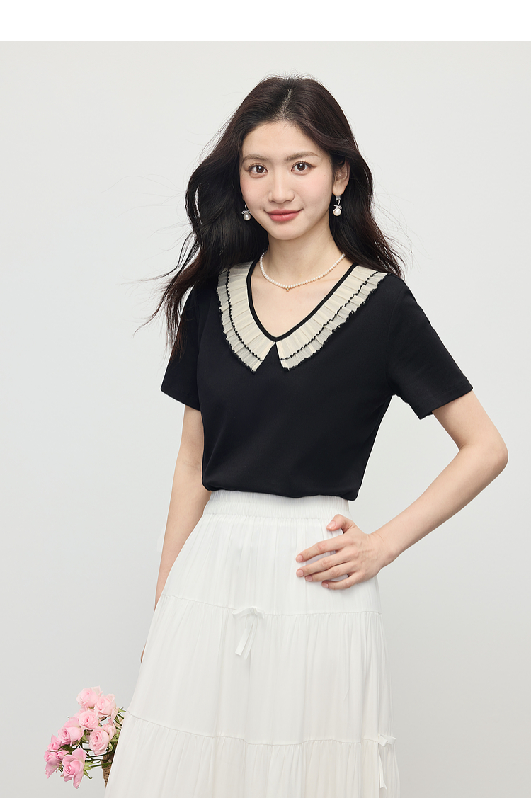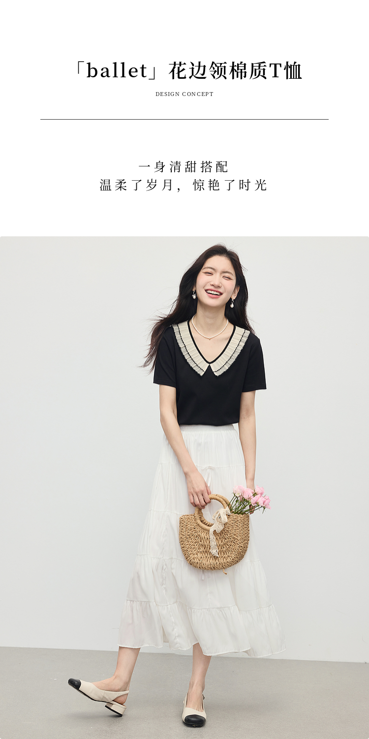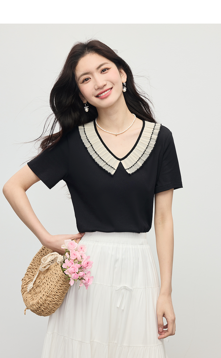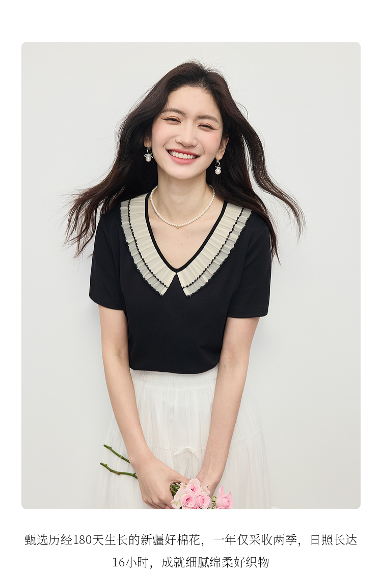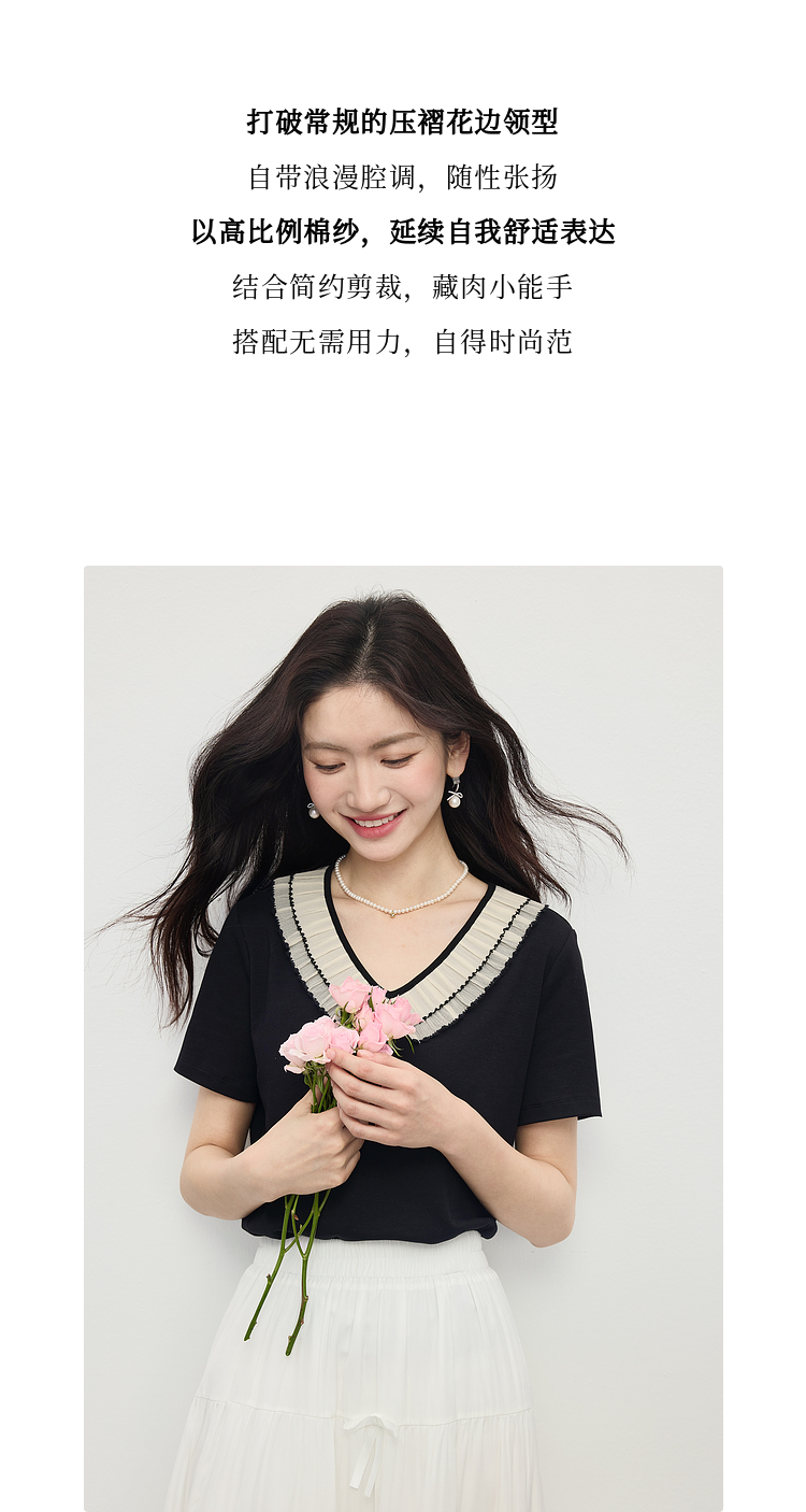 【周末秒杀】熙世界2025夏季新款法式田园风撞色花边V领T恤女短袖时尚减龄上衣