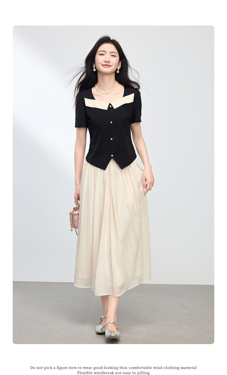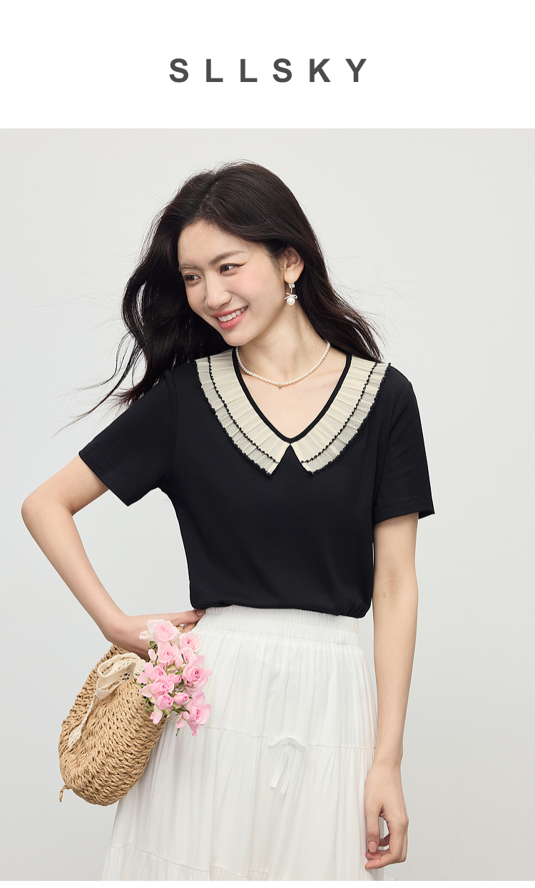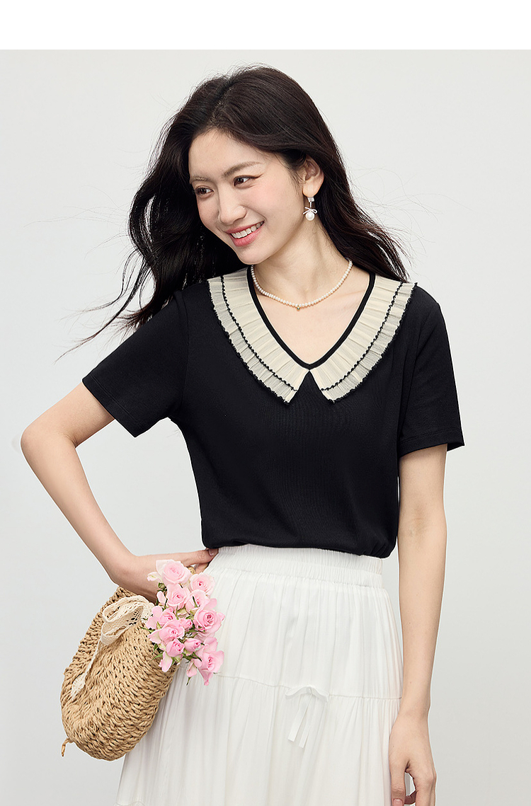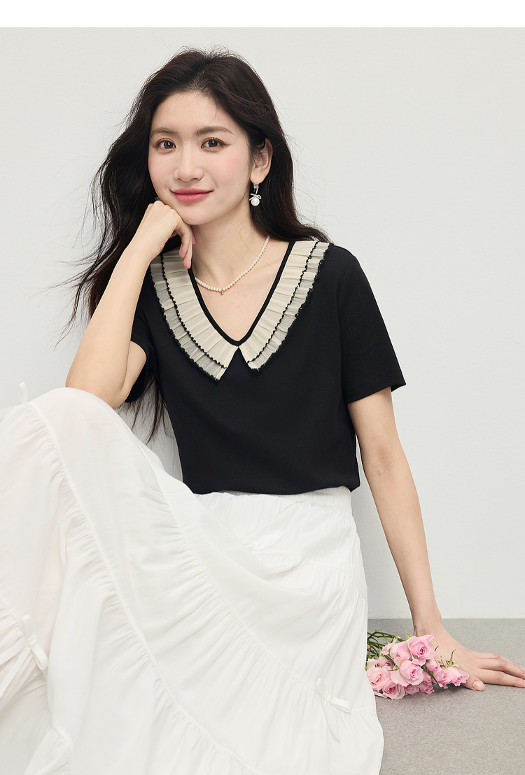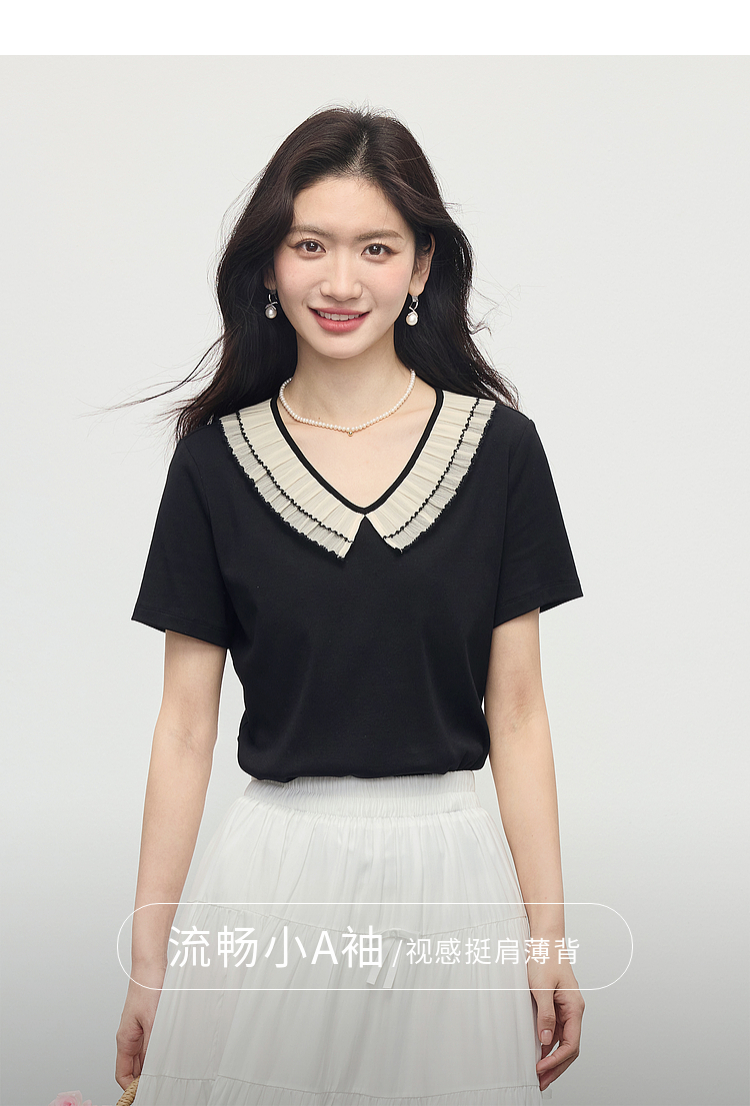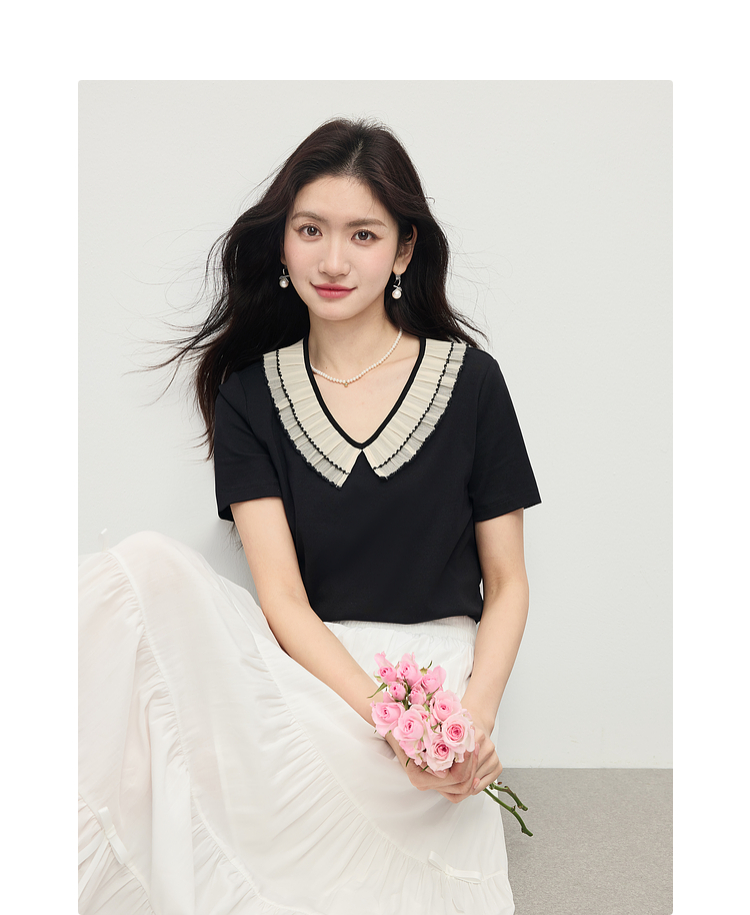 【周末秒杀】熙世界2025夏季新款法式田园风撞色花边V领T恤女短袖时尚减龄上衣