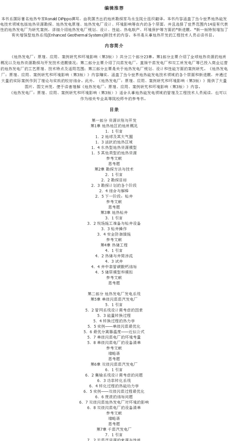 地热发电厂:原理、应用、案例研究和环境影响(第3版) [美]Ronald,DiPippo