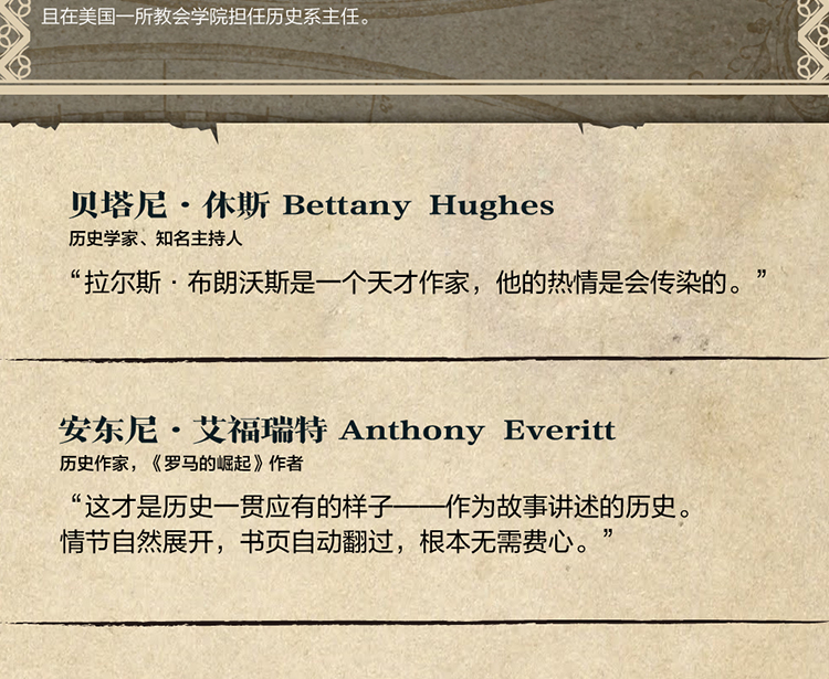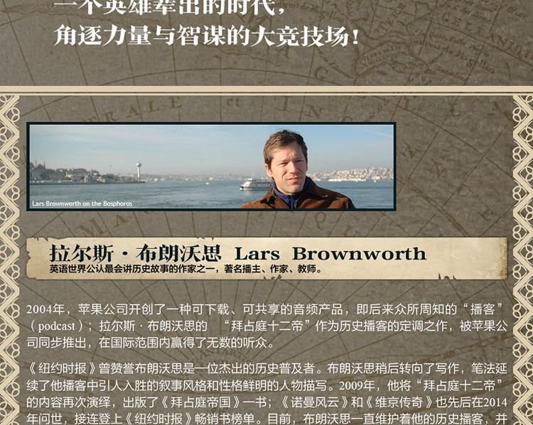 《纽约时报》赞誉布朗沃思是“一位杰出的历史普及作家”。他著有changxiao历史作品《诺曼风云:从蛮族到王族的三个世纪》《维京传奇:来自海上的战狼》和《拜占庭帝国:拯救西方文明的东罗马千年史》。书中的笔法延续了他播客中引人入胜的叙事风格和性格鲜明的人物描写,曾登上《纽约时报》changxiao书榜单。