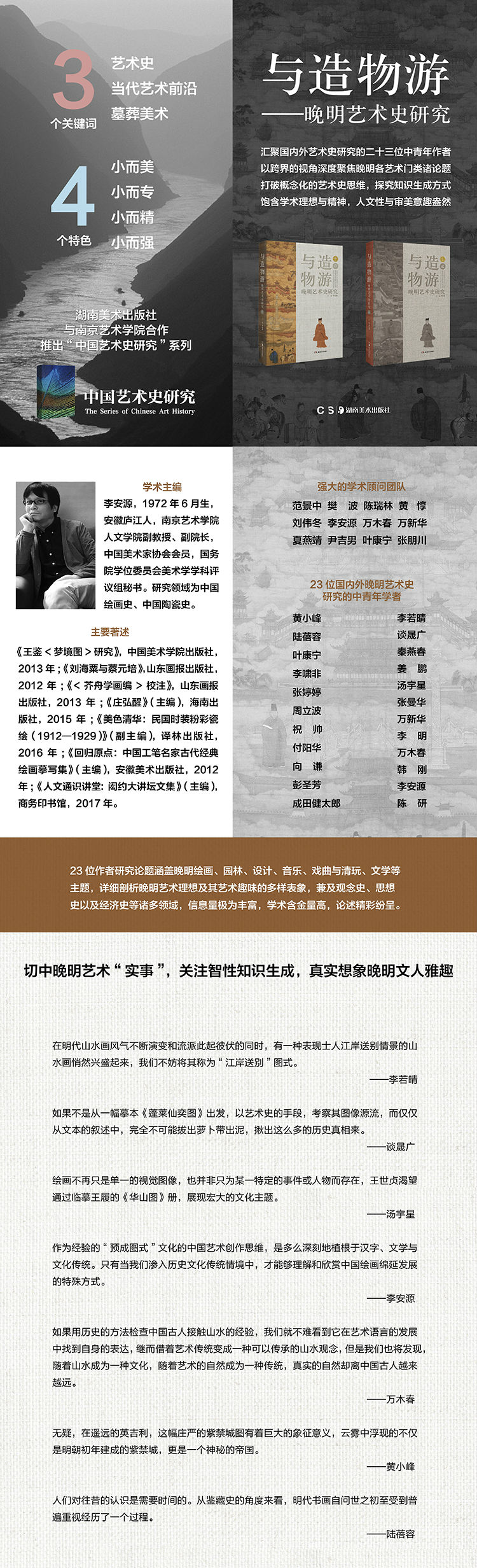 晚明艺术史研究,集国内外艺术史研究中坚力量,以跨界视角,深度聚焦传统绘画、园林、设计、音乐、戏曲与清玩等主题,兼及观念史、思想史以及经济史等诸多领域,拓展人文视野,打破概念化的艺术史思维,饱含学术精神,文人审美意趣盎然。