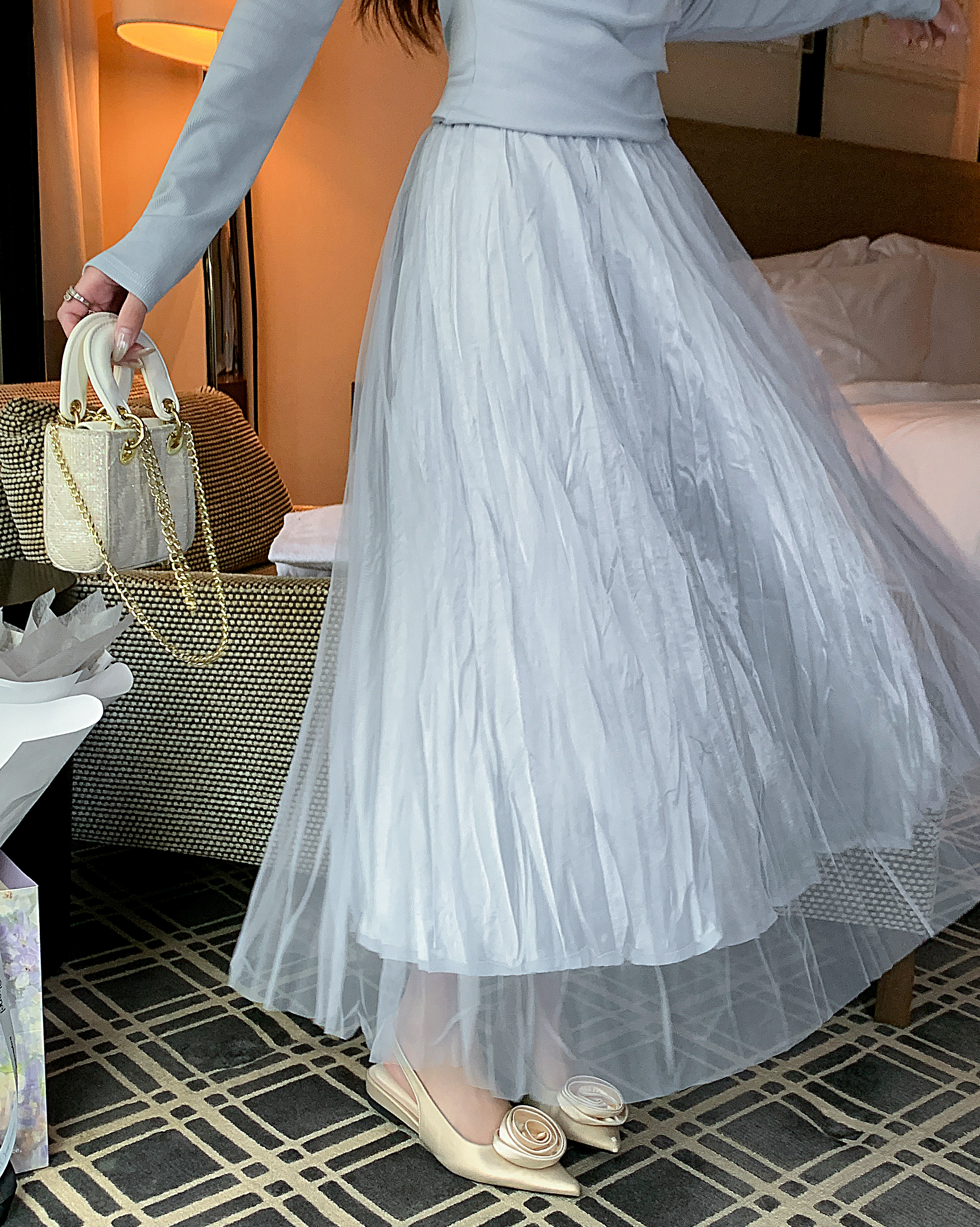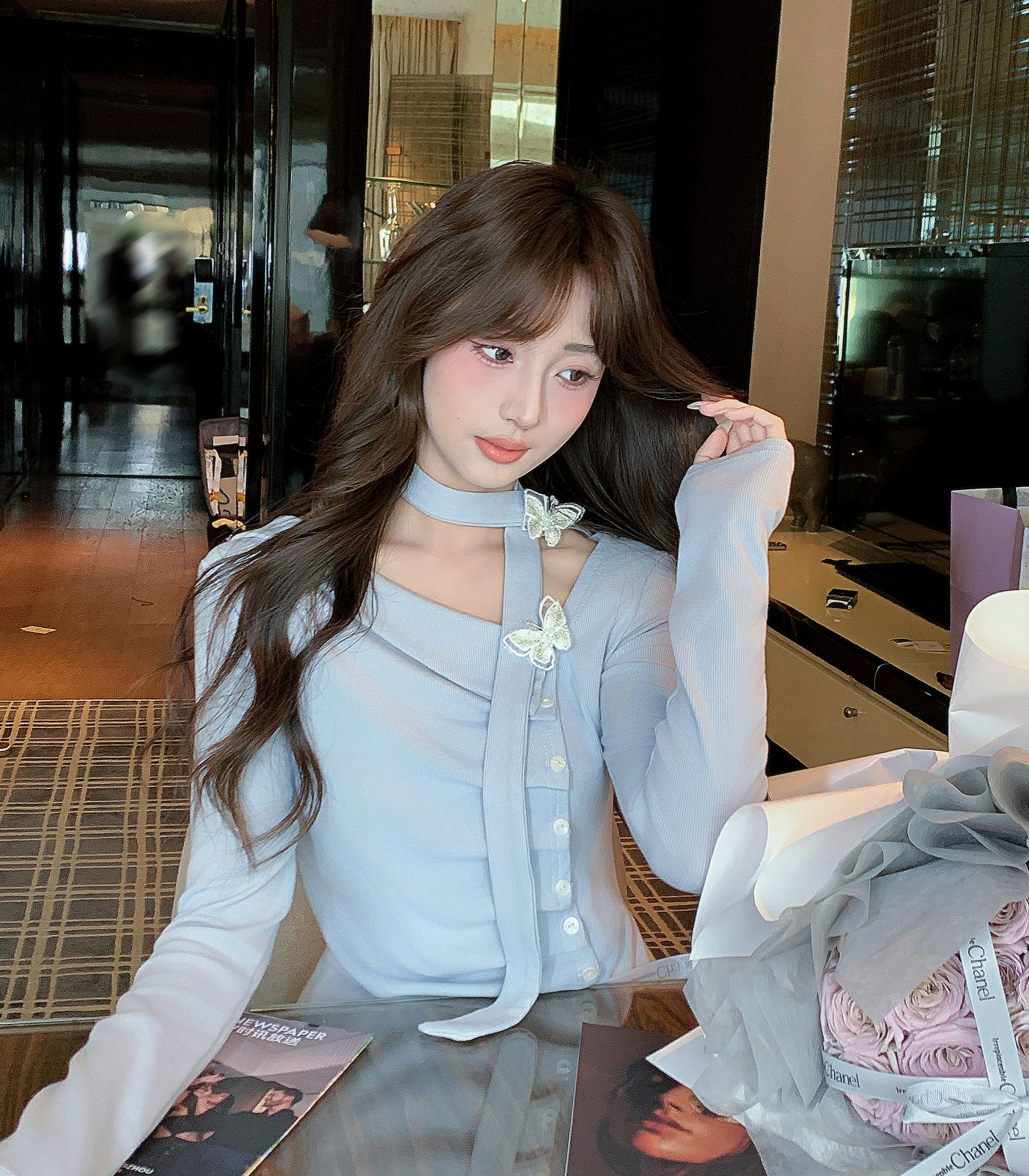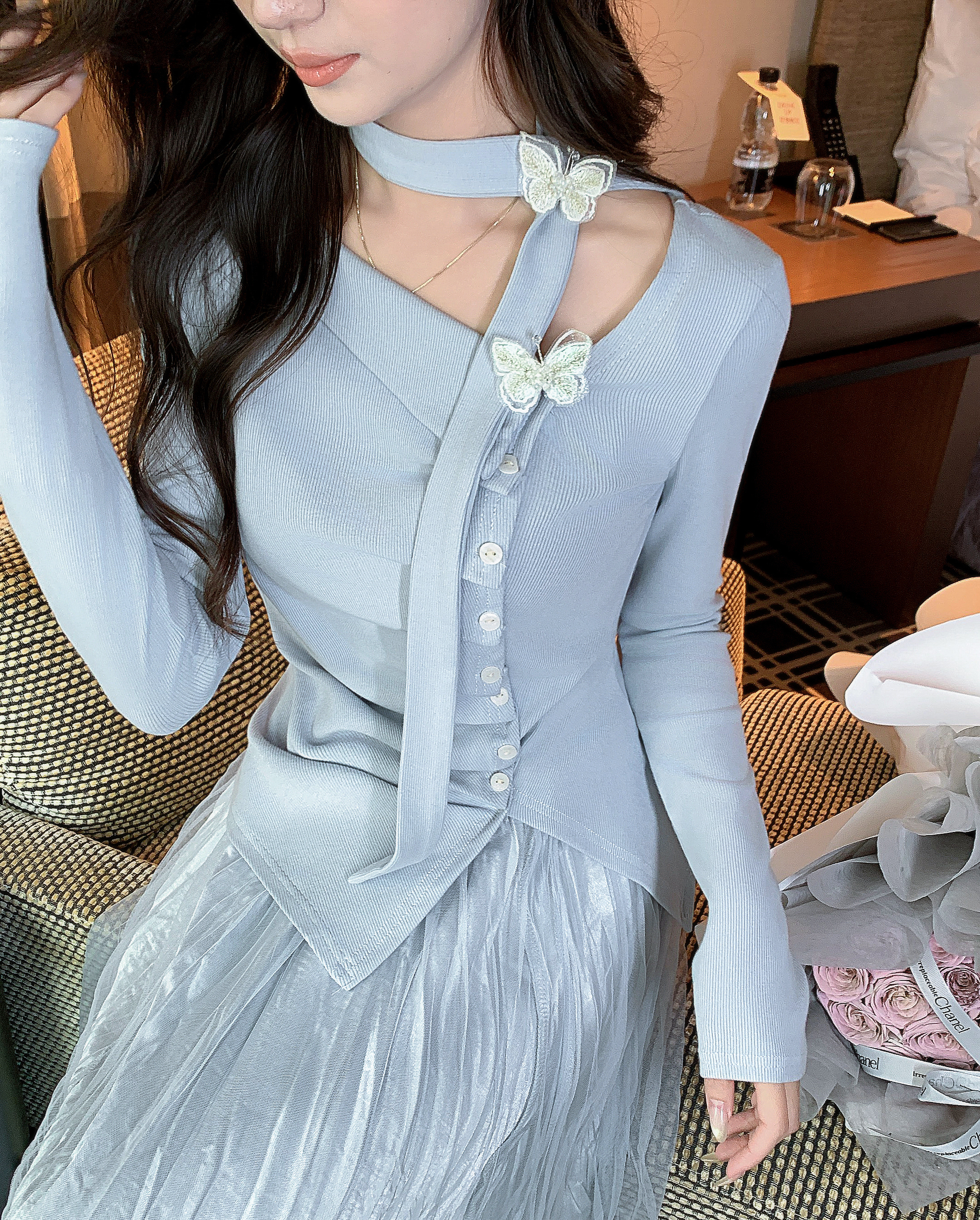 张心子【星夜微醺】纯欲设计感斜颈长袖上衣女春季褶皱显瘦打底衫 U2602050