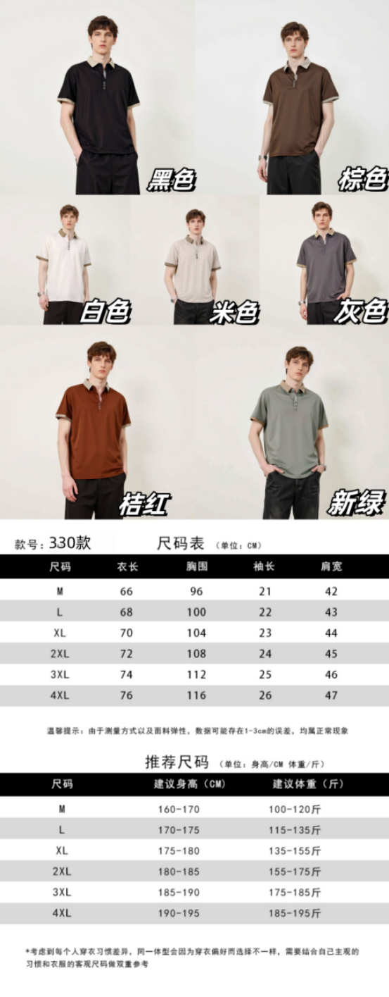 ✅第3️⃣款:撞色POLO衫330款 颜色:白色、米色、棕色、新绿、黑色、桔红、灰色 面料:96.6%聚酯纤维+3.4%氨纶 尺码:M-4XL 夏日清爽🌞冰感短袖T恤 清爽不油腻全靠它 个性撞色衣领+袖口,简约而独特 修身版型,显瘦又百搭