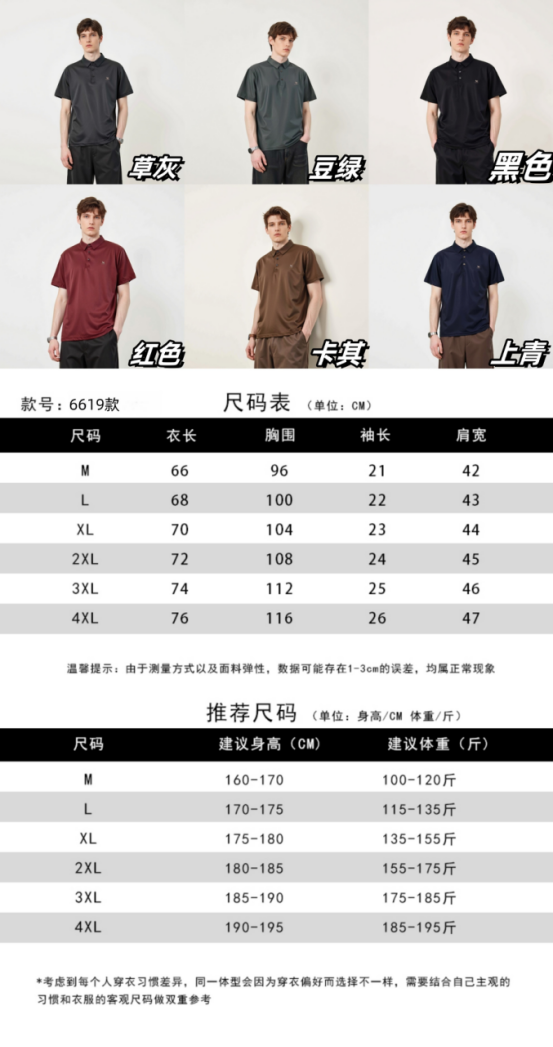✅第2️⃣款:纯色POLO衫6619款 颜色:草灰、豆绿、红色、上青、卡其、黑色 面料:96.6%聚酯纤维+3.4%氨纶 尺码:M-4XL 基础款就属耐看又不会挑人穿 这款纯色系大方干净 夏季通勤穿搭直接抄作业 胸前品牌logo刺绣,太戳细节控了 直筒微喇的版型,遮肉显瘦
