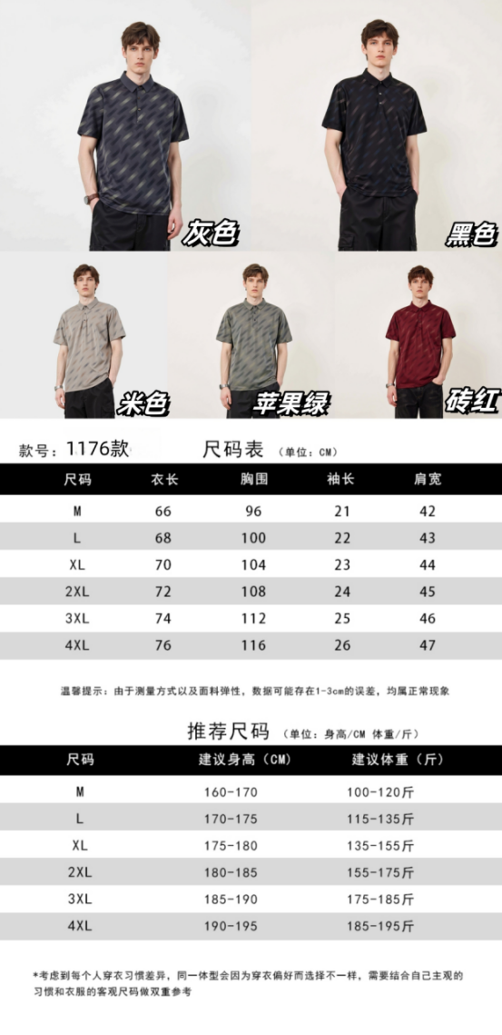 ✅第1️⃣款:斜纹POLO衫1176款 颜色:黑色、米色、灰色、砖红、苹果绿 面料:96.6%聚酯纤维+3.4%氨纶 尺码:M-4XL 面料自带花纹 老钱风自带清冷感 中和了polo衫的轻商务属性