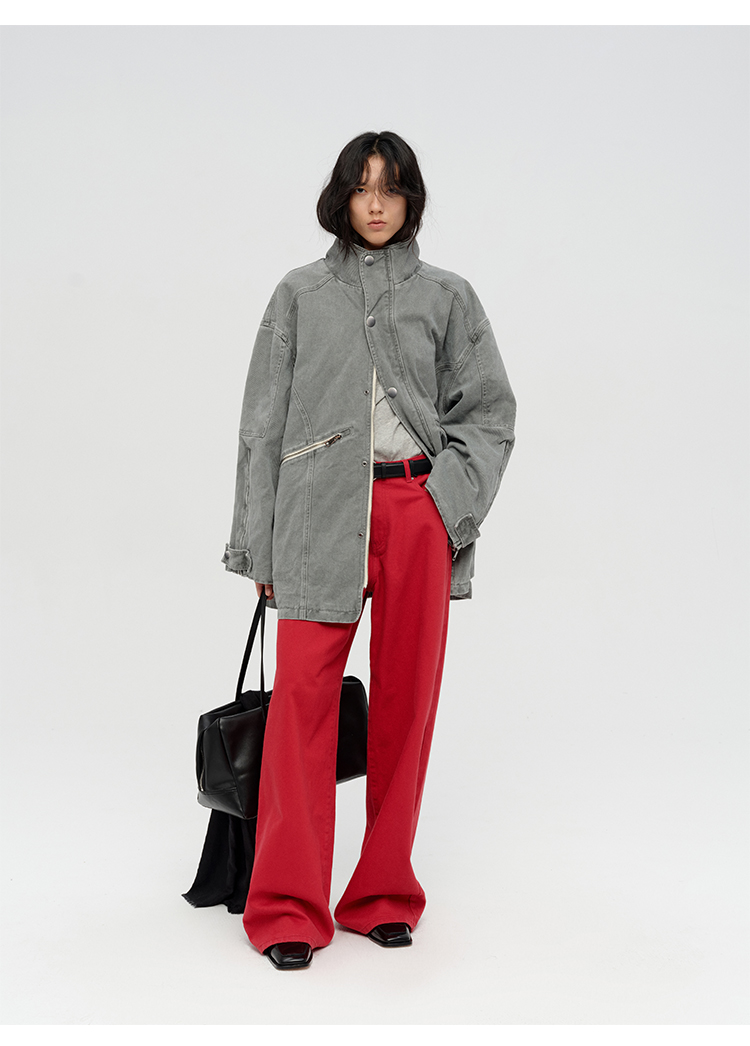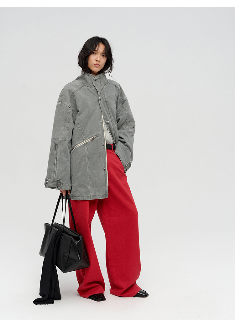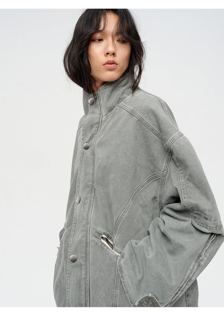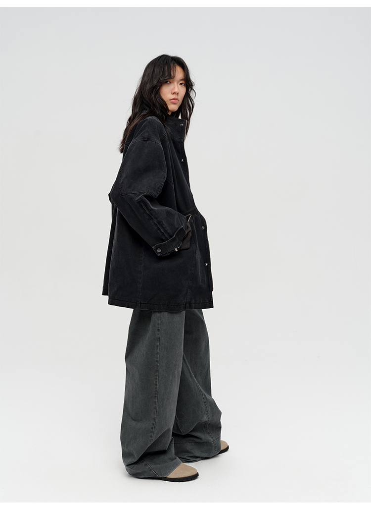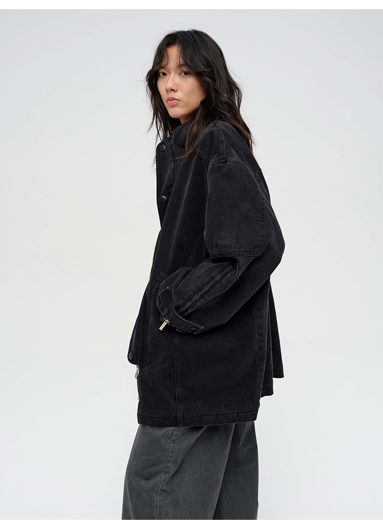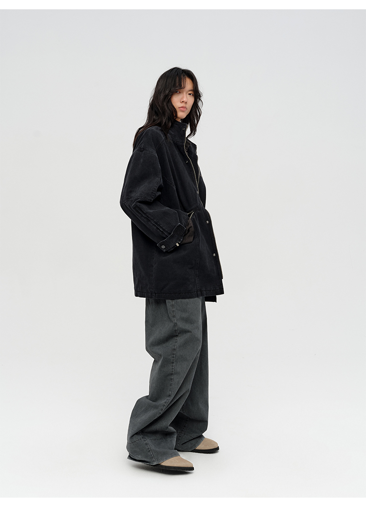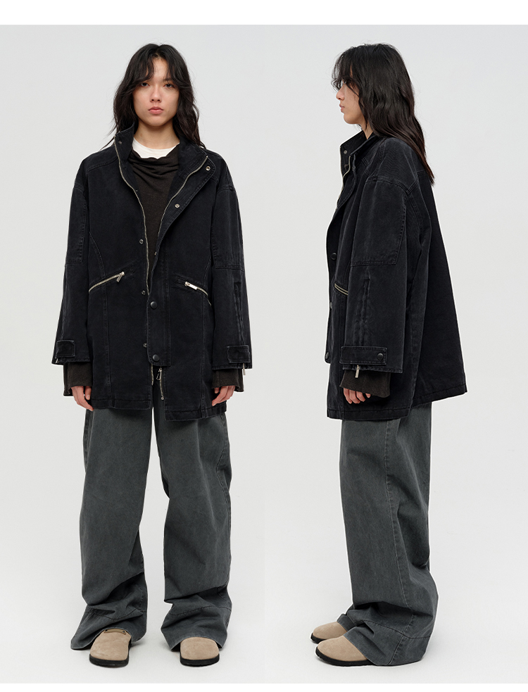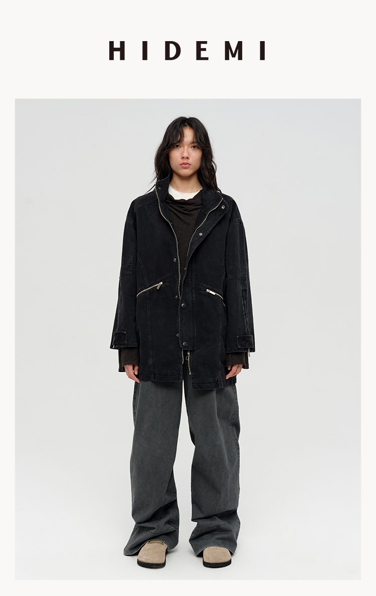 HIDEMI 多重水洗复古牛仔拉链立领式大口袋飞行员中长款大廓形夹克外套 水洗灰/碳黑色