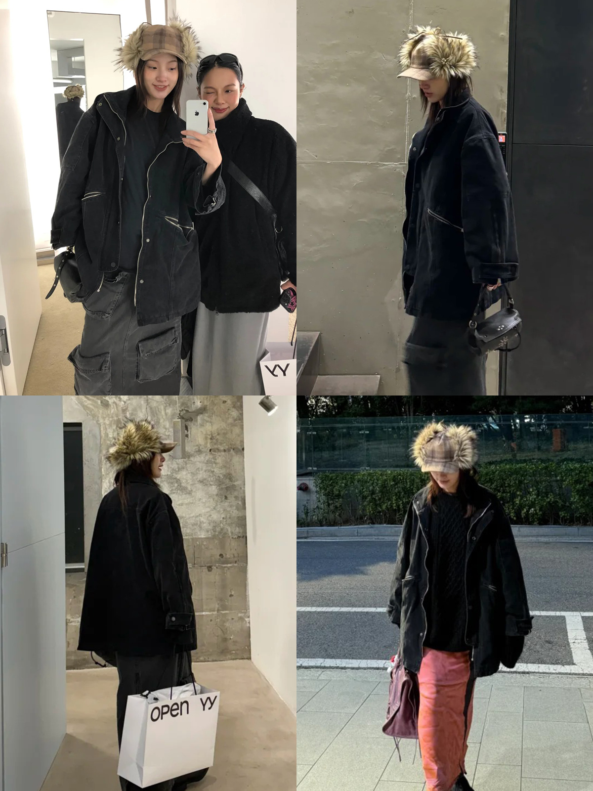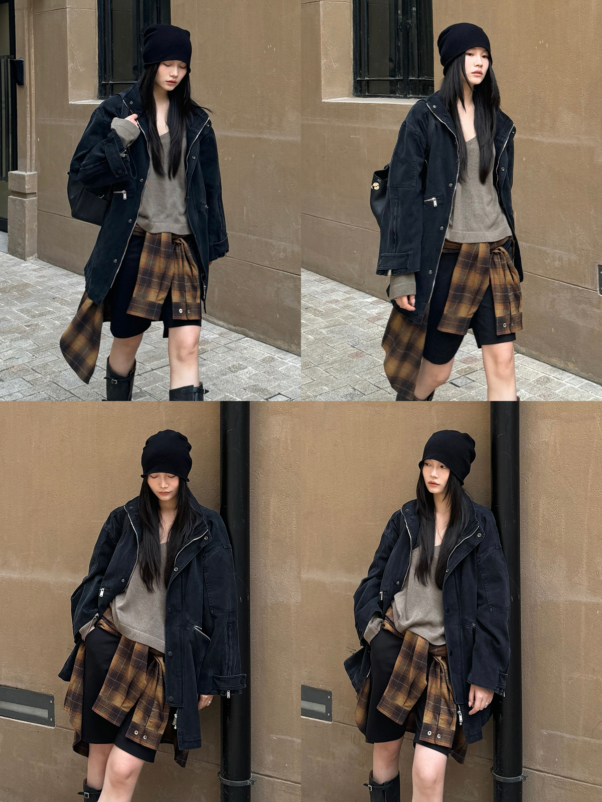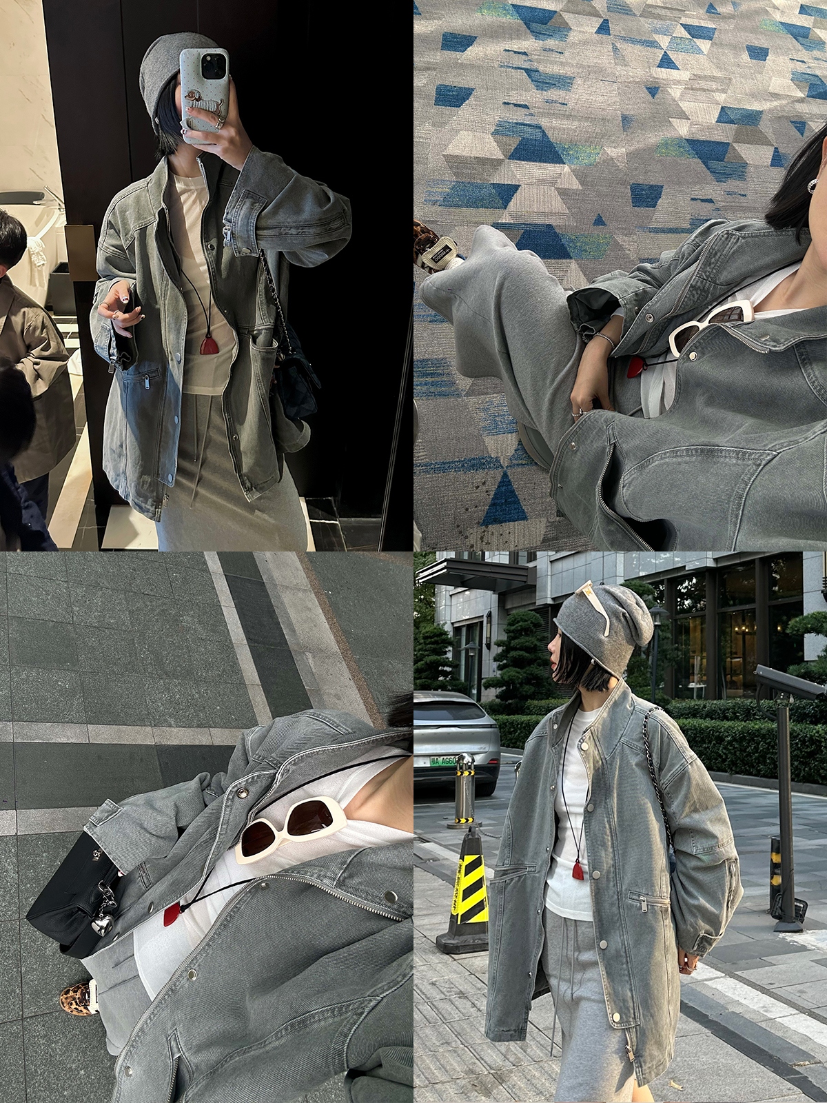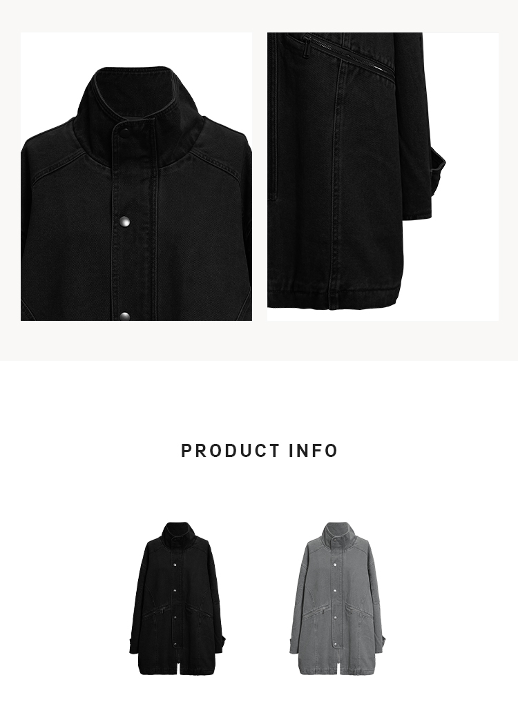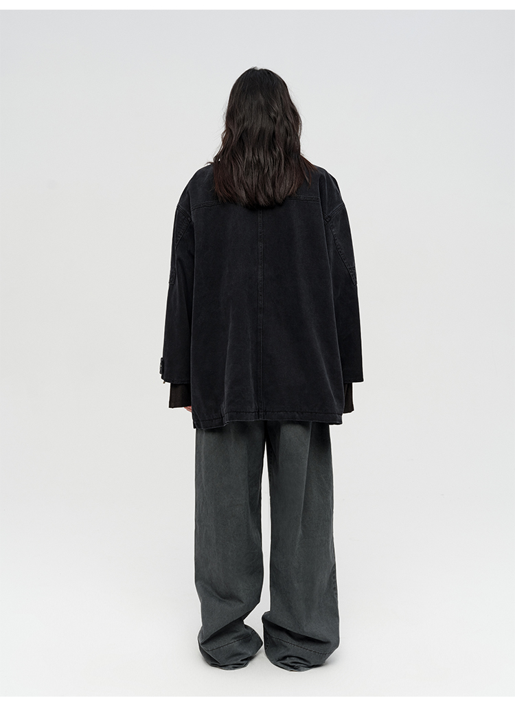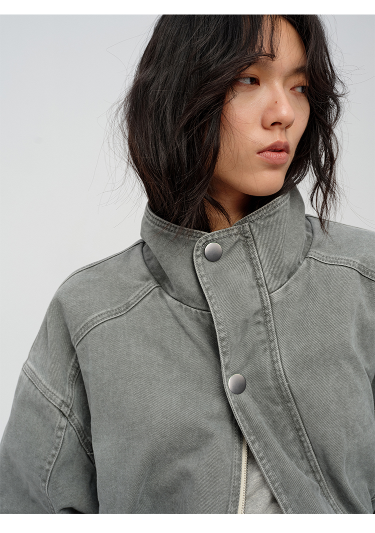 HIDEMI 多重水洗复古牛仔拉链立领式大口袋飞行员中长款大廓形夹克外套 水洗灰/碳黑色