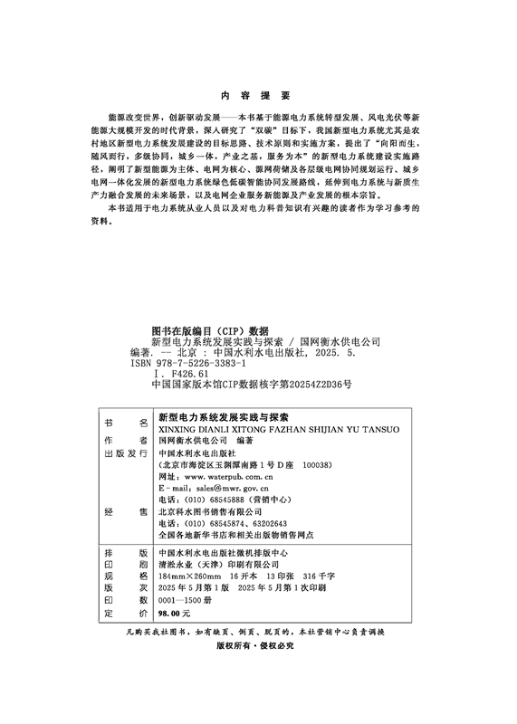全书分为总论、能源发展历史进程及现状转型发展机遇、新型电力系统发展的技术路径探索、新型电力系统发展的商业模式探索、新型电力系统与产业融合发展的未来前景、衡水供电公司新型电力系统建设实践经验六个部分,逐层深入的阐述了编委会对新型电力系统未来发展前景的认识和理解,希望能够对行业内外的读者提供专业技术价值。"