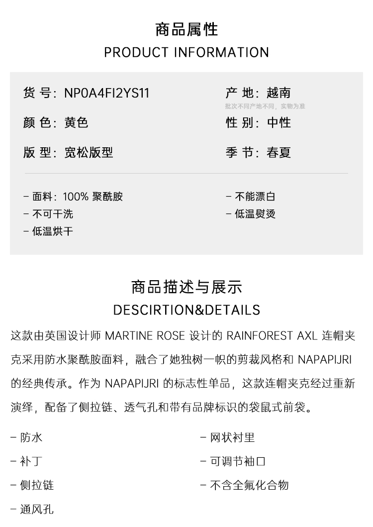 Napapijri 中性Martine Rose联名 Rainforest Axl 字母徽标贴片连帽雨衣 黄色 NP0A4FI2YS11