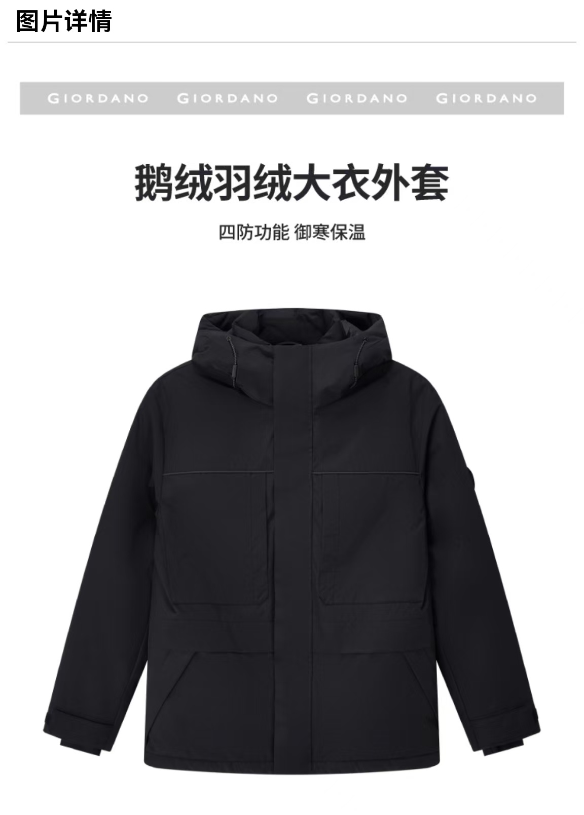 佐丹奴男装25年新款品质防风防泼水防油污鹅绒外套01075627