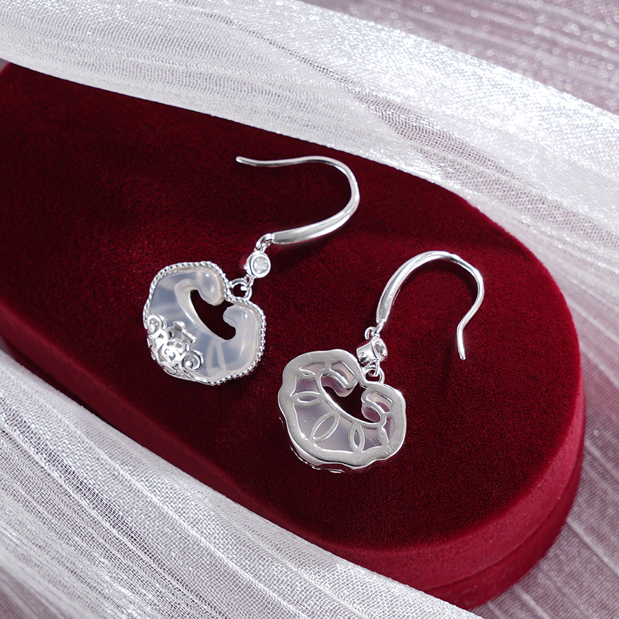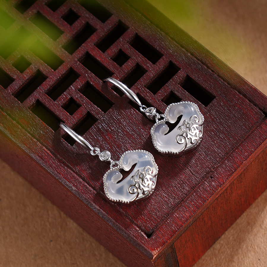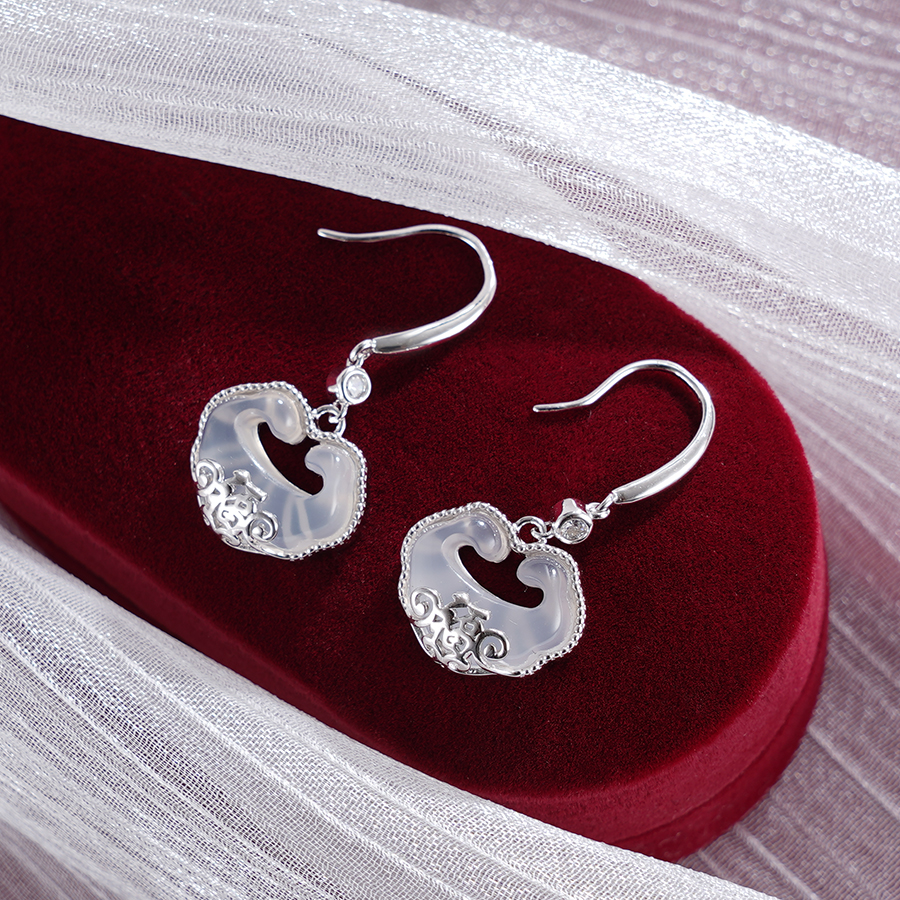 【寓意】:耳饰设计灵感源自如意锁,白玉髓打磨镶嵌,宛如清波凝驻。福字巧妙融合,暗合气韵升腾之势。整体寓意锁住福气,万象长宁。