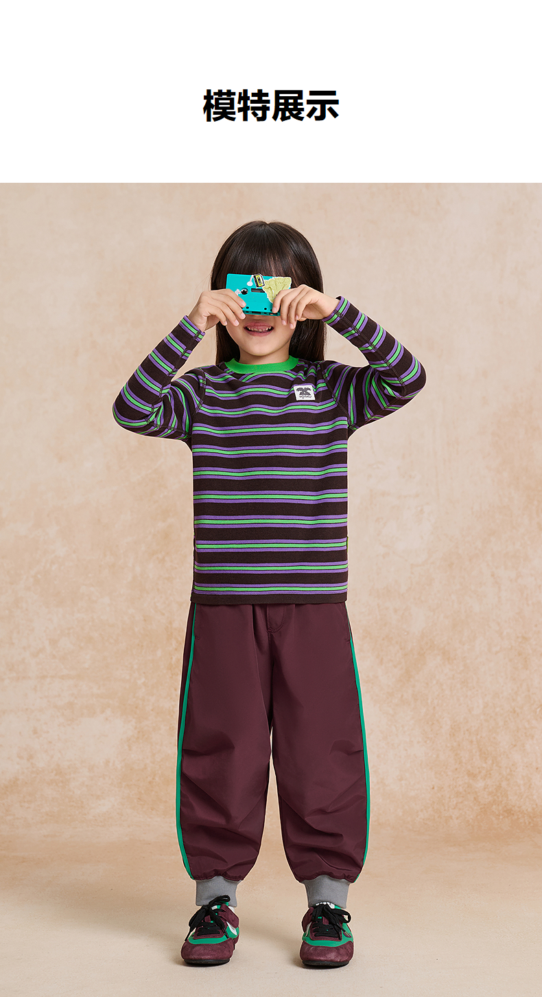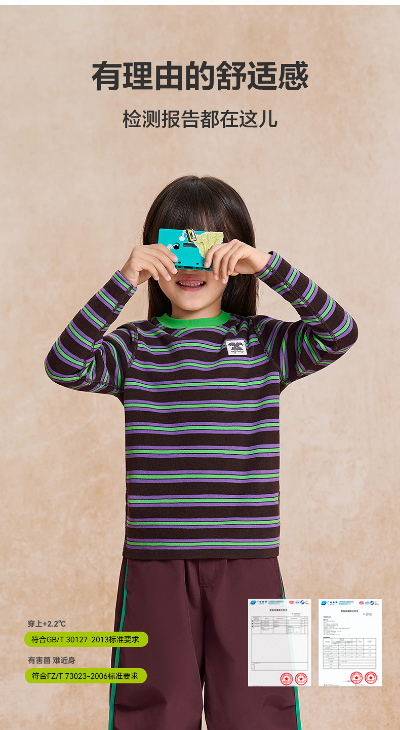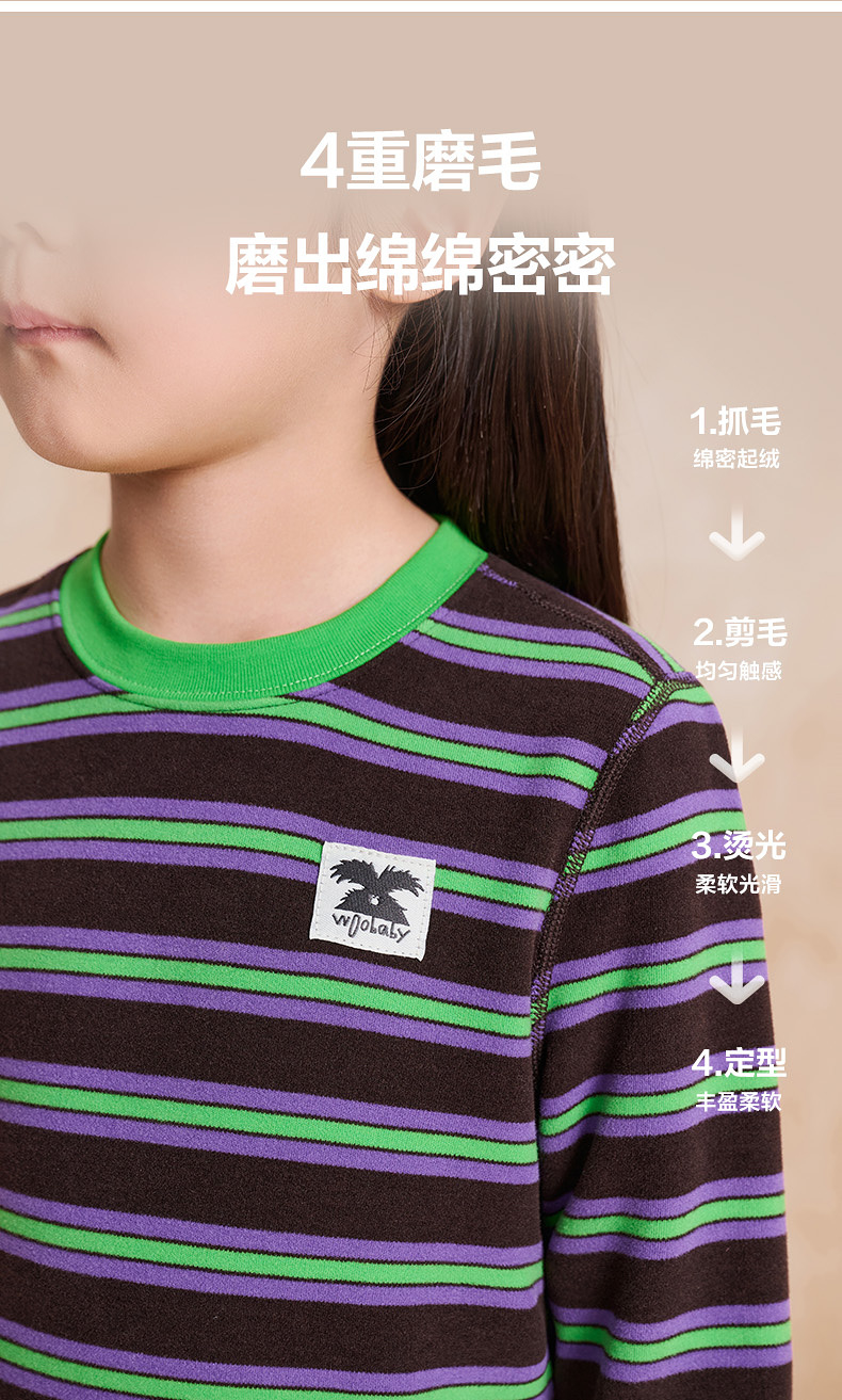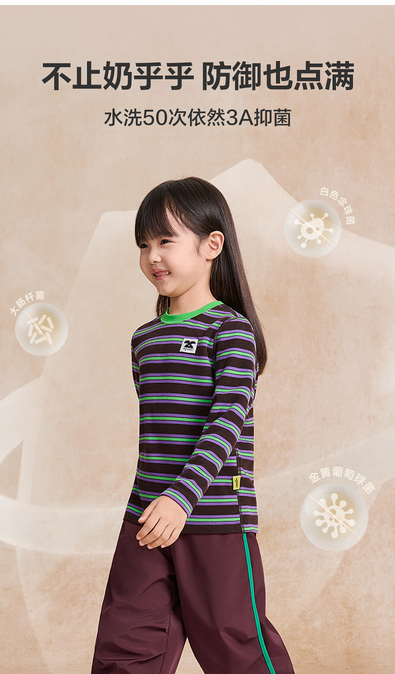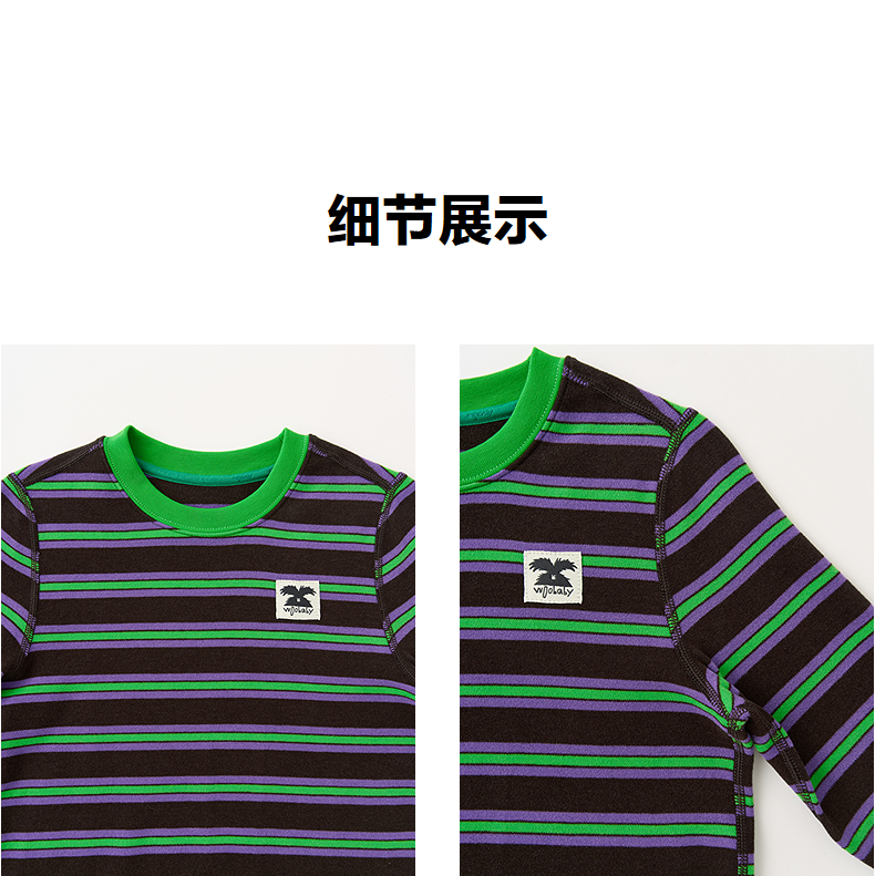 【woobaby】【远红外发热】儿童条纹T恤25秋新品男女童上衣磨毛柔软内搭