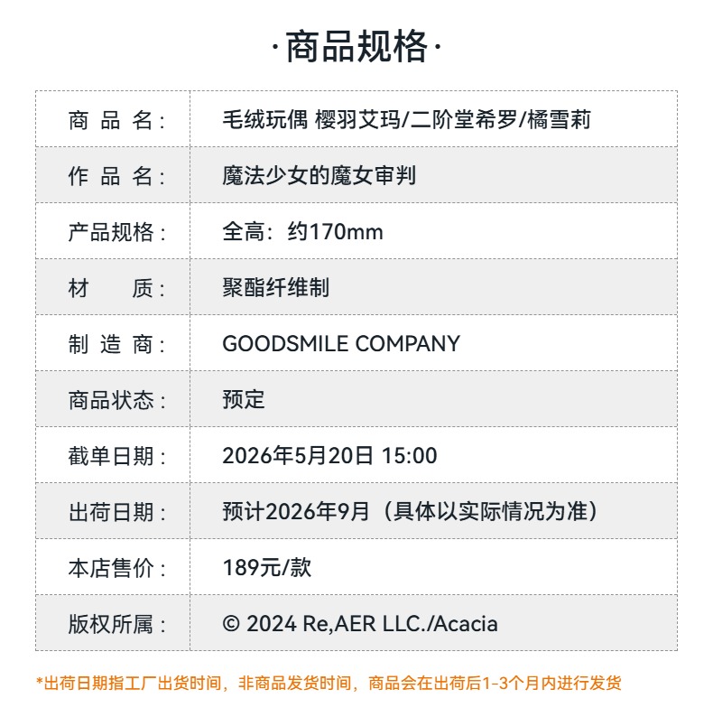 【GSC预售定金】毛绒玩偶 樱羽艾玛/二阶堂希罗/橘雪莉 魔法少女的魔女审判