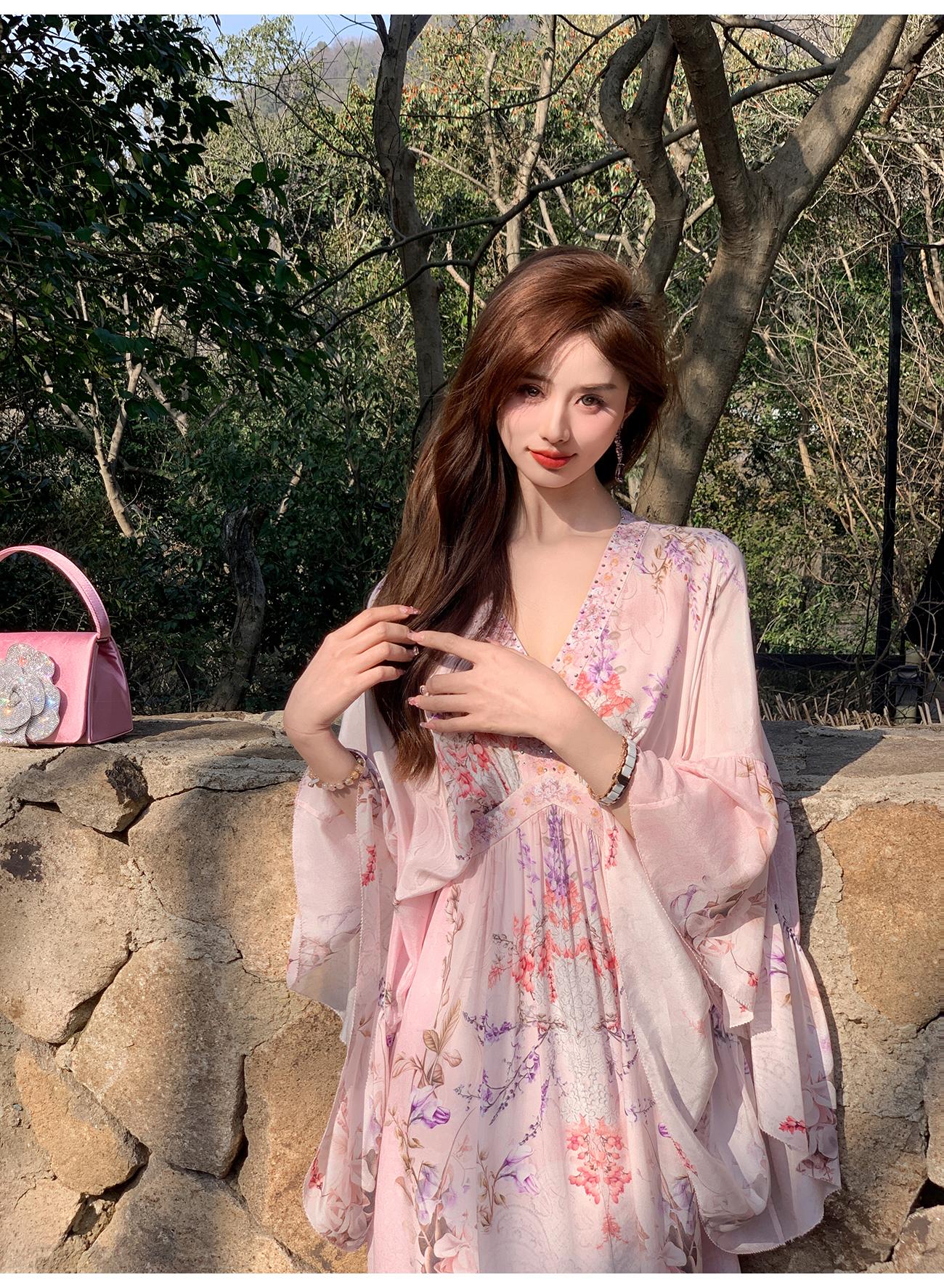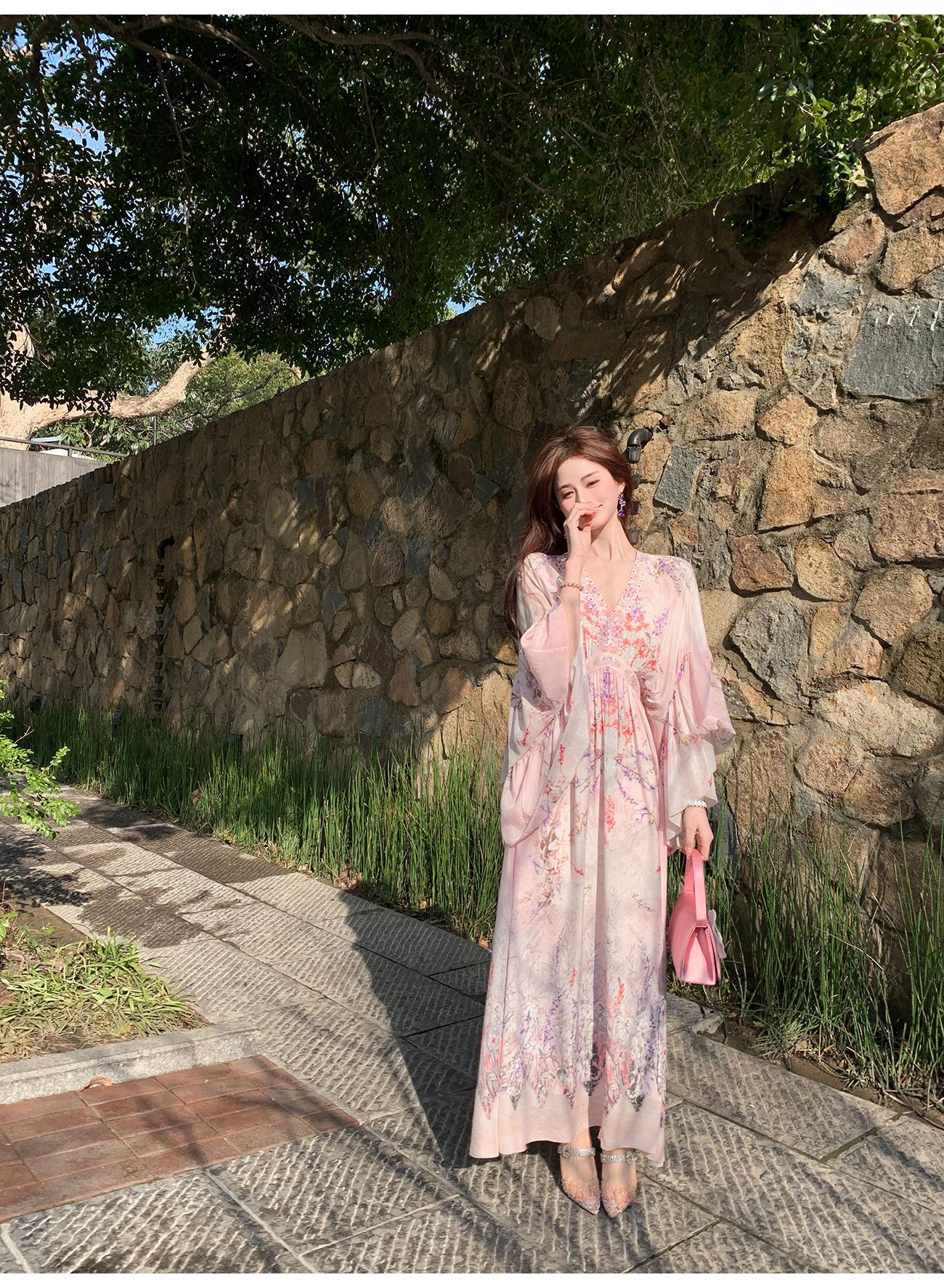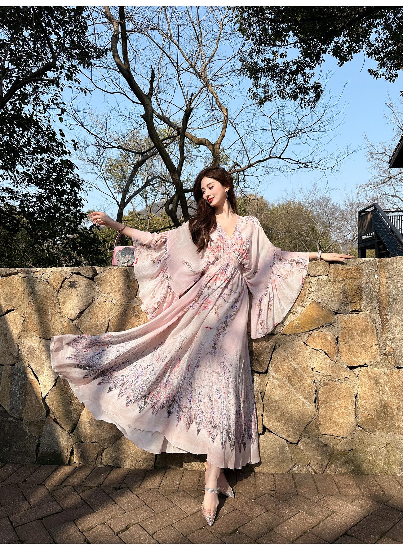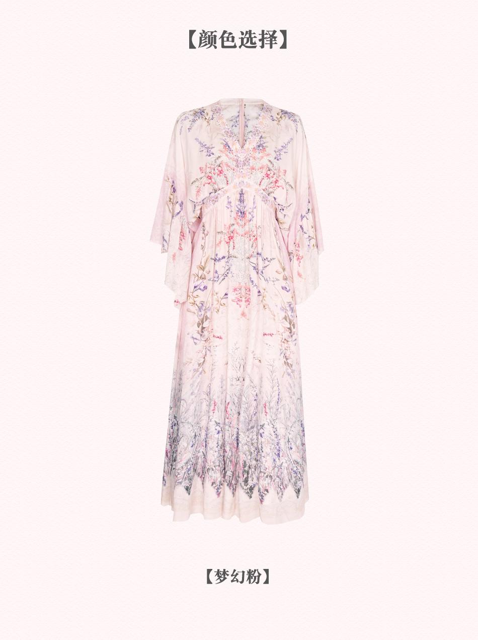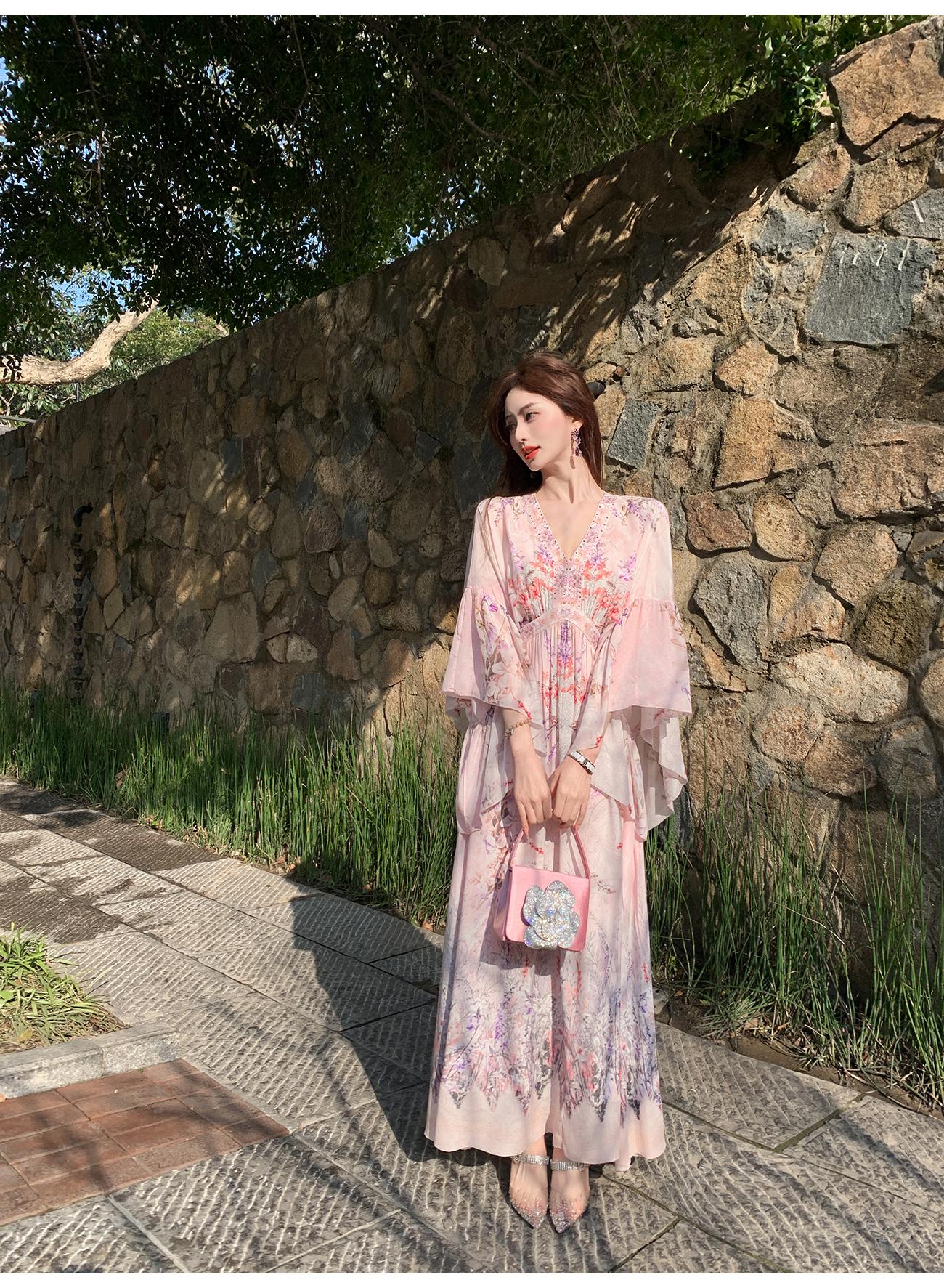 【孤品样衣,不退不换】【花海绘梦】法式浪漫印花桑蚕丝双绉夏日田园烫钻复古连衣裙