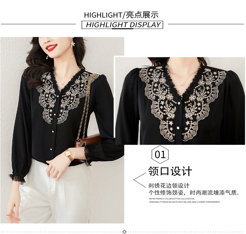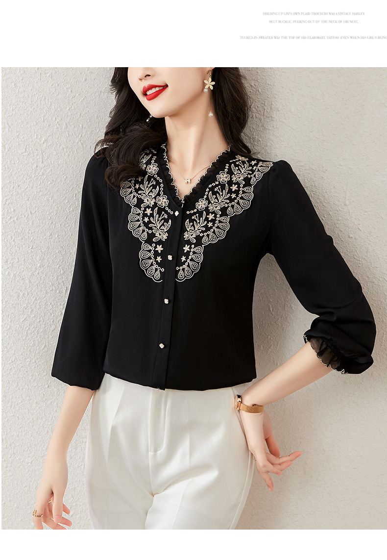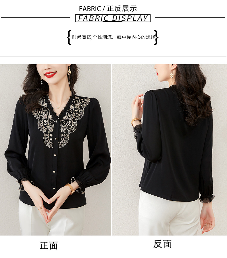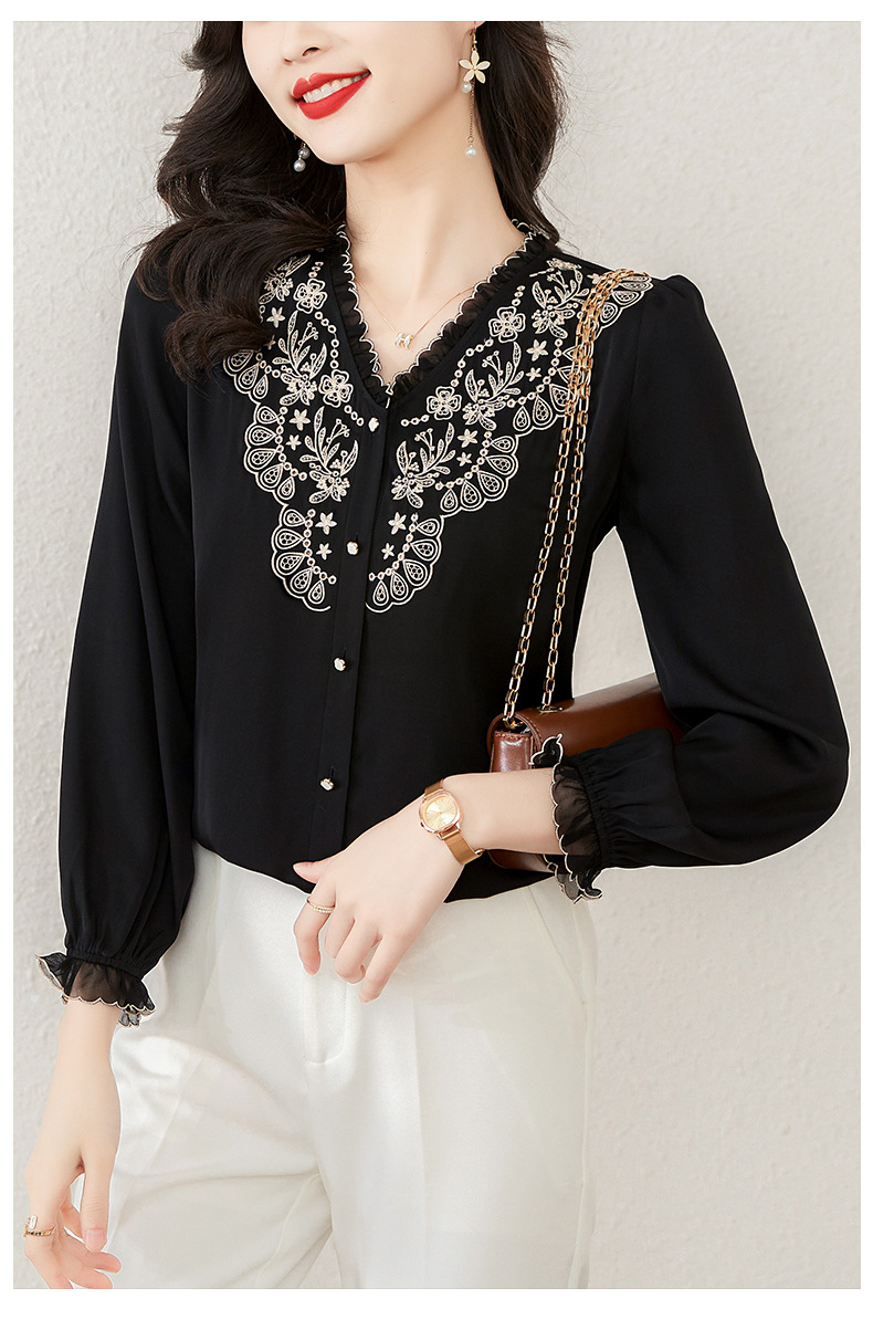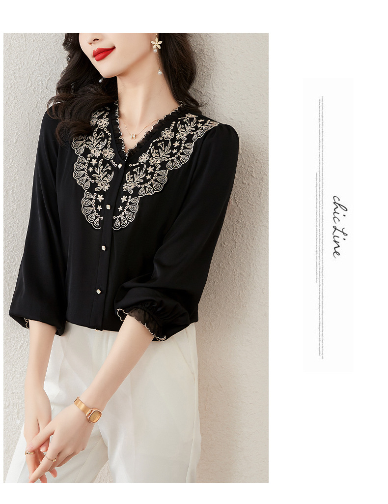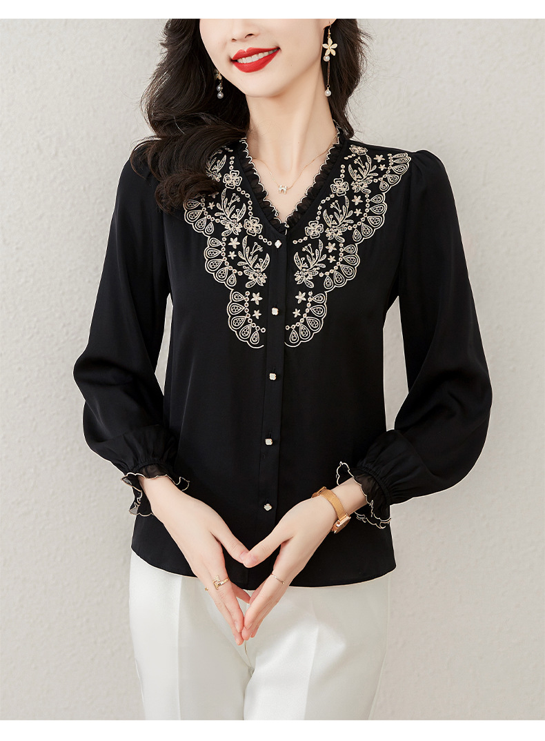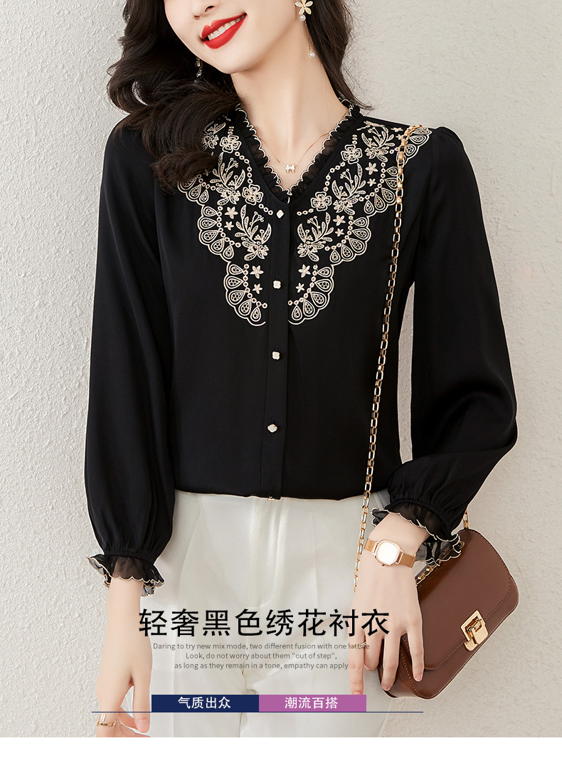 甜美女人味,木耳花边v领仿真丝刺绣小衫KQL-3068