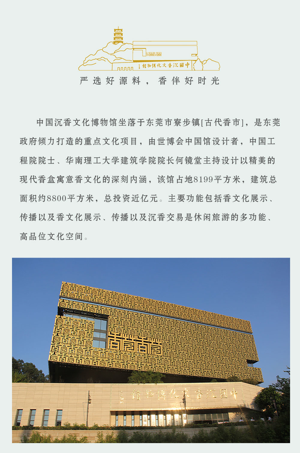 中国沉香文化博物馆坐落于古代[香市]东莞市寮步镇,是东莞政府倾力打造的重点文化项目,由世博会中国馆设计者,中国工程院院士、华南理工大学建筑学院院长何镜堂主持设计,以精美的现代[香盒]寓意香文化的深刻内