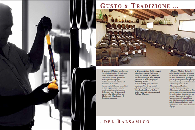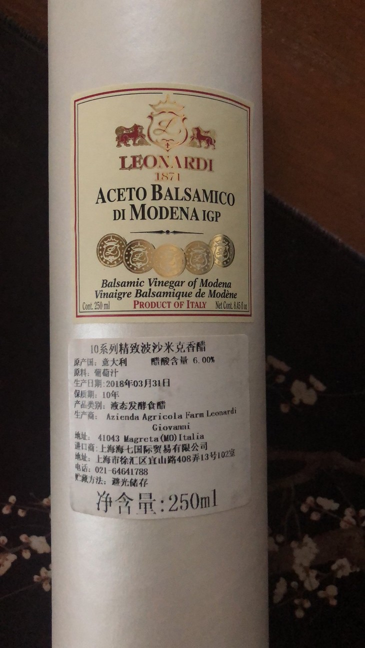 莱昂纳迪10年份香醋(Balsamic Vinegar),系位于意大利香醋(Balsamic Vinegar)法定核心产区摩迪纳的家族企业莱昂纳迪醋酿造庄园荣誉出品,其传统工艺经过四代传承。所有产品原料皆来自农场周围的葡萄园,也就是典型的Trebbiano翠比亚诺白葡萄和Lambrusco蓝布鲁斯科红葡萄。从这两个品种的葡萄制作煮过的葡萄汁,是意醋的基本的成分,又将其在“Acetaia”的阁楼上的木桶中进行陈年。