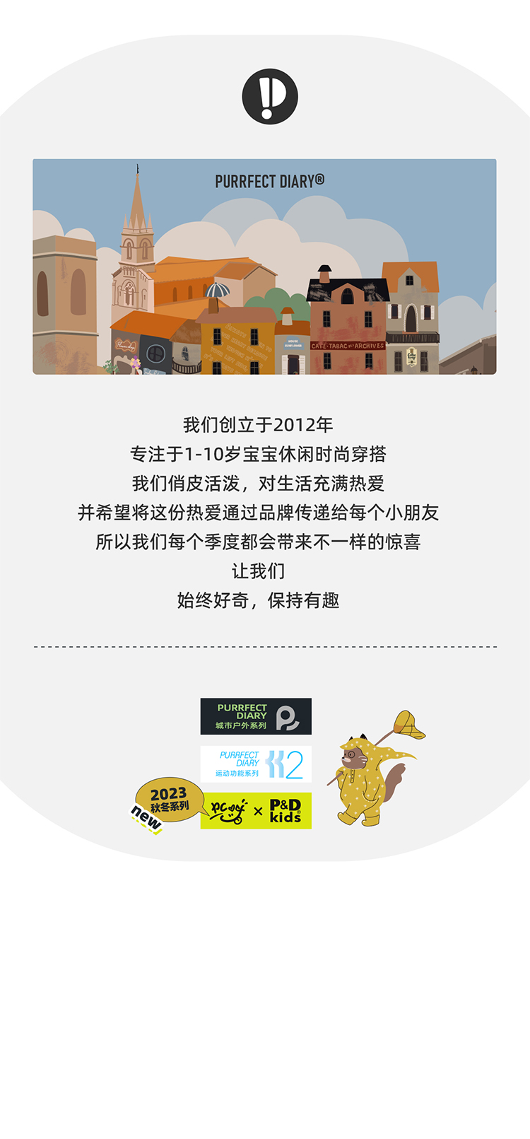 Purrfect-Diary专注于贴近自然随性的穿着概念,轻奢平价的童装文化传播,在产品设计上更加注重婴童穿着的舒适性、安全性、更出众的国际化品牌,将欧美的育婴文化在中国进行深入的传播与推广。