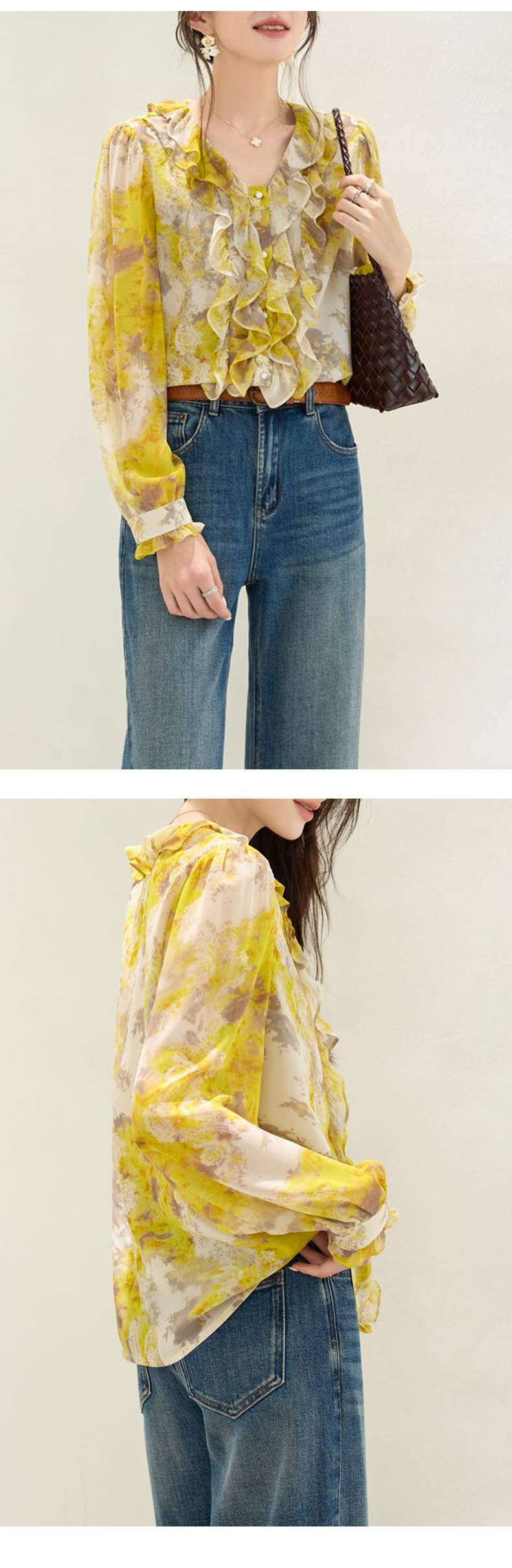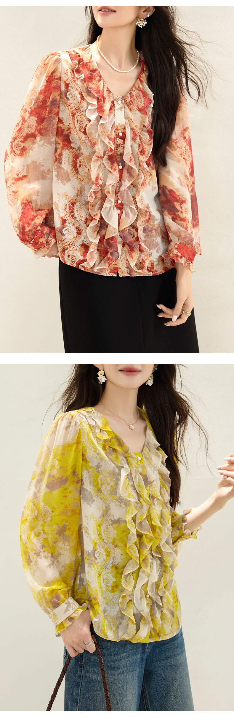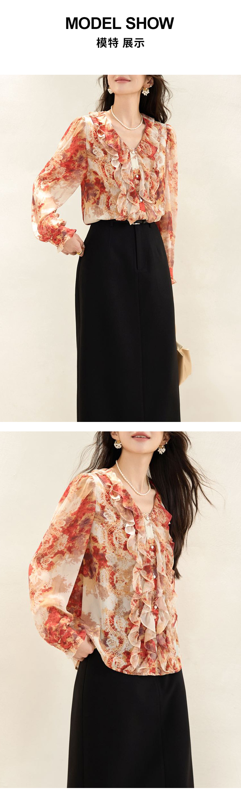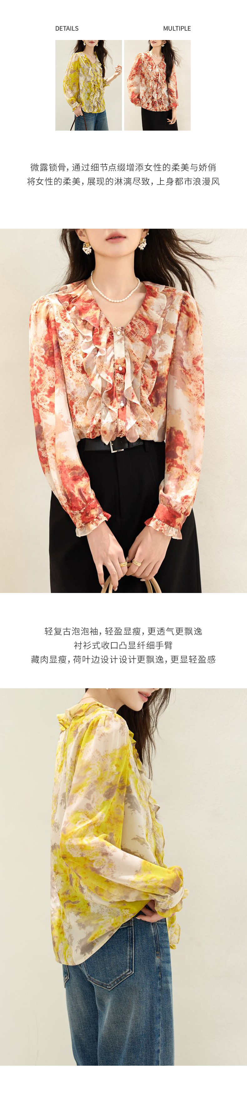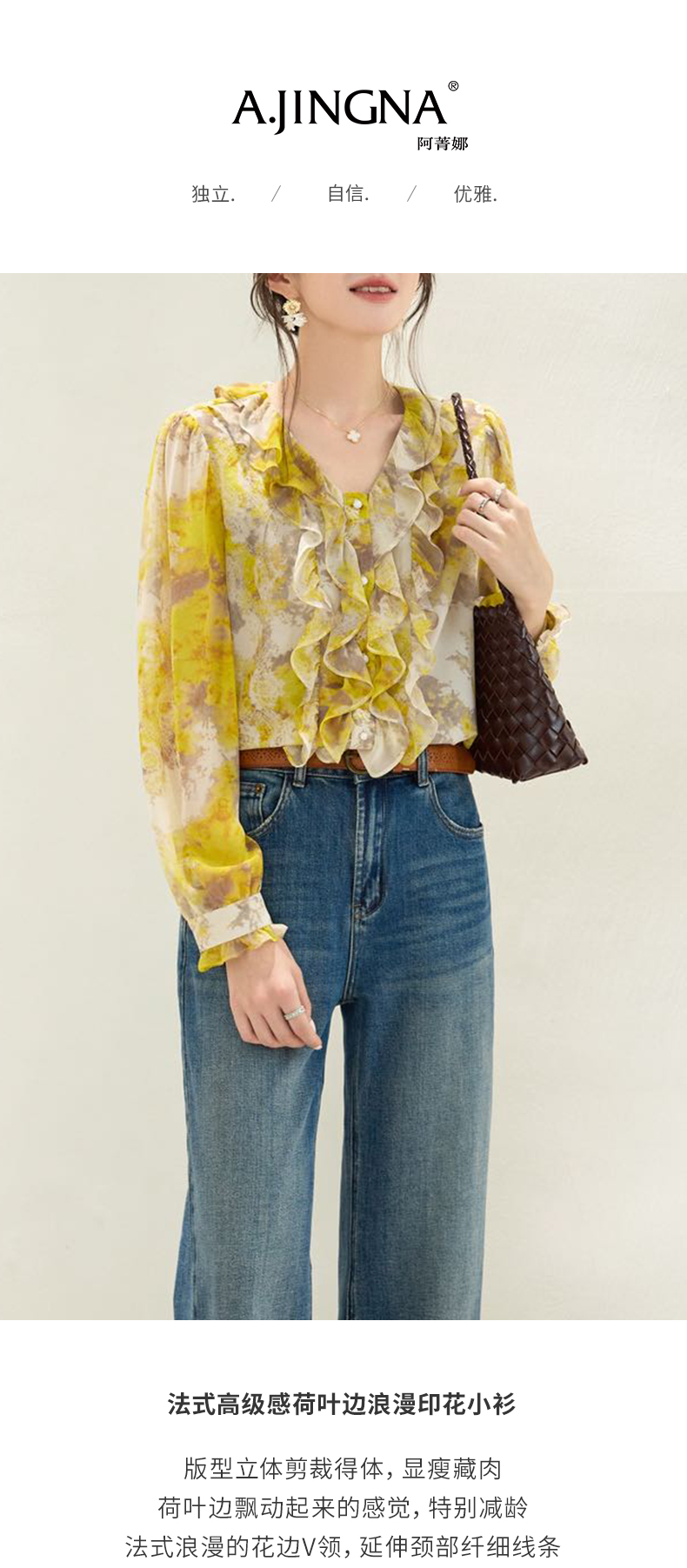 【法式浪漫】阿菁娜法式高级感荷叶边浪漫印花小衫F30Q202006