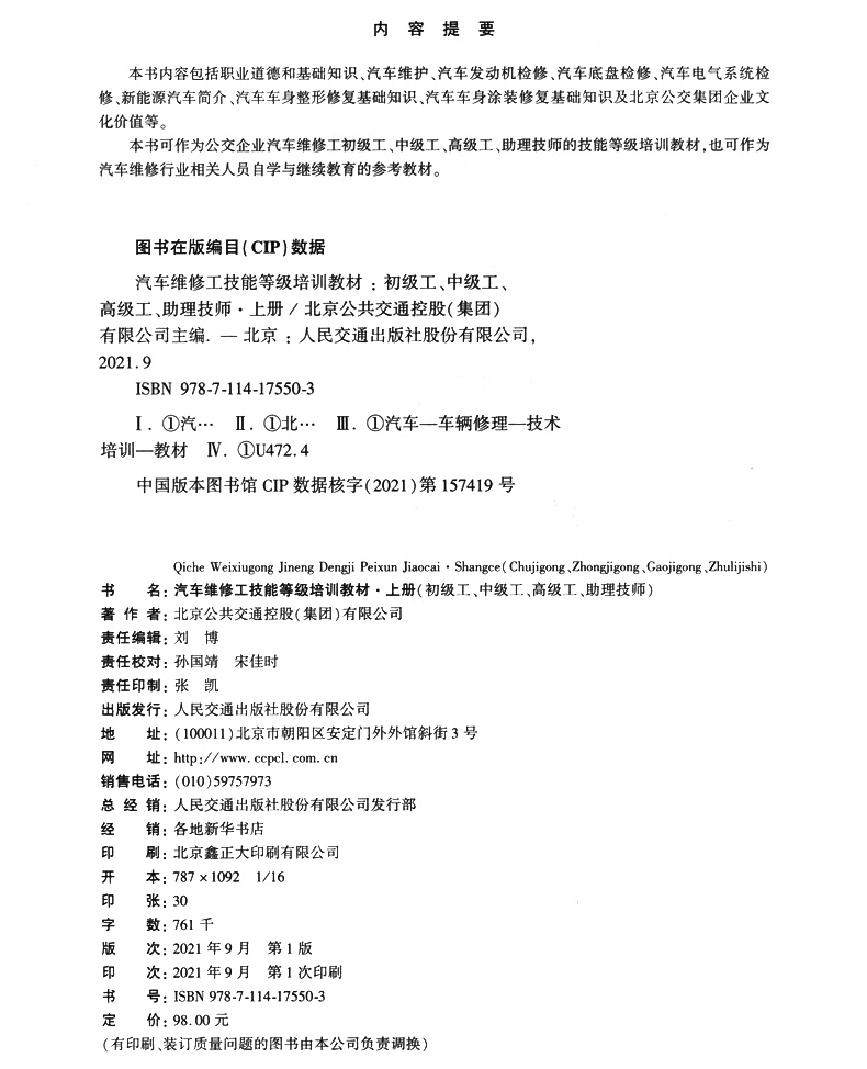 书名:汽车维修工技能等级培训教材·上册(初级工、中级工、高级工、助理技师)