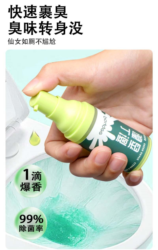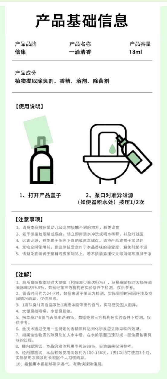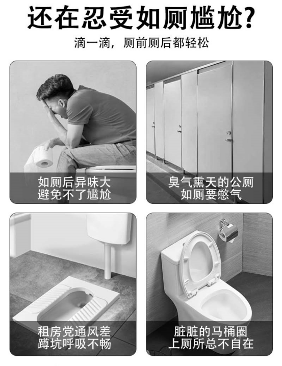 使用方便: 如厕前打开瓶盖后 往马桶的积水处滴1~2滴即可。 如果使用的是公共厕所蹲坑,可以先放一遍水 然后再对准坑洞滴两三滴。