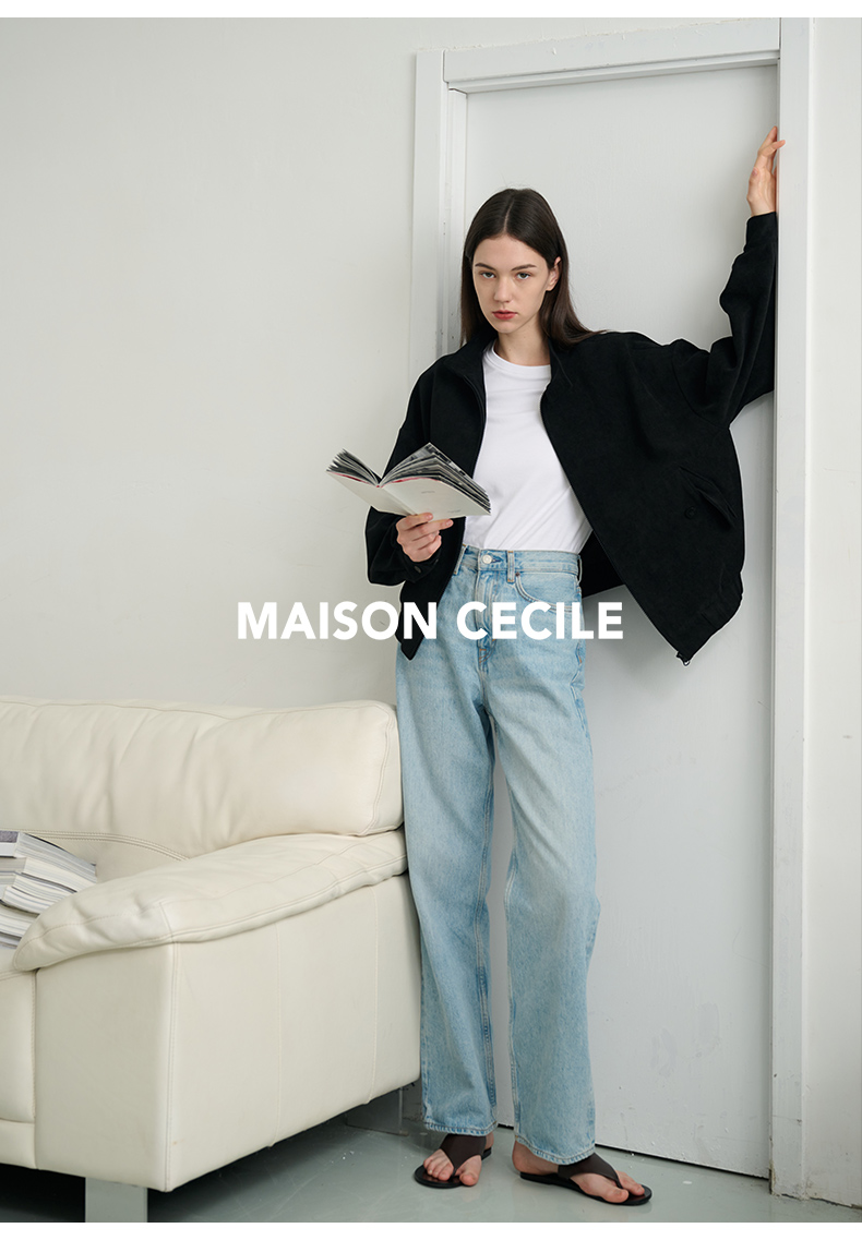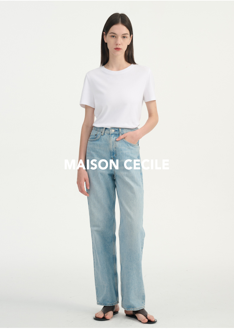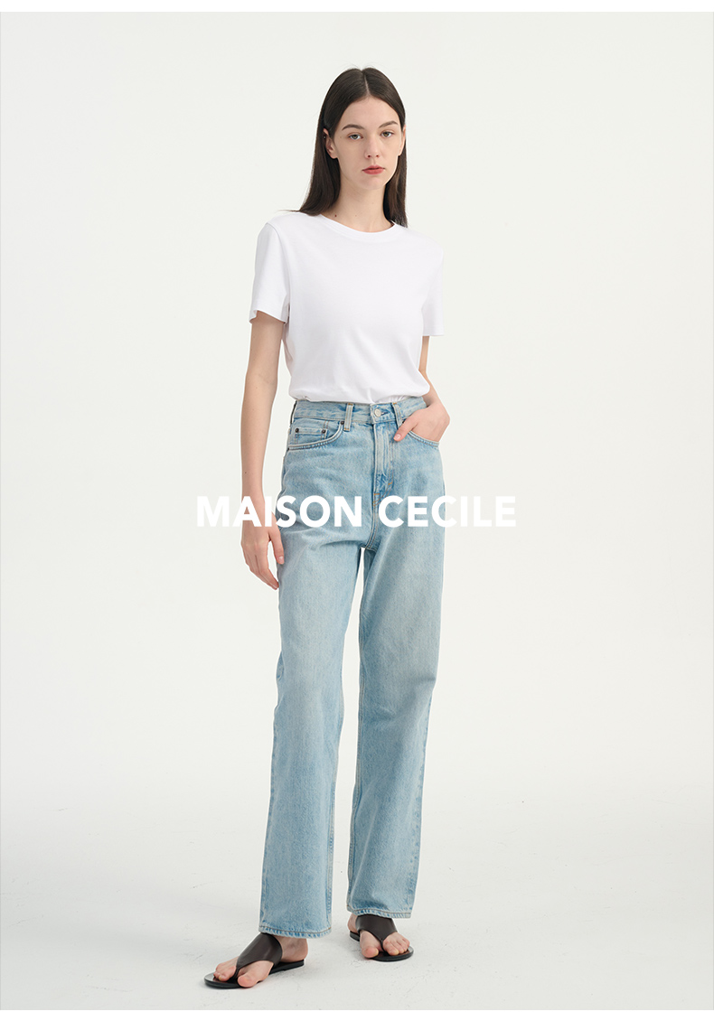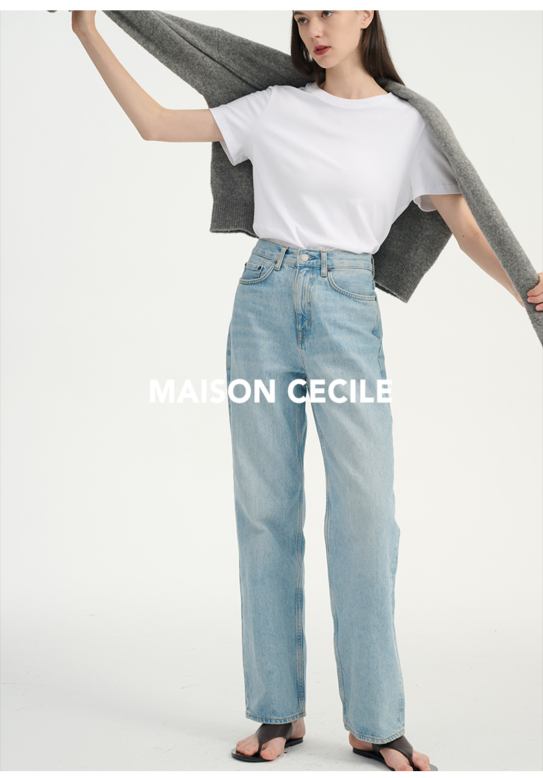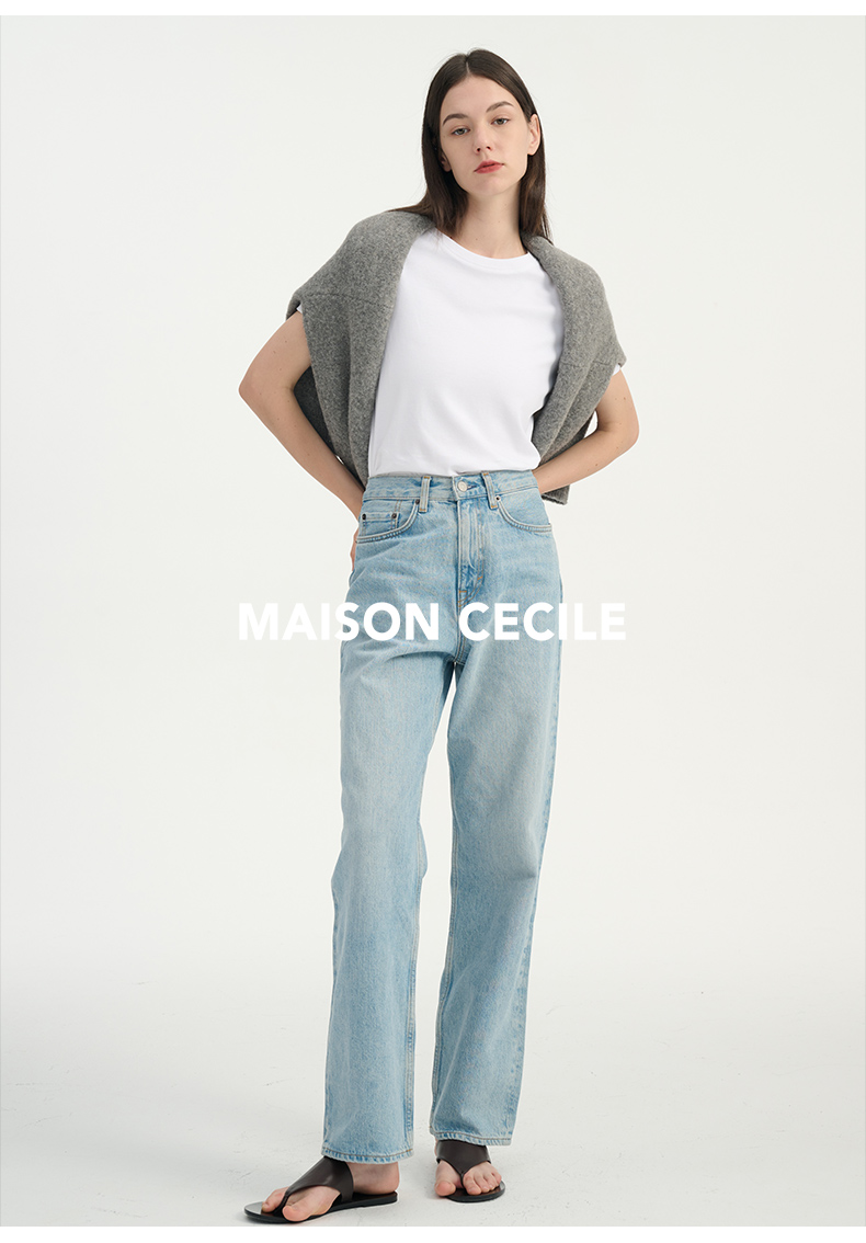 MAISON CECILE浅色复古水洗蓝直筒显瘦高腰牛仔裤