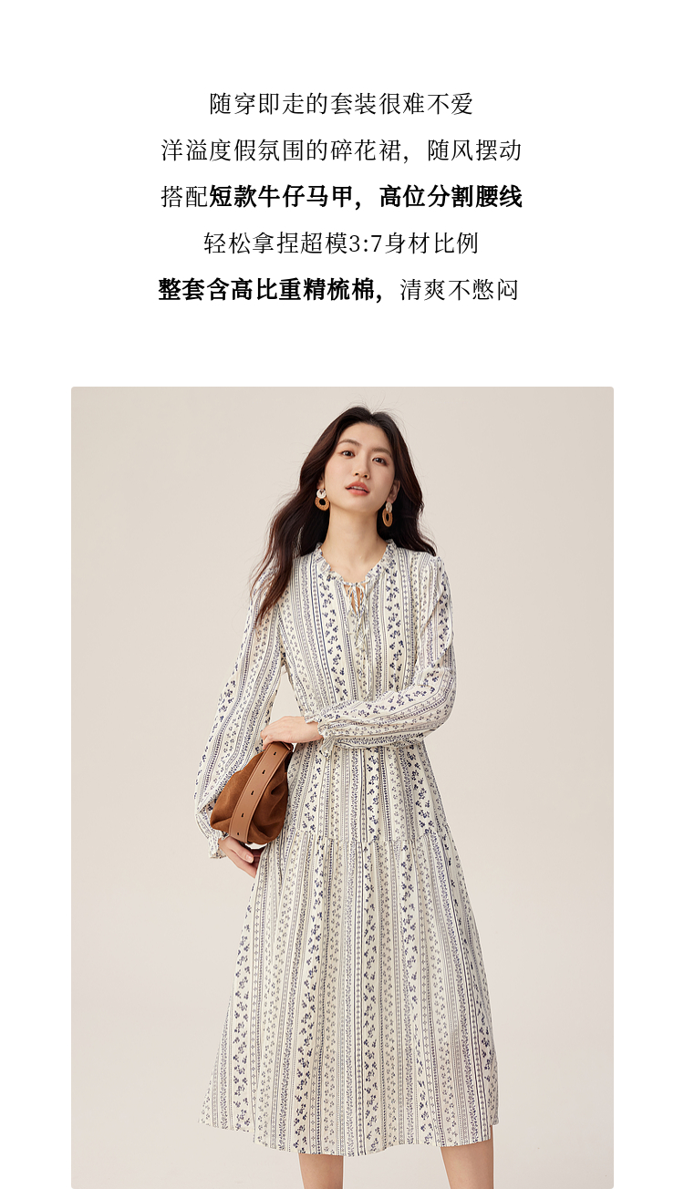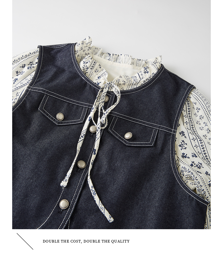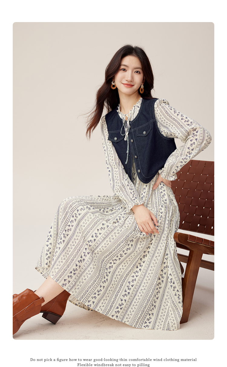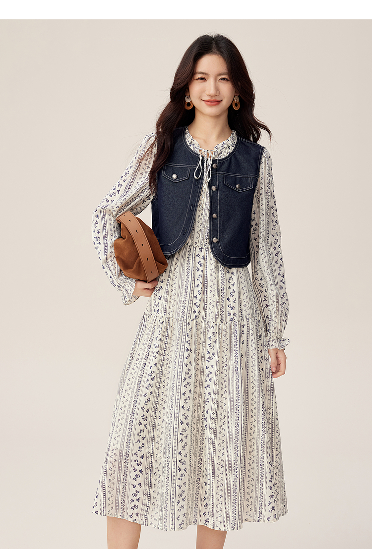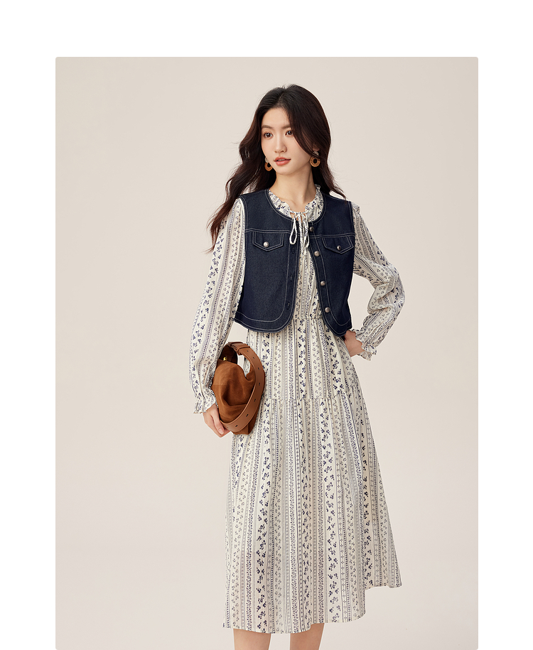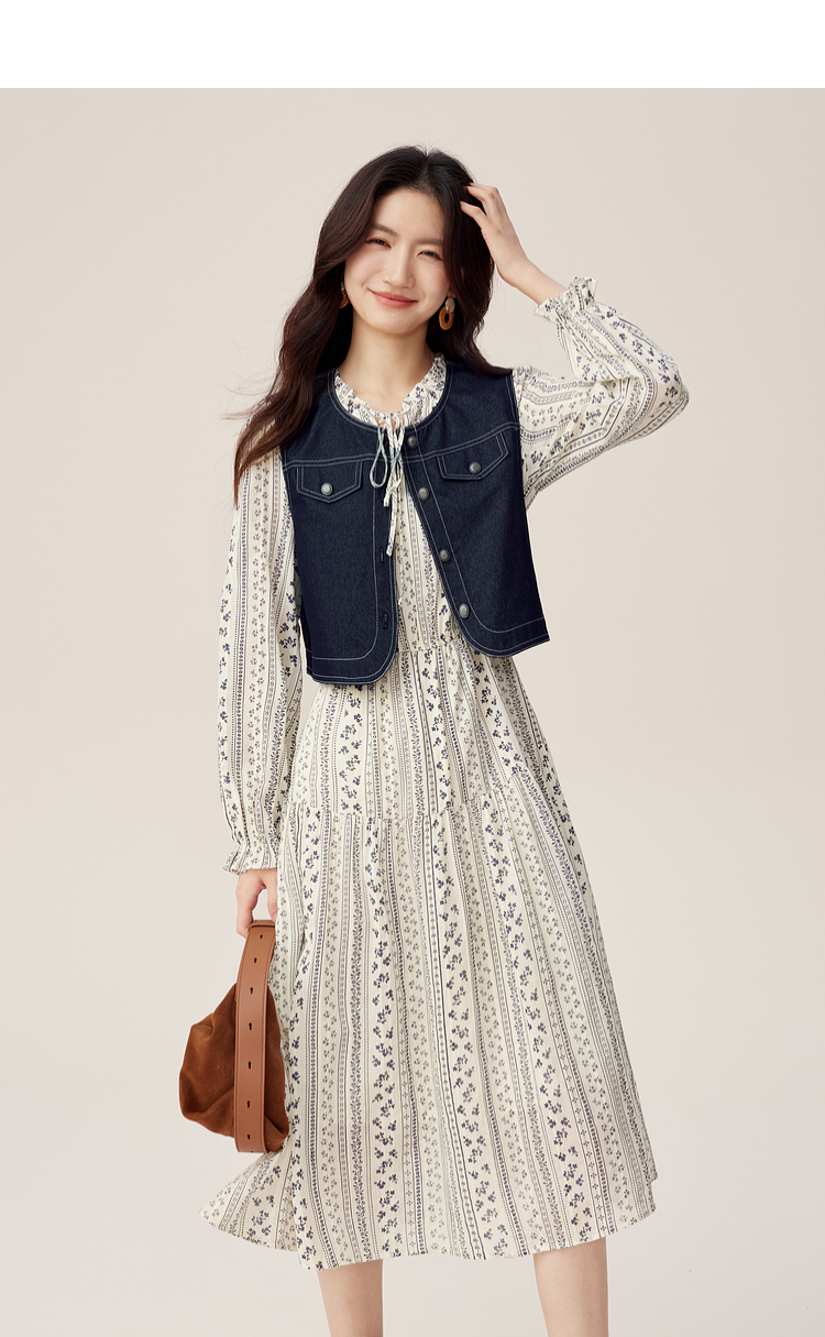 【08/12新品】熙世界巨好看的套装女2025秋季新款短款牛仔马甲碎花连衣裙两件套