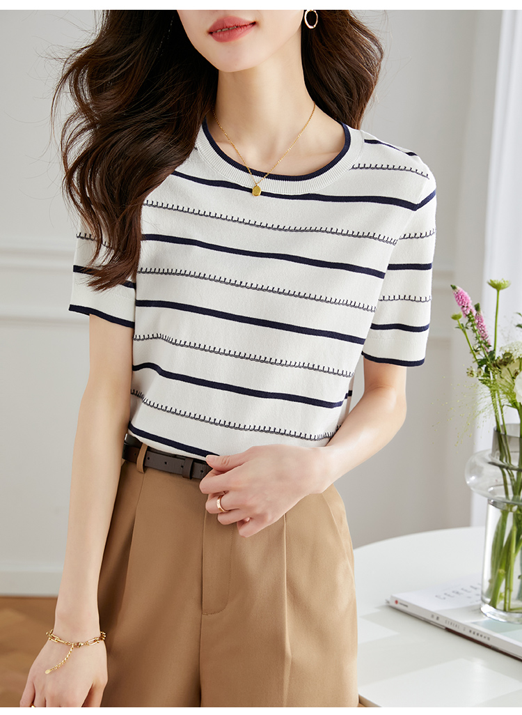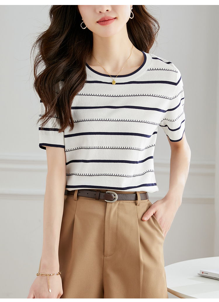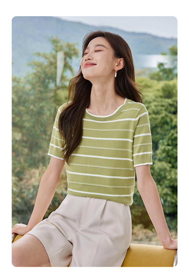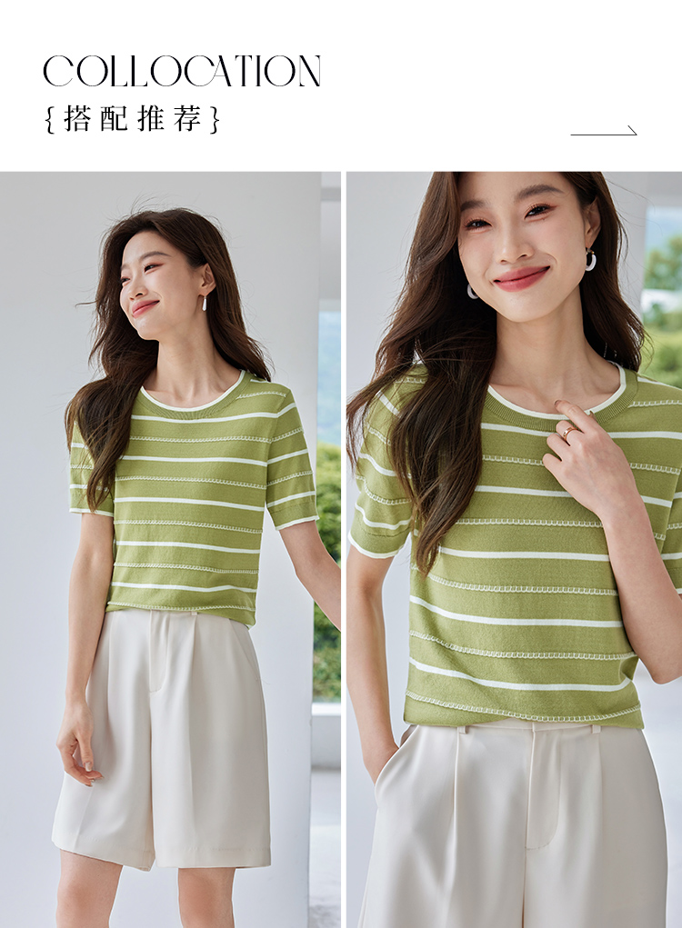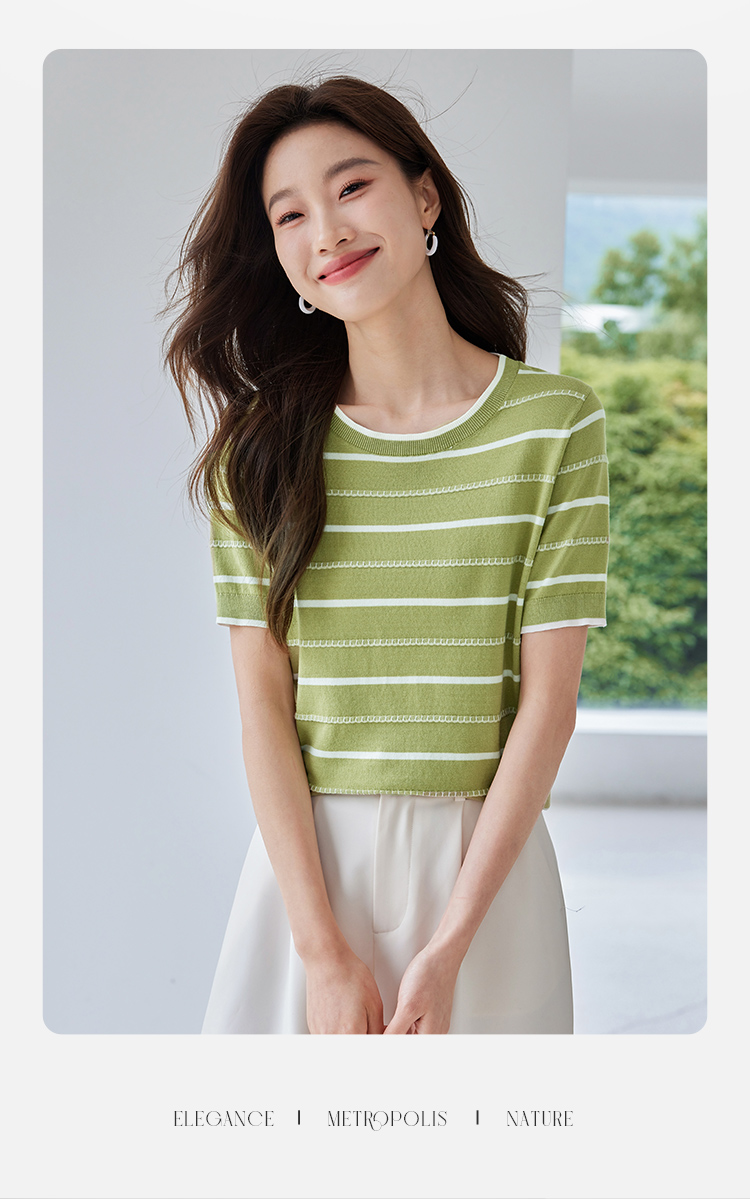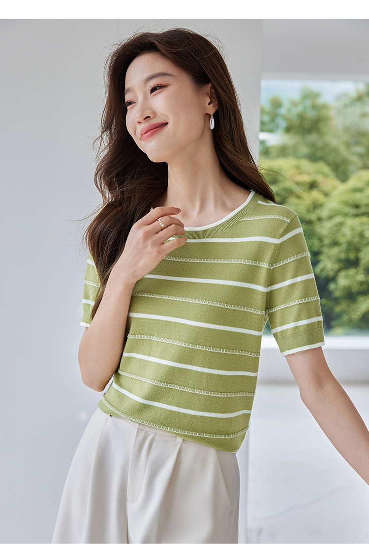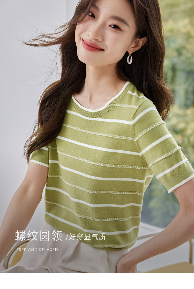 【专属特价】熙世界天丝棉条纹短袖针织衫女薄款2025春夏新款百搭休闲圆领T恤衫上衣