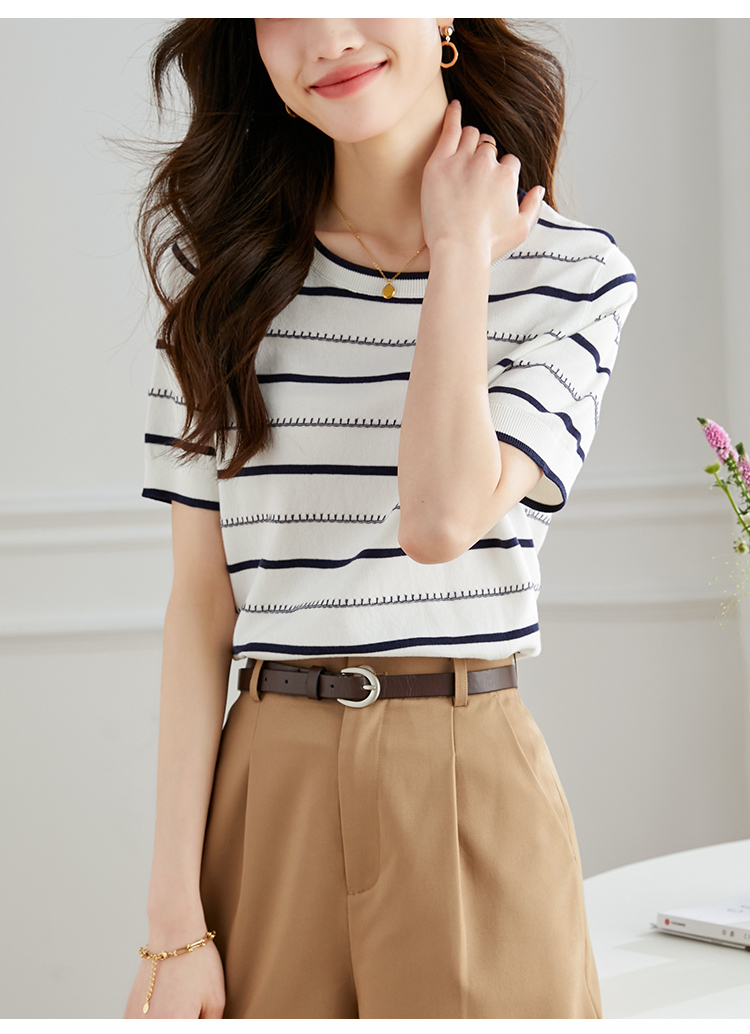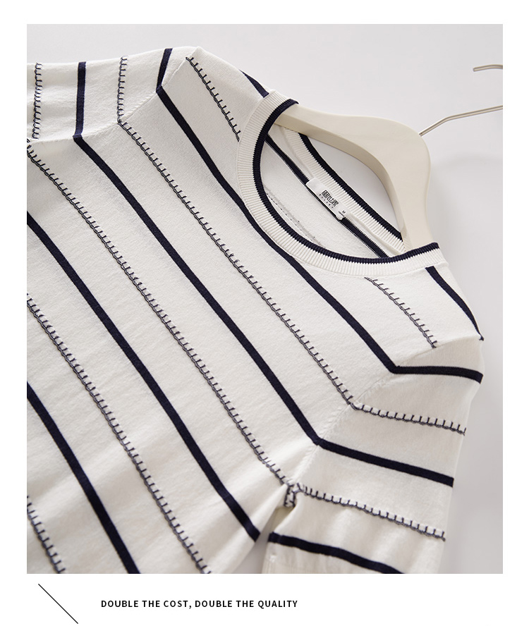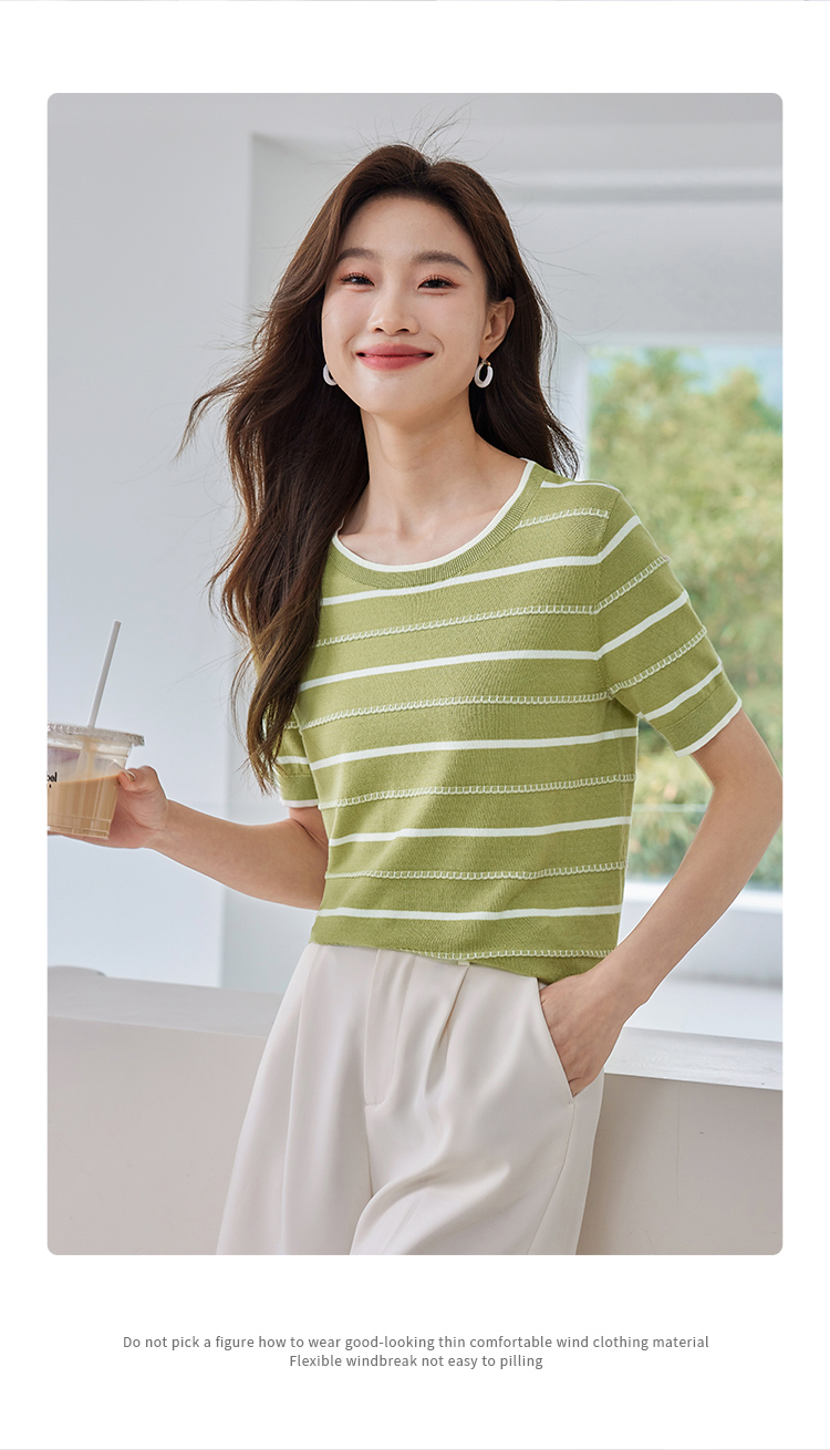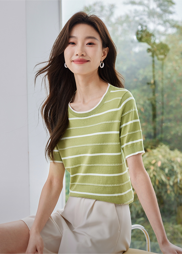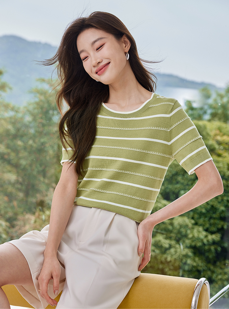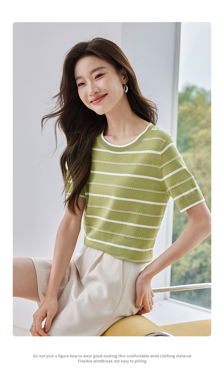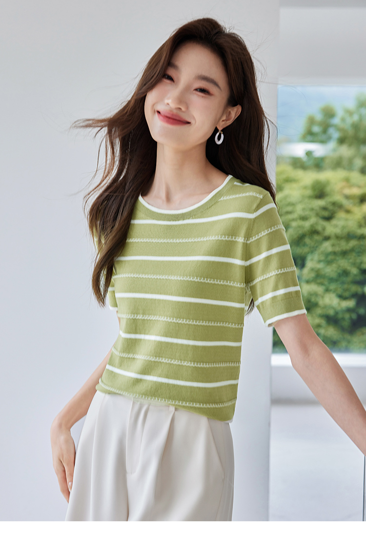 【专属特价】熙世界天丝棉条纹短袖针织衫女薄款2025春夏新款百搭休闲圆领T恤衫上衣