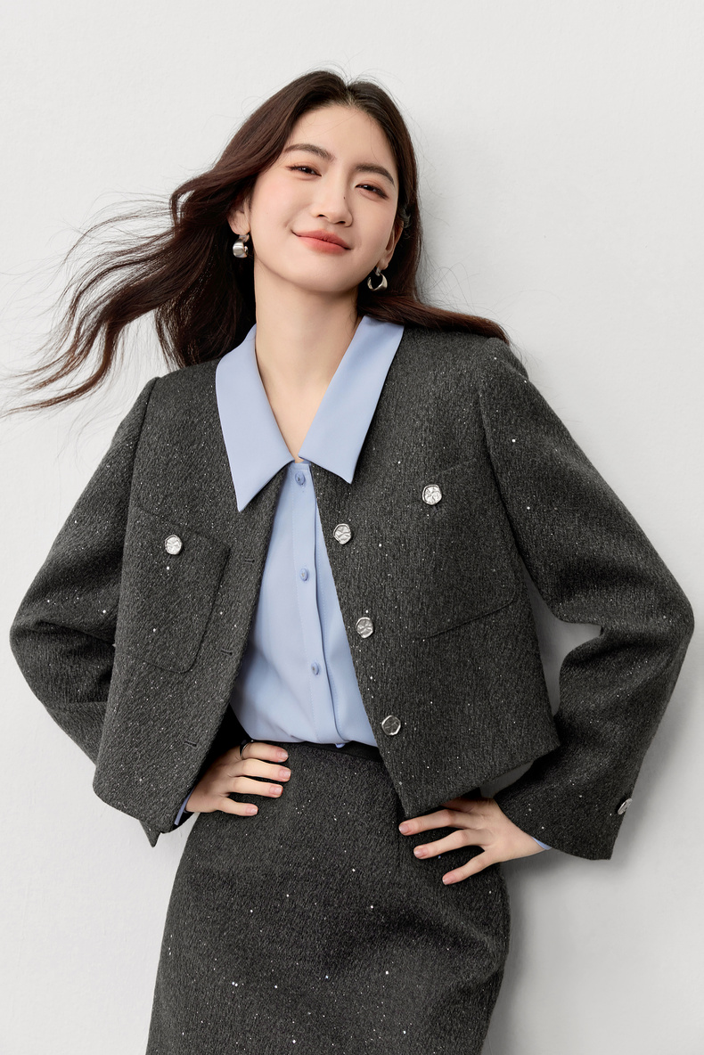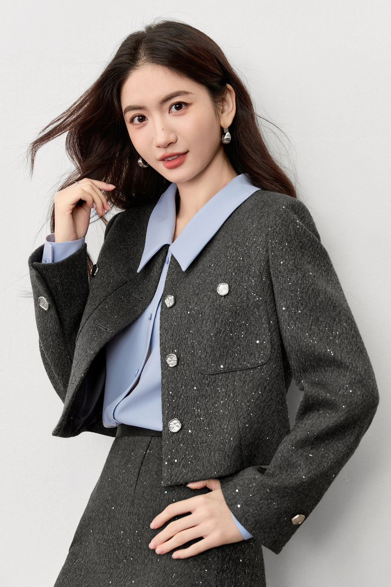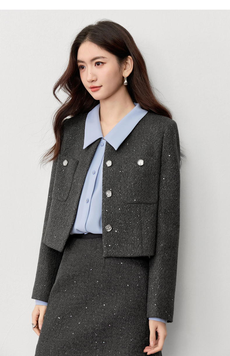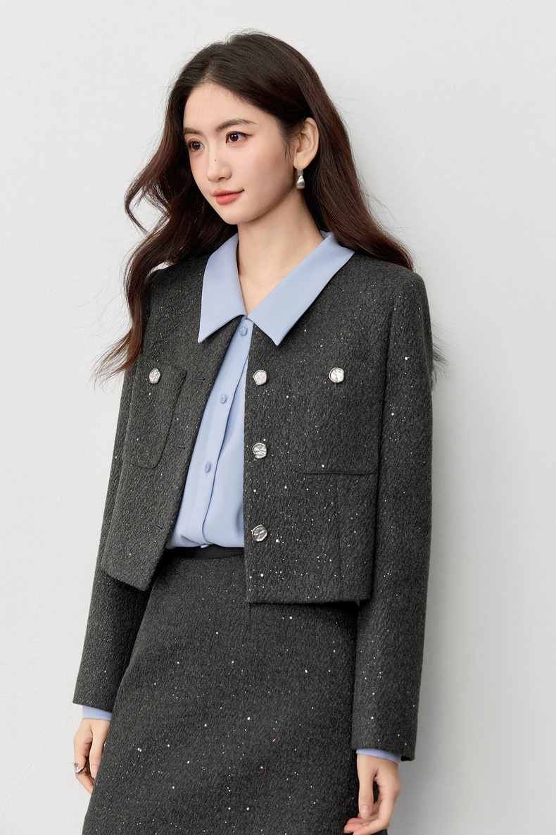 【内购】【含绵羊毛】小香风通勤圆领树皮感肌理亮片保暖厚毛呢长袖外套-153WA2012