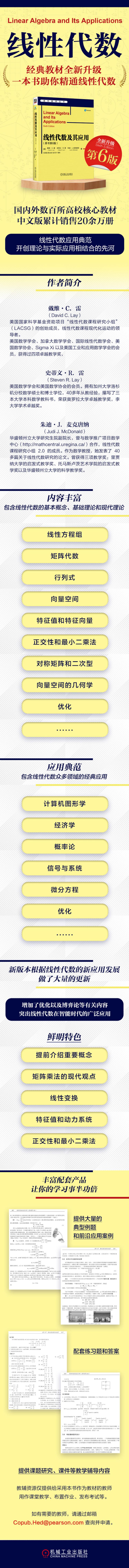 本书是一本新颖、实用的线性代数教材,给出线性代数基本介绍和一些有趣应用,目的是帮助学生掌握线性代数的基本概念及应用技巧,为后续课程的学习和工作实践奠定基础。与以前的版本相比,第6版根据线性代数的新应用发展,做了大量的更新,重新编排了第4章,将马尔科夫链移至第5章,新增加了有关信号处理的内容,并且增加了全新的一章——优化,而且在网上为学生和教师提供了进一步的技术支持。
