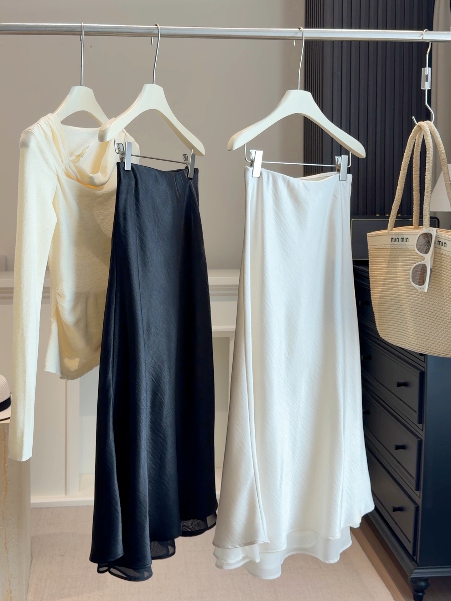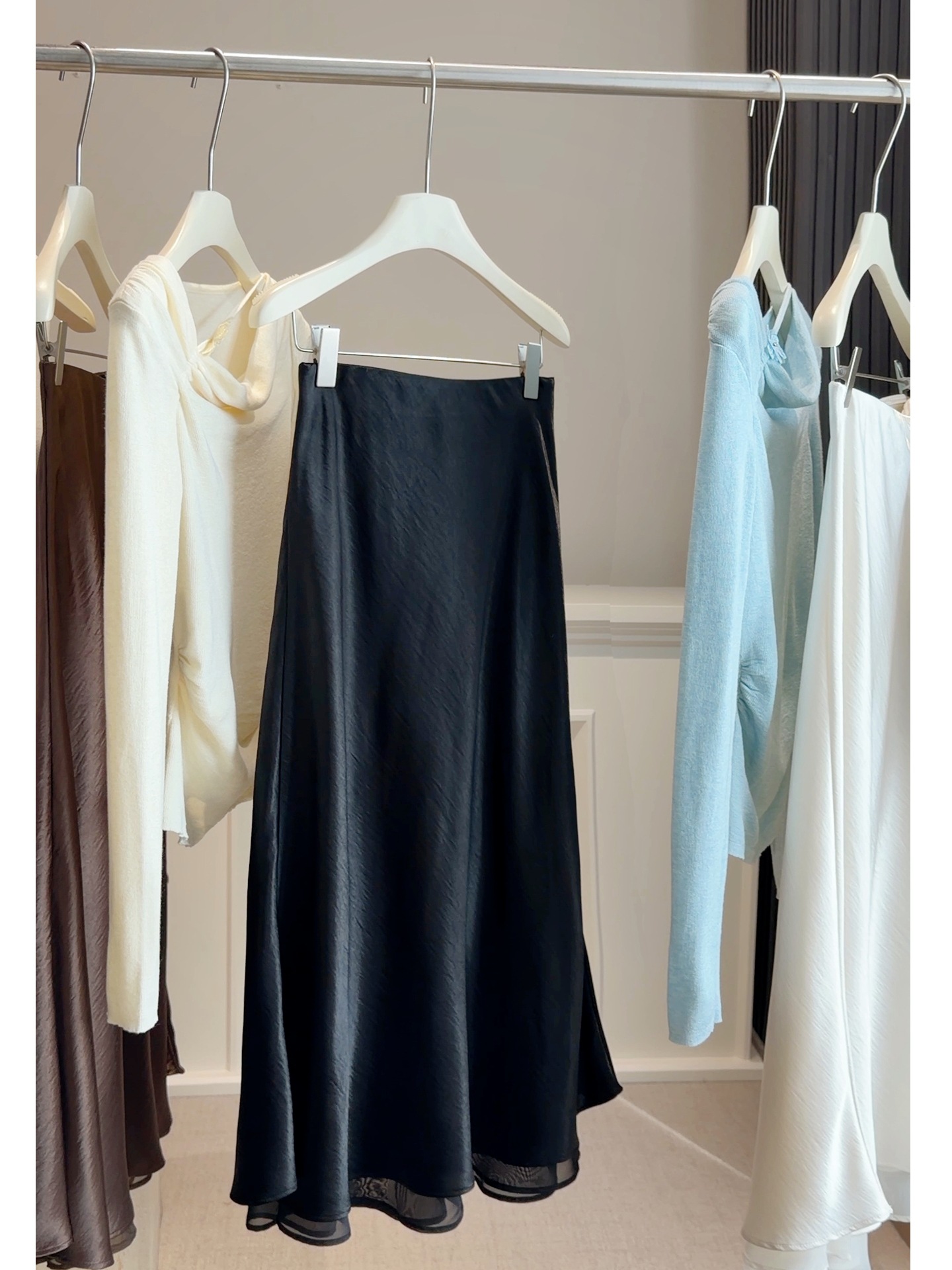 【气质网纱拼接醋酸缎面鱼尾裙】春夏新款 纯色垂感高腰A字半身裙