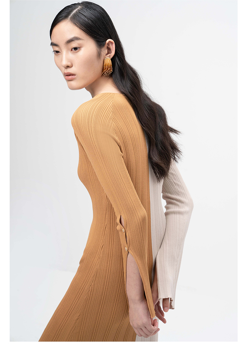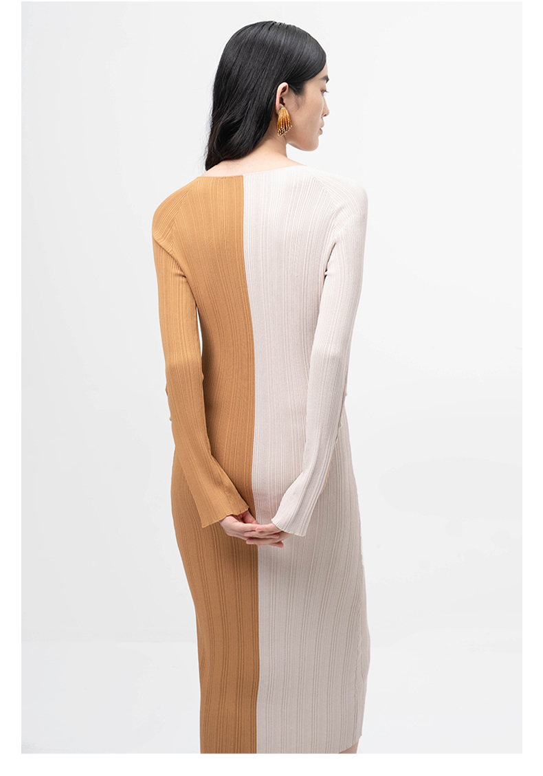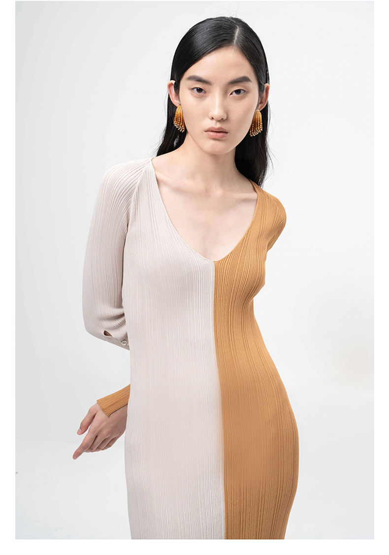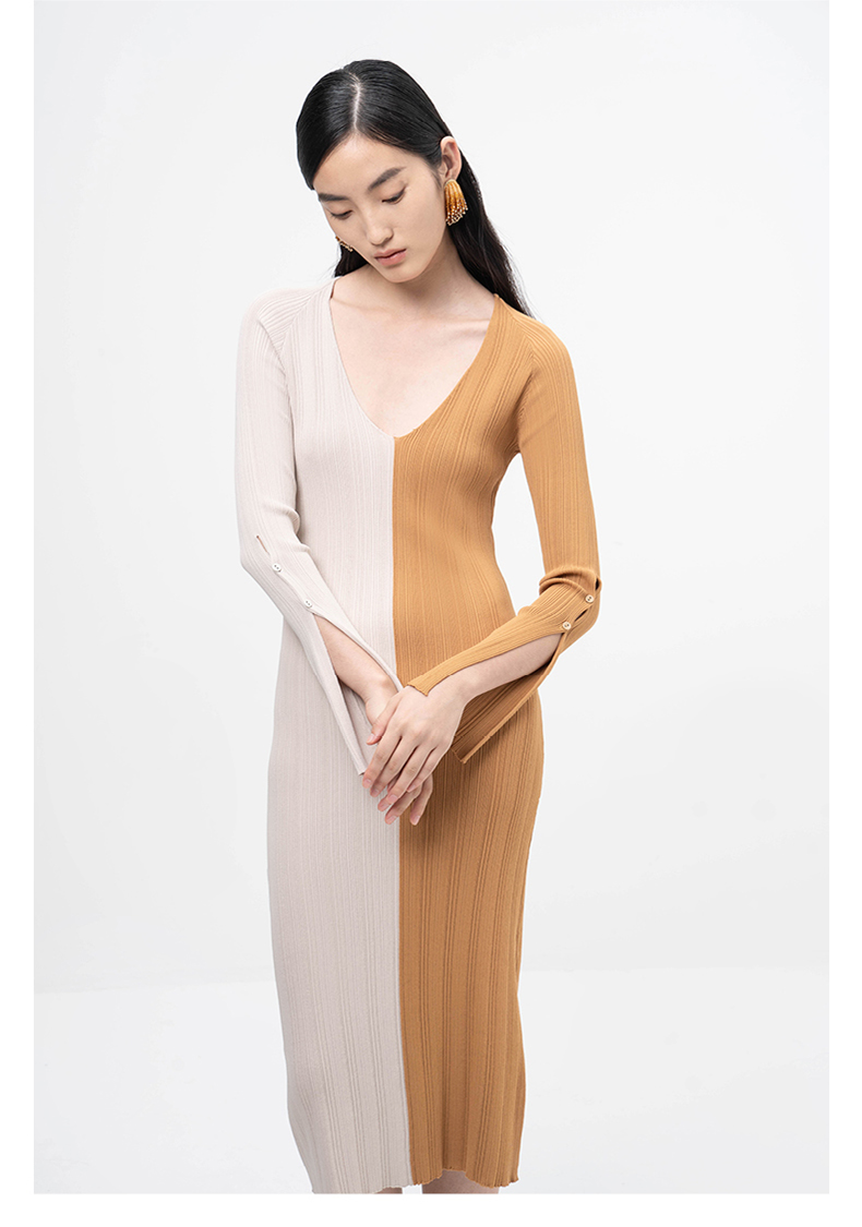 【分明姿态】直线分割藤黄拼色V领长袖针织连衣裙/202102A