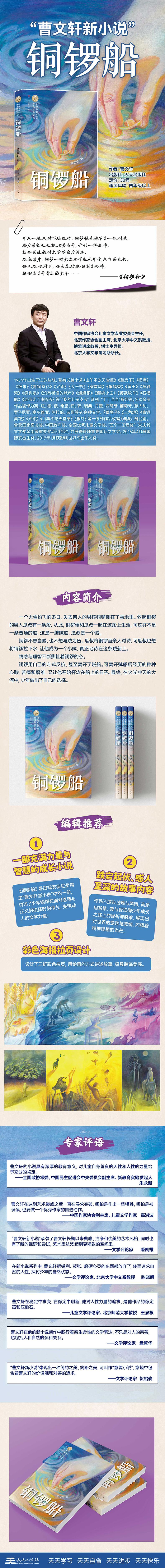 《铜锣船》是国际安徒生奖得主“曹文轩新小说”中的一册,讲述了少年铜锣在面对恩情与正义的抉择时的挣扎,充满动人的文学力量; 作品不渲染苦难与黑暗,而是用智慧、美与爱抵御少年成长之路上的挫折与磨难,展现出对世界的宽容与悲悯,闪耀着精神理想的光芒; 《铜锣船》设计了三折彩色拉页,用绘画的方式讲述故事,极具装饰美感。