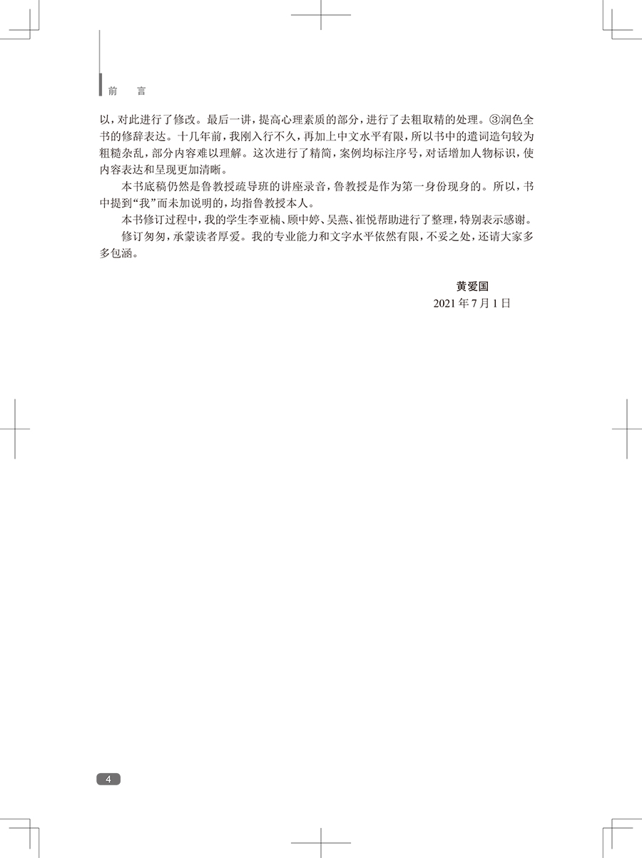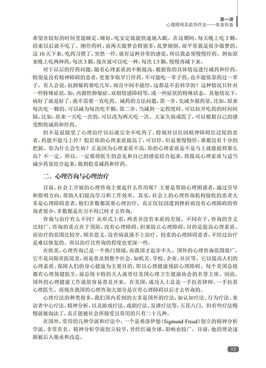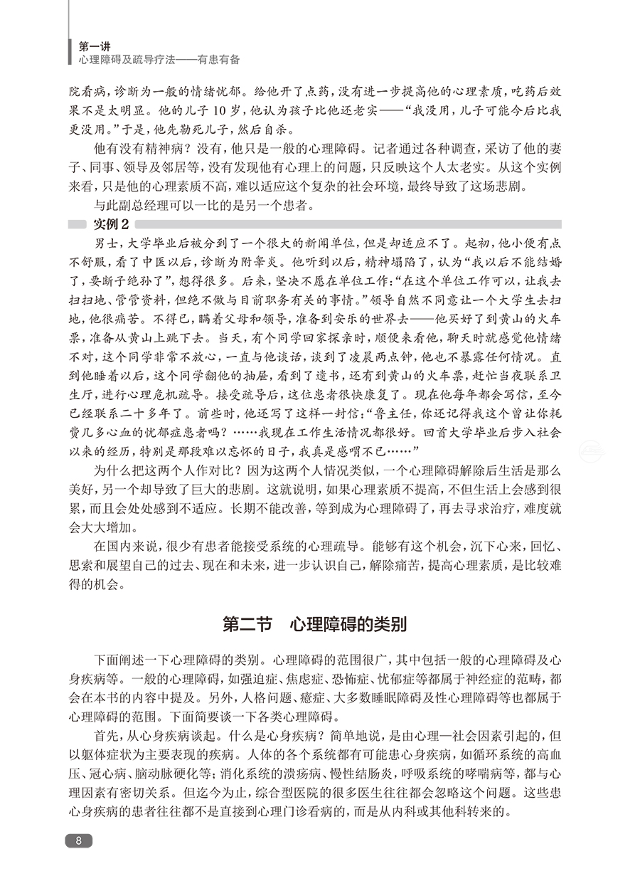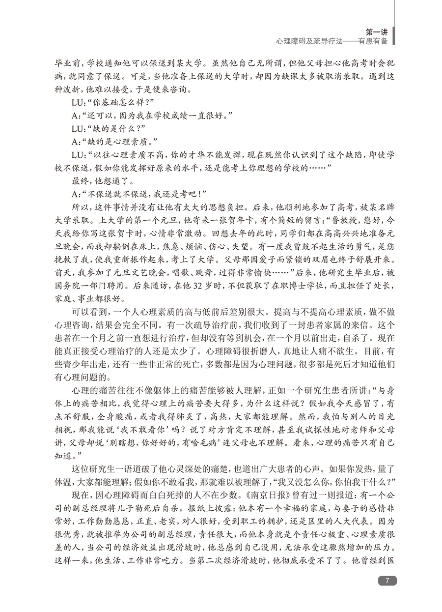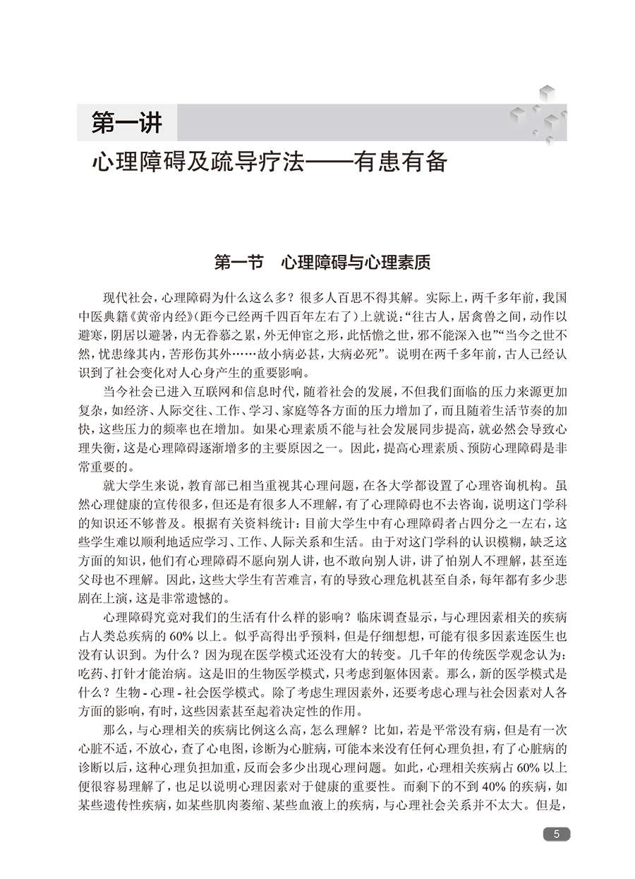 随着社会发展,心理障碍日多,而我国的临床心理工作远未普及。帮助广大的心理障碍者摆脱心理痛苦,也帮助心理困惑者提高心理素质,预防心理障碍,任务艰巨。本书*一版印刷5次,深得广大患者、家属的好评,是系统进行自我心理疏导的专业书籍。全书蓝本为鲁龙光教授进行团体心理疏导治疗的现场实况录音,这是他五十余年临床心理工作经验的结晶。黄爱国老师增加了数万字的内容,使其更具作性。这本书给读者的感觉,就像在团体心理疏导治疗的现场一样,阅读之后,再完成布置的任务,相当于经历了一次系统的自我疏导过程。心理疏导疗法有很多固定读者,*一版不再印刷后,近几年,网络上出现各种盗版的版本,说明本书还是有比较大的市场需求的。