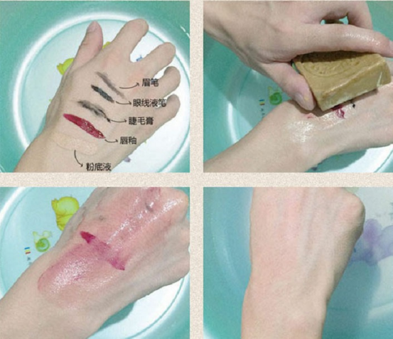 很多女生肯定很关心它的卸妆能力, 虽然它不是一款专业卸妆产品,我们也做了一个小小的测试。 而且洗完之后手没有其他皂那样又干又涩的感觉, 就像涂了护手霜一样,保湿也不错。