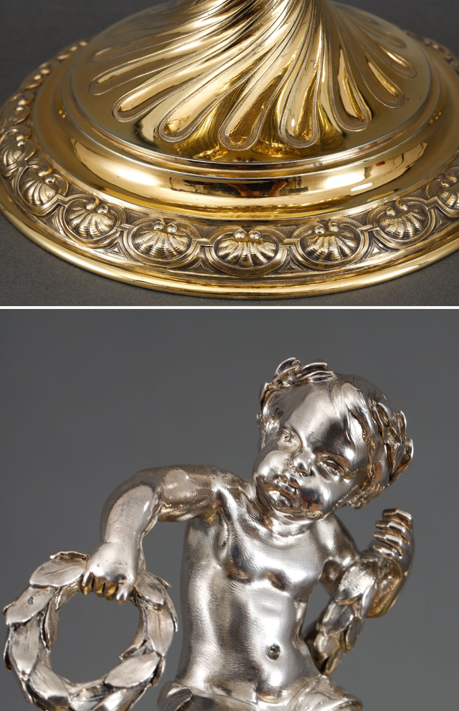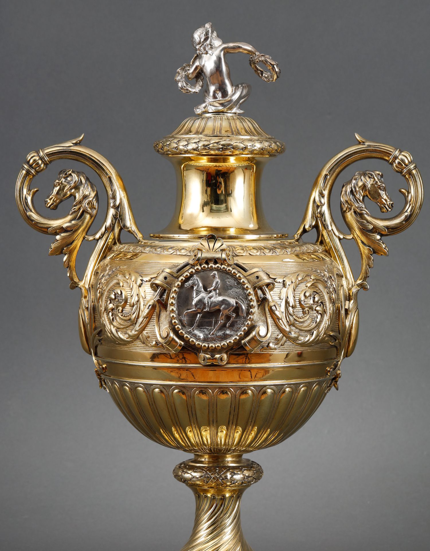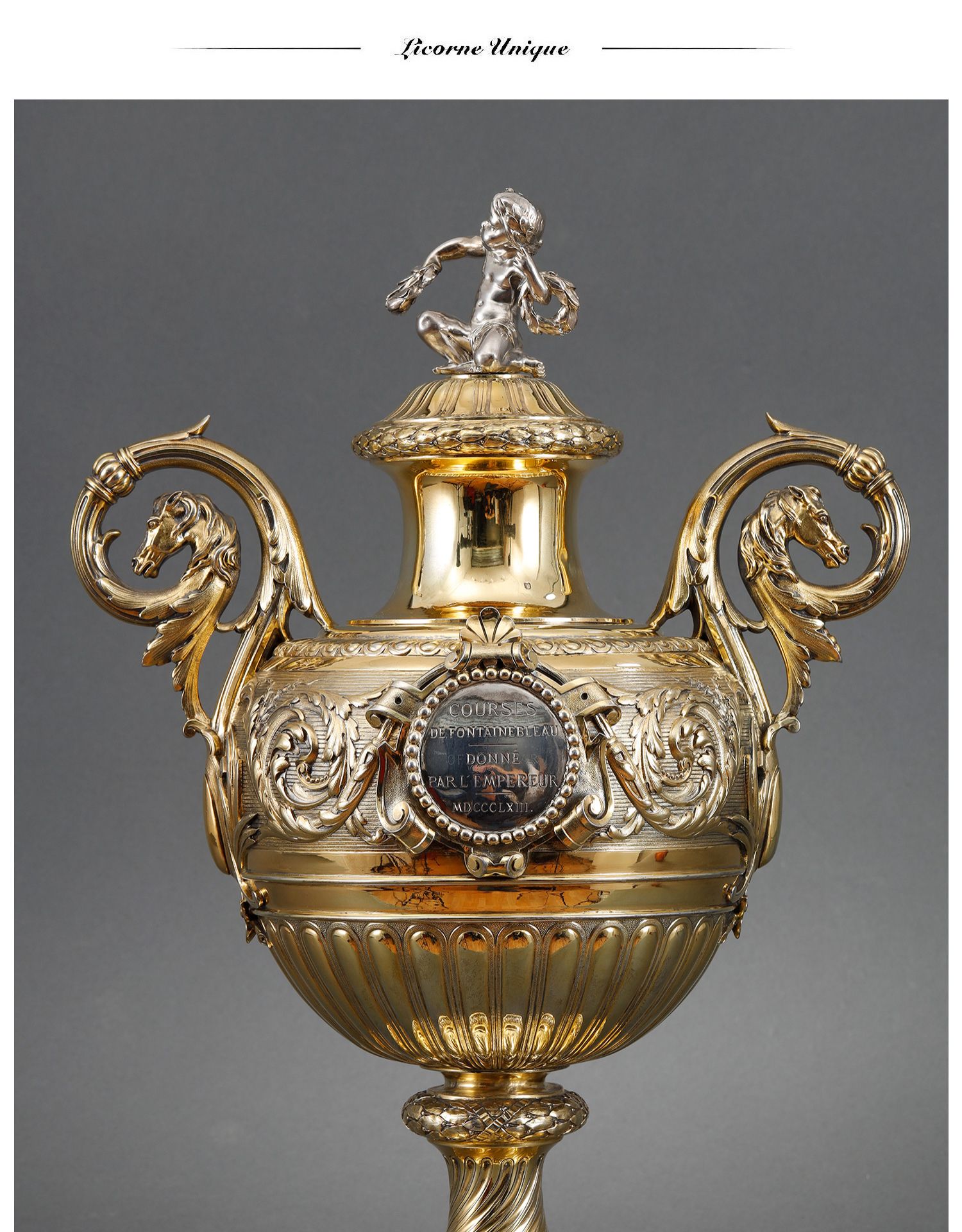 独角鹿西洋古董DUPONCHEL签名月桂小天使纯银镀金双耳式纪念奖杯