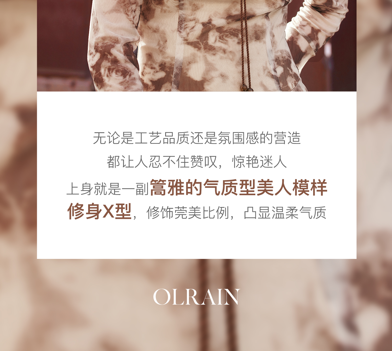 - “精致”是欧芮儿olrain品牌文化的核心,欧芮儿认为,精致的女人,不但要外在动人,更要内在迷人,内外兼修,有魅力、有气质、有内涵,自信而不自傲,优雅而不矫揉,自有万种风情而不轻浮,更不故作矜持。