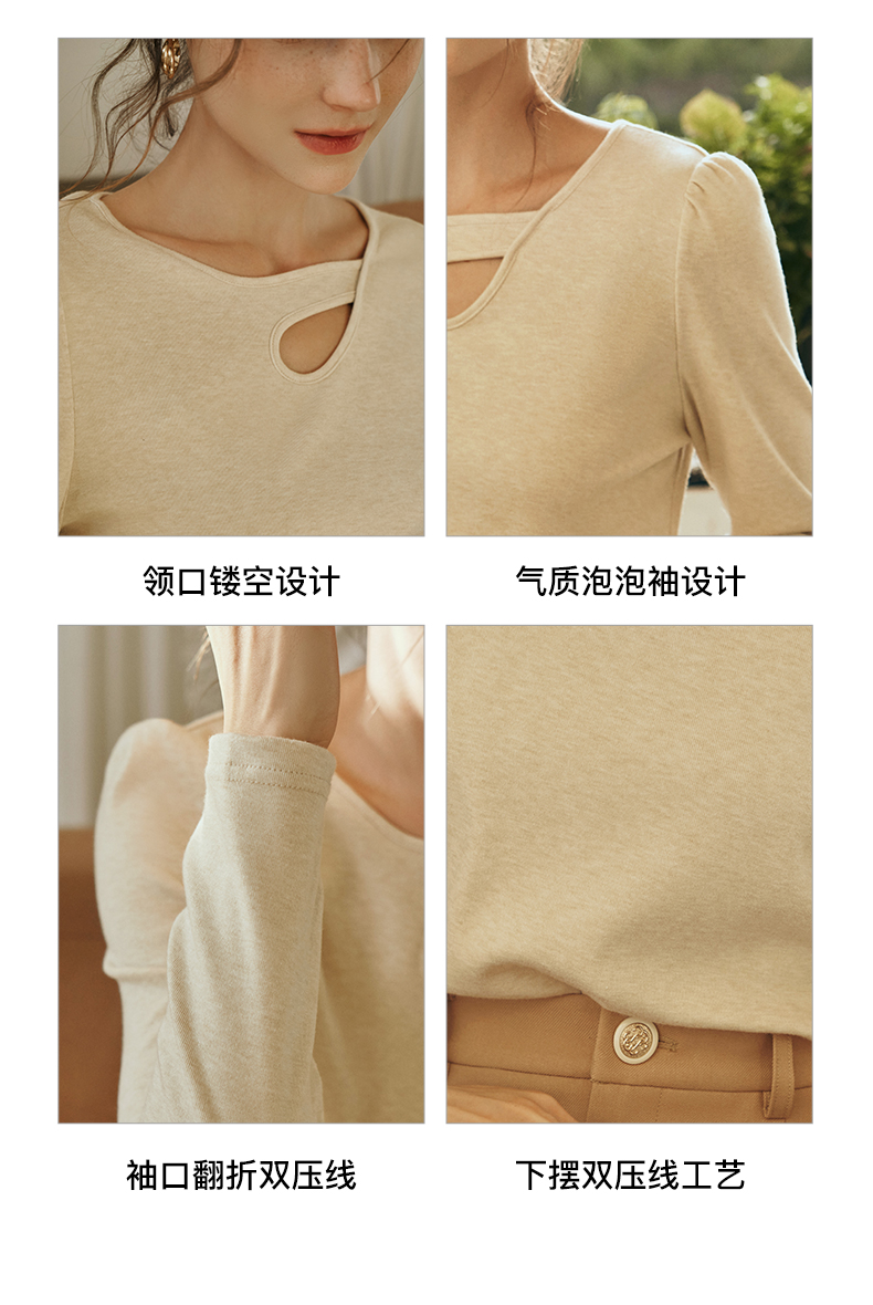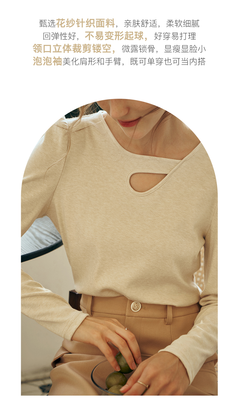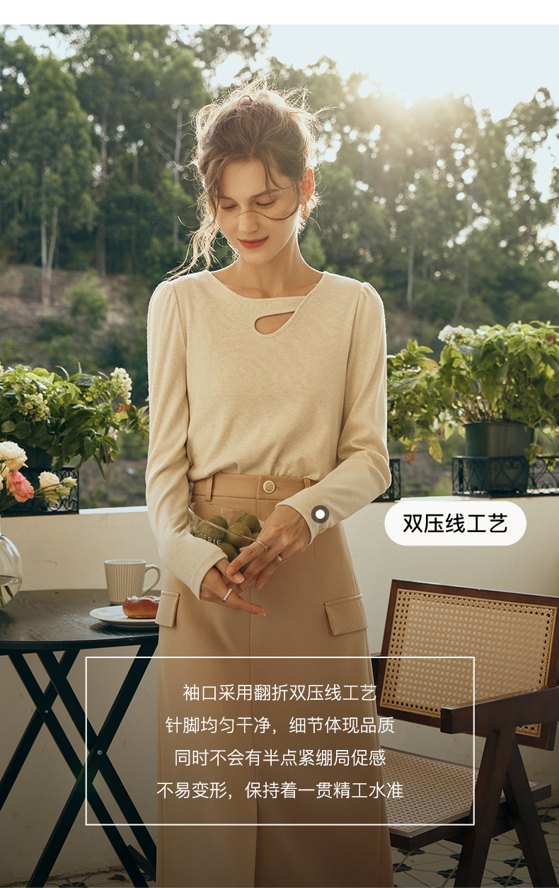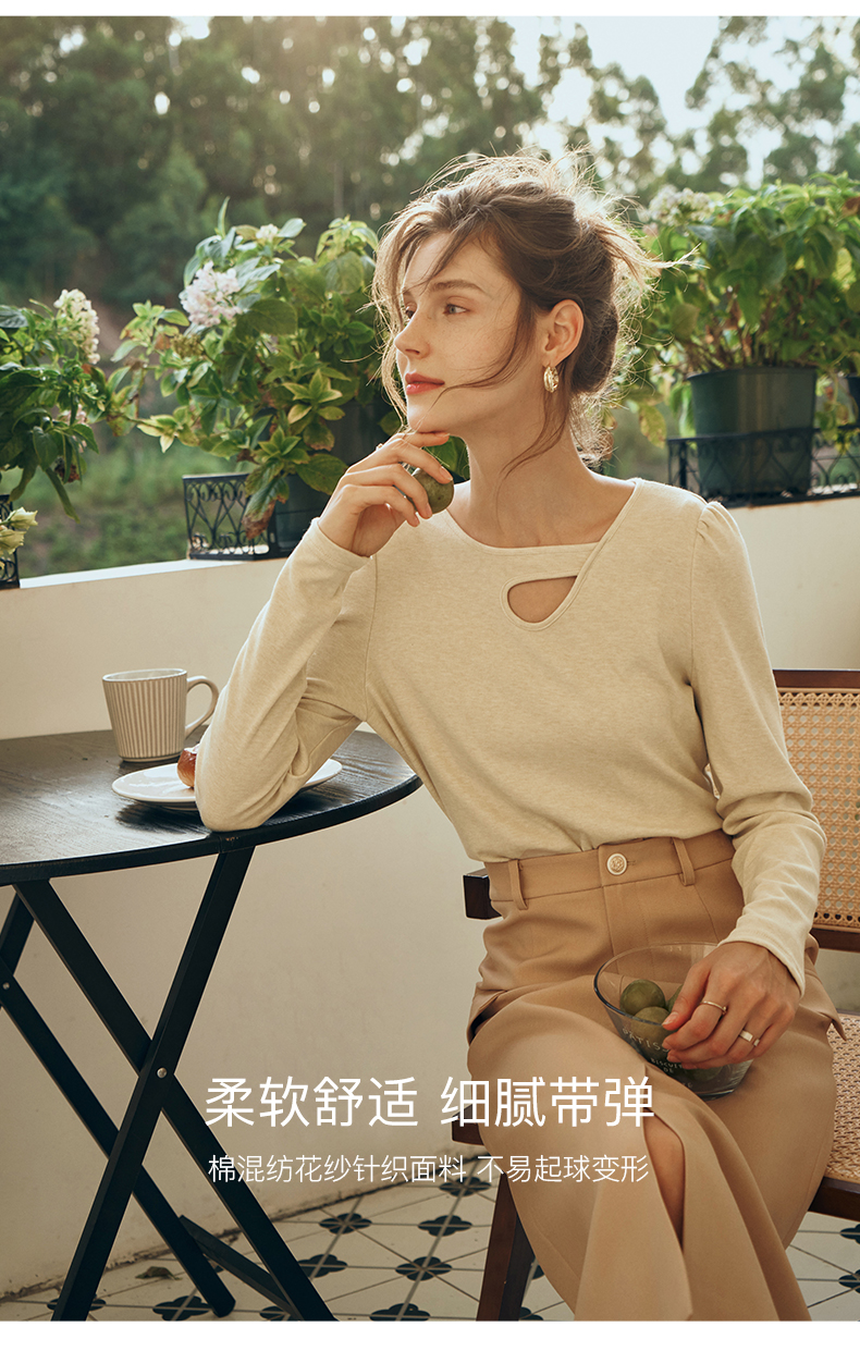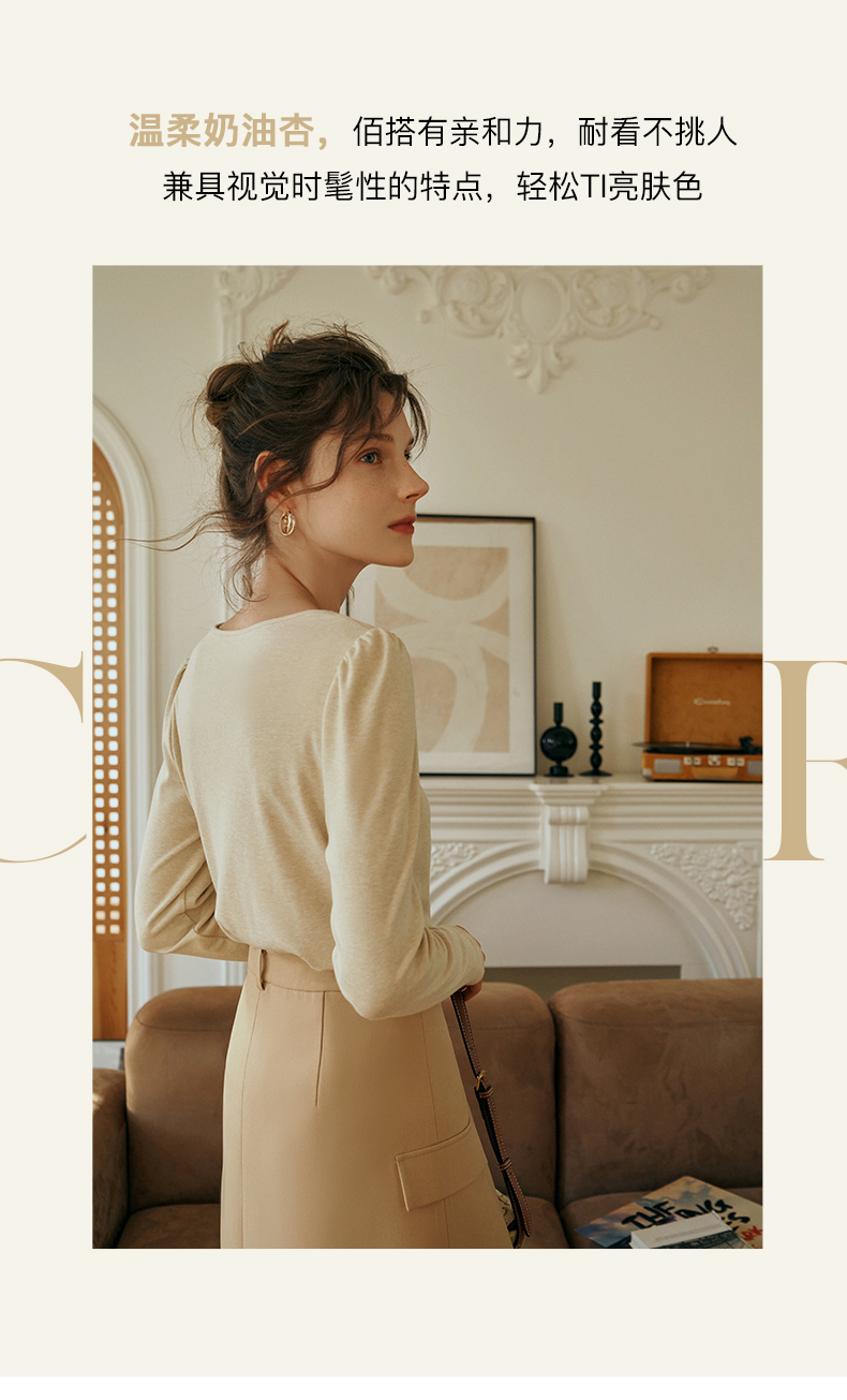 OLrain欧芮儿奶油杏长袖T恤女秋季2023新款修身泡泡袖内搭打底衫