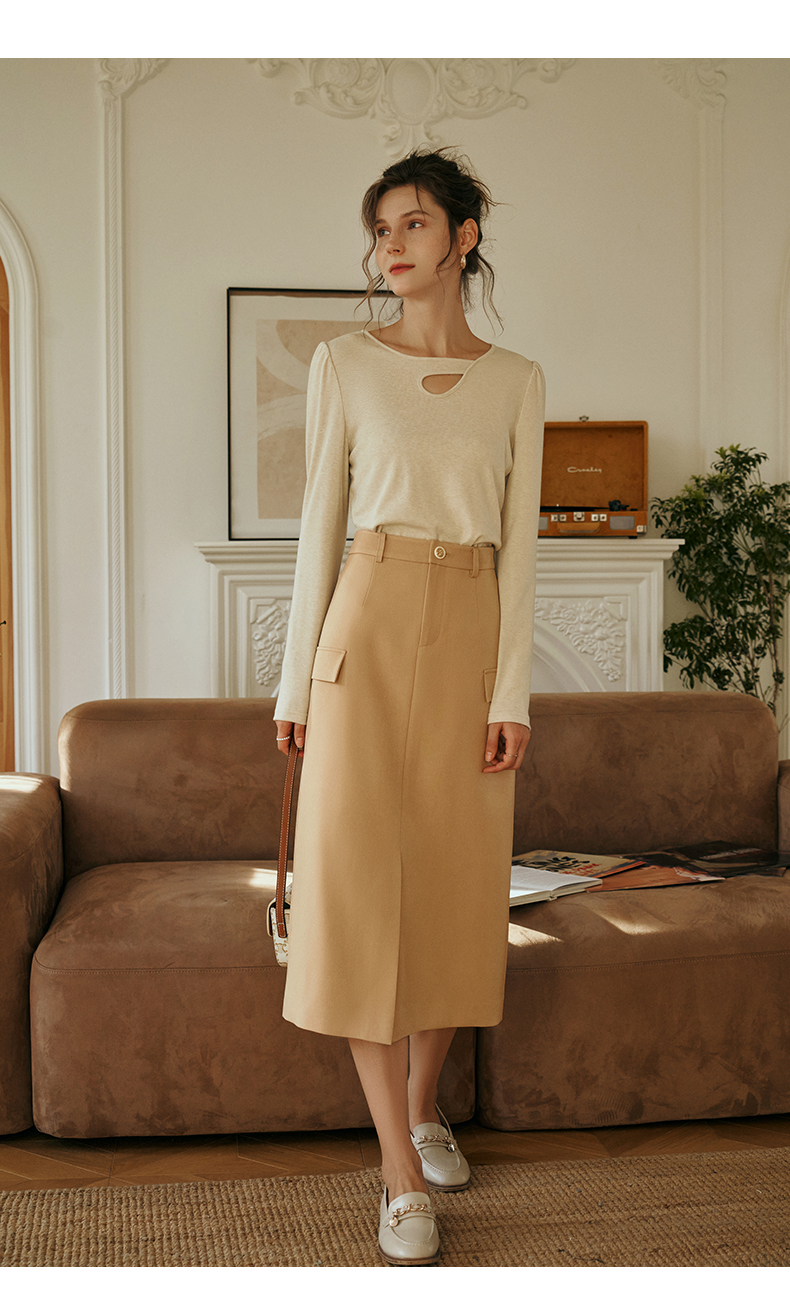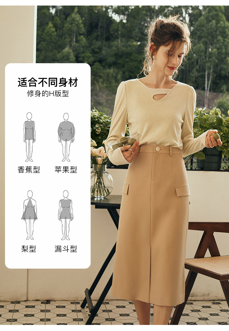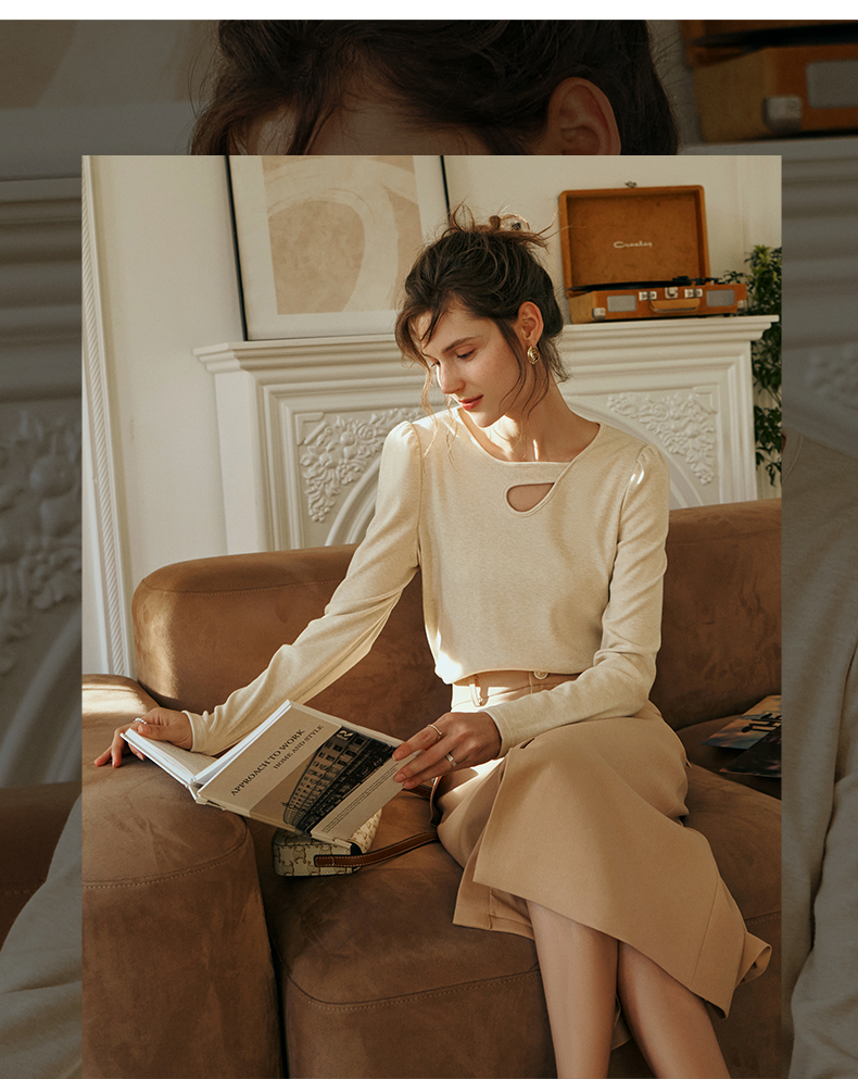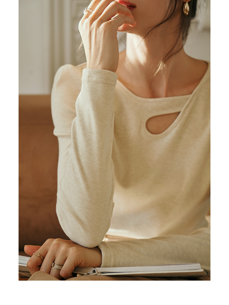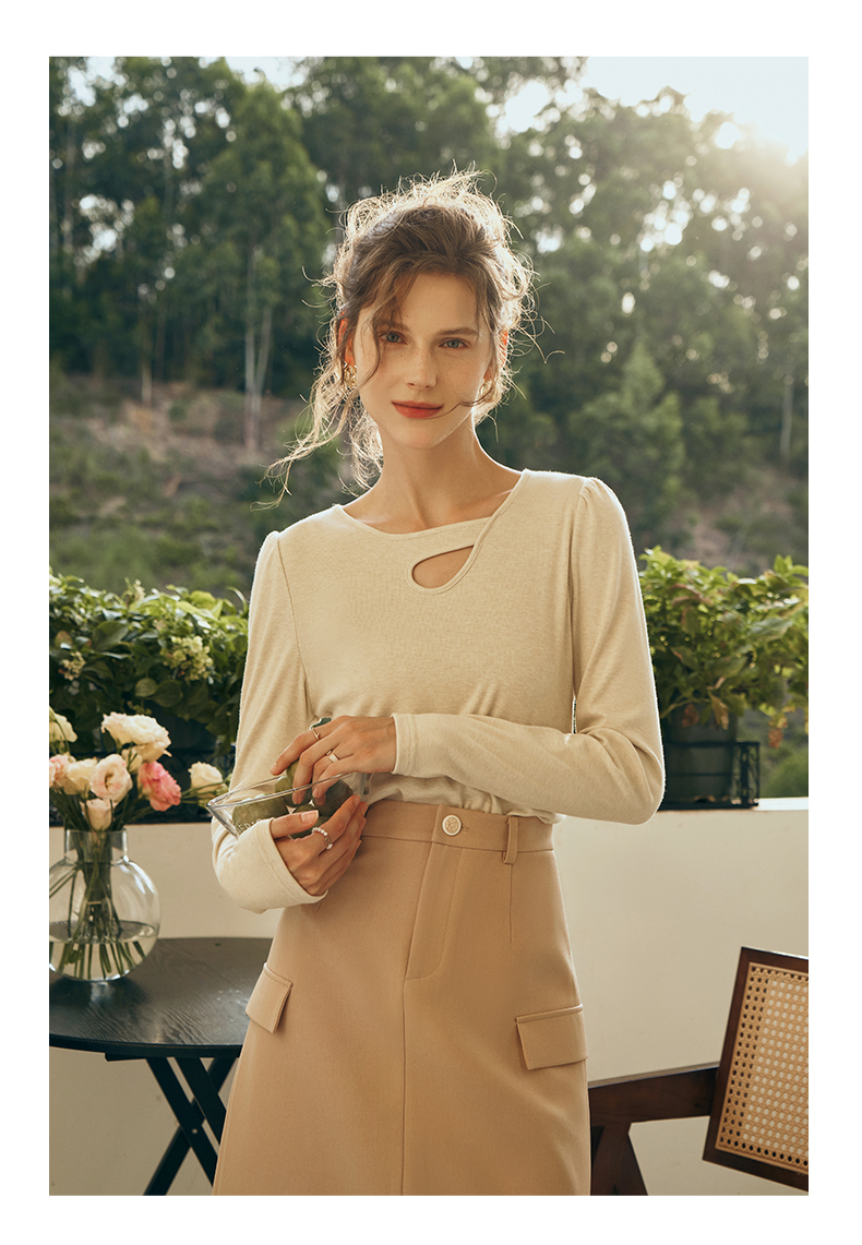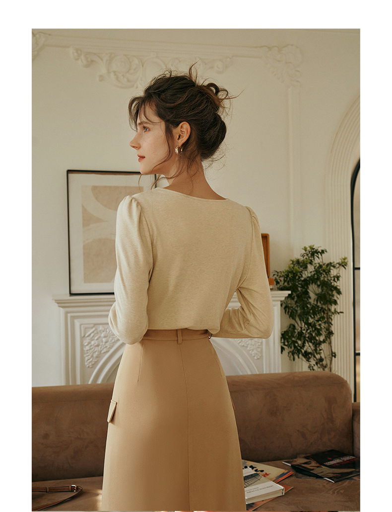 OLrain欧芮儿奶油杏长袖T恤女秋季2023新款修身泡泡袖内搭打底衫
