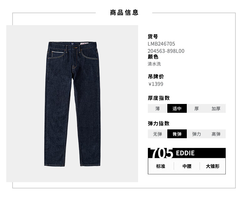 LEE【郑业成同款】新品705标准锥形清水洗男牛仔裤LMB246705204563