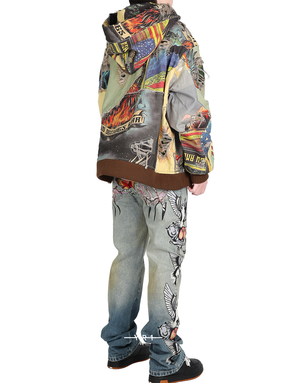 这款复古拉链外套,饰有原创的做旧、缝补拼接和染色工艺。这款外套版型宽松,略微短款