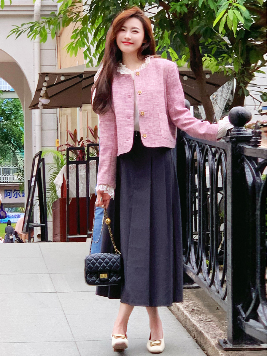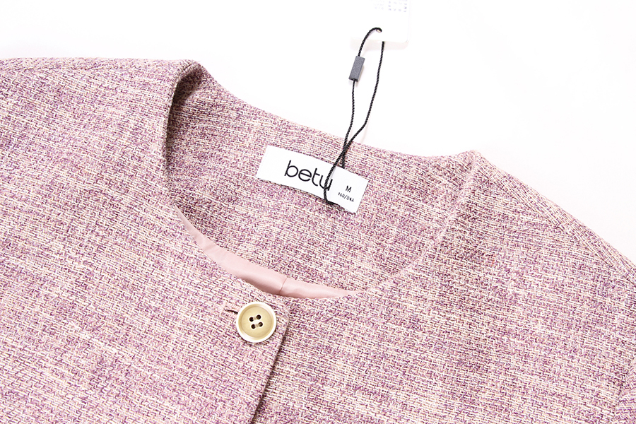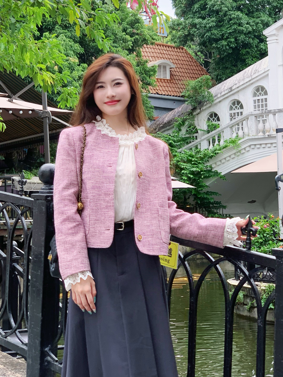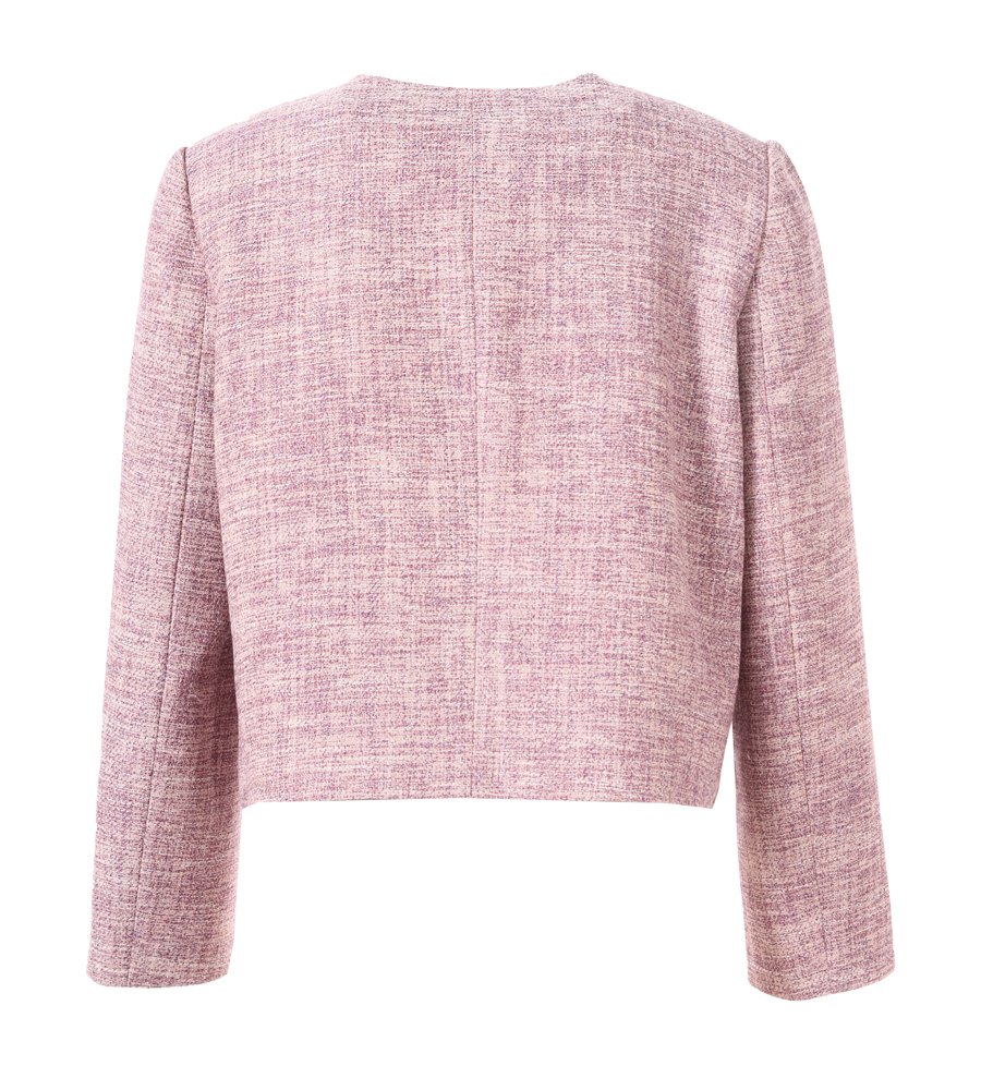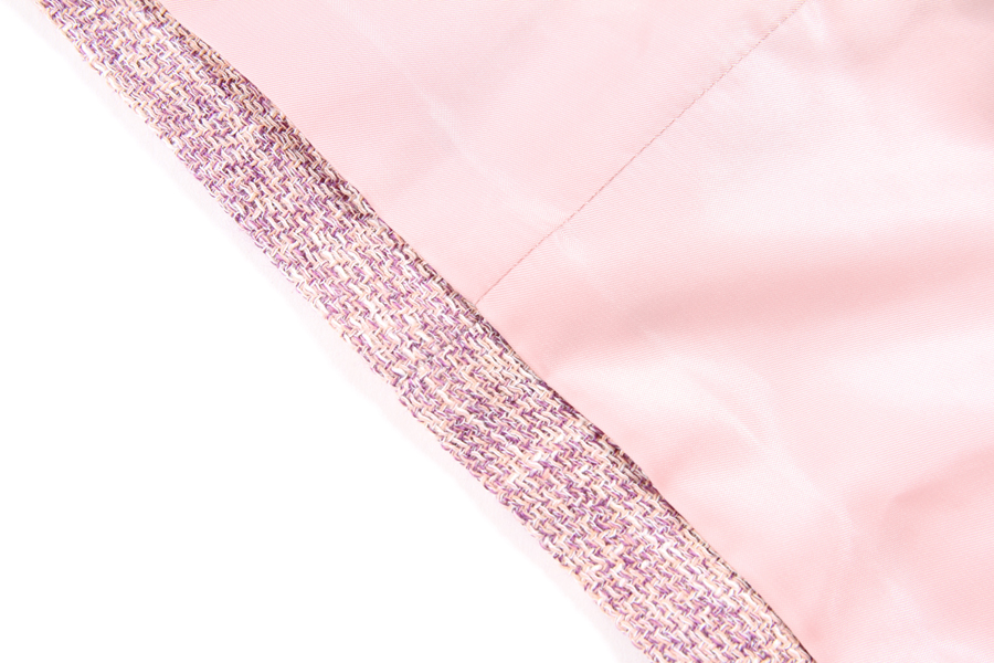粗花呢,是香风外套的不可或缺的灵魂,用到5种特种纱经纬编织,有一种凹凸有致,别致厚重的肌理感,同时采用经典的花纹,使面料高雅而又别致,成熟而又显气质。