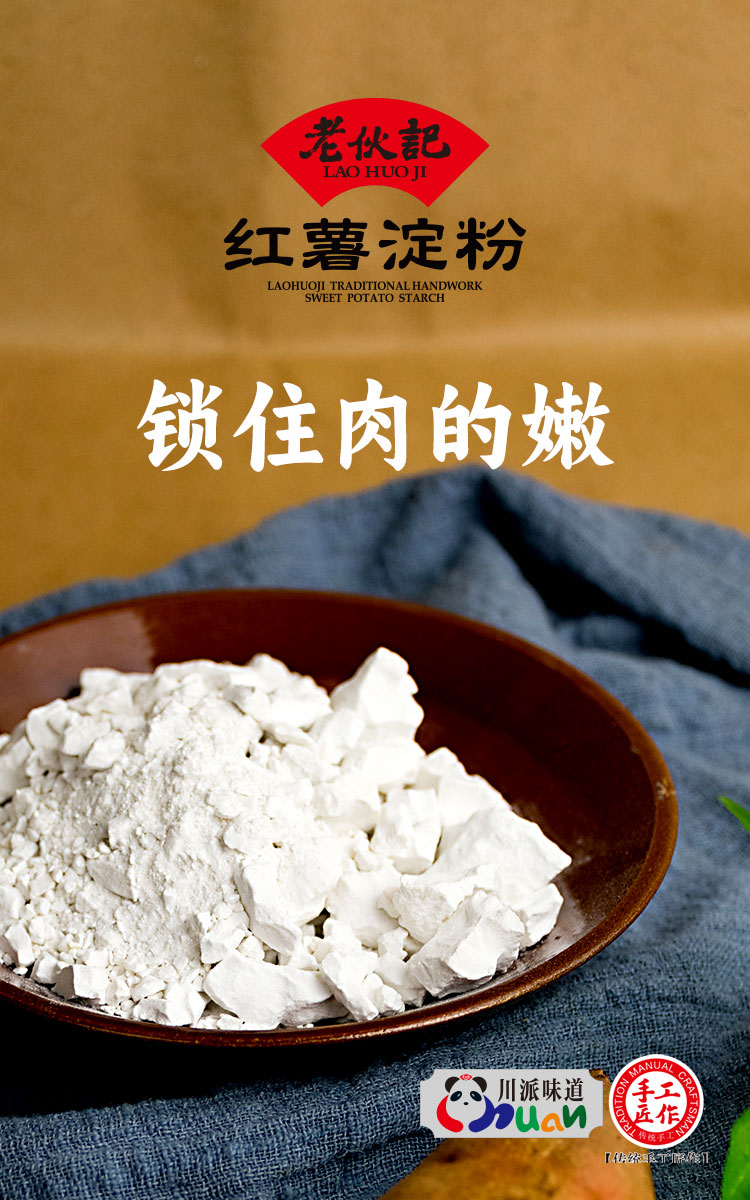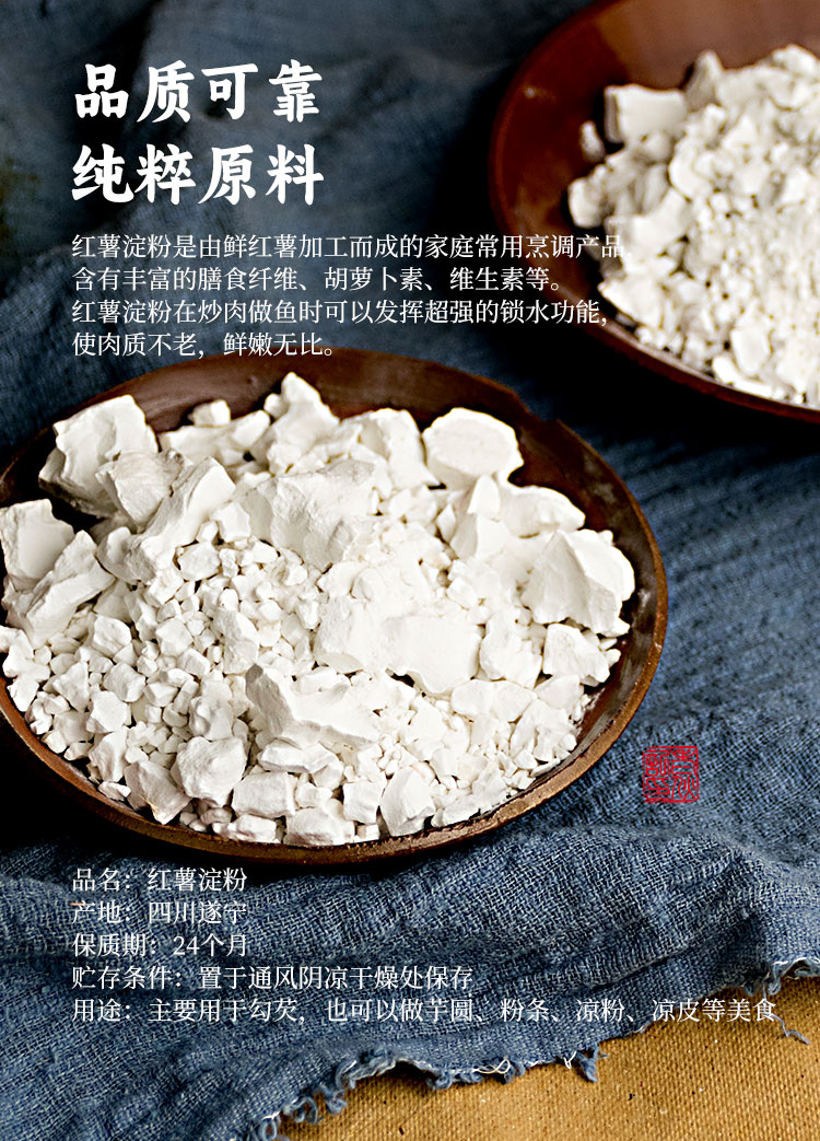 红薯淀粉是由鲜红薯加工而成的家庭常用烹调产品,含丰富的膳食纤维、胡萝卜素、维生素等,红薯淀粉在炒肉做鱼时可以发挥超强的锁水功能,使肉质不老,鲜嫩无比。